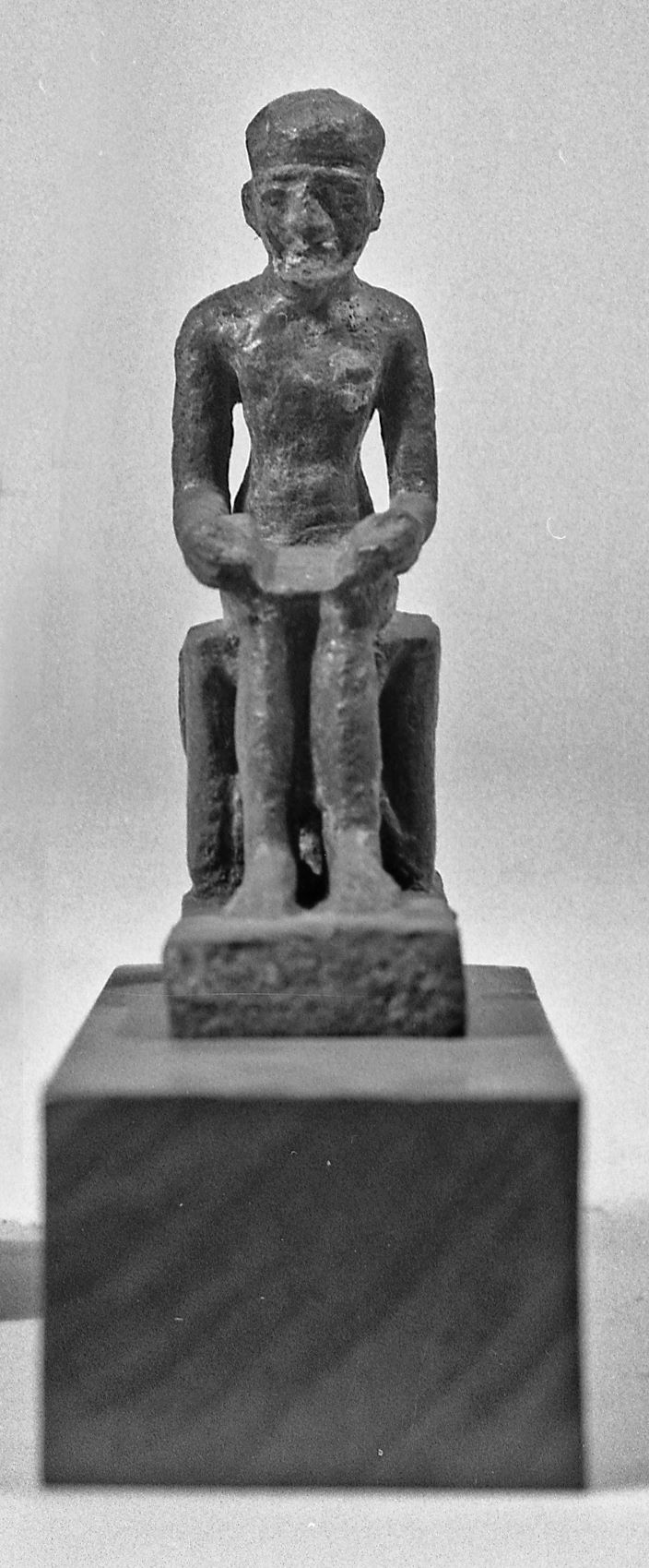 Figure of Imhotep, seated with an open papyrus scroll on his lap. Imhotep is depicted wearing a skullcap. The arms rest along the body, and the hands holding a papyrus scroll on his lap. Imhotep wears a shendyt kilt decorated with vertical lines. He sits on a decorated stool, adorned on three sides with a stylised vegetal motif, which itself rests on a rectangular base. The base seems to be inscribed on at least three sides. Inside the throne and the base there is some material, probably identifiable as remains of the casting mould. A tenon of almost circular section projects down from the back side of the base. The object is made in the lost-wax technique for solid casts.
