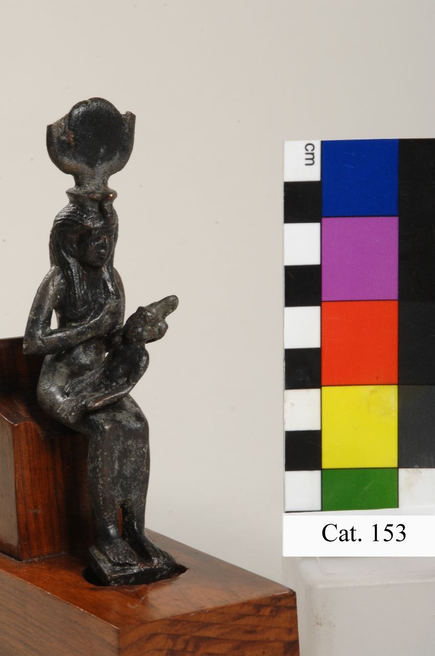 Seated figure of Isis suckling Harpocrates (identifiable with the so-called ‘Isis lactans’ motif). The goddess is wearing a hathoric crown, consisting of a solar disc with cow horns resting on a stylised uraeiform modius. She is wearing a tripartite wig decorated with the uraeus and an ankle-length, tight-fitting dress. Isis brings her right hand to her left breast, while her left hand holds Harpocrates’ head. A broken circular tenon is present under the buttocks. The goddess’ knees and muscles of the calves are slightly indicated. The feet rest on a trapezoidal base from which a circular tenon projects down. The god Harpocrates is sitting on Isis’ lap. The god is depicted naked, wearing the double crown and side-lock on the right side of the head, which ends with a curl on the right shoulder. Harpocrates has his arms at sides with hands open, the palms facing down. The legs are together, and the lower part is broken. The object is made in the lost-wax technique for solid casts.