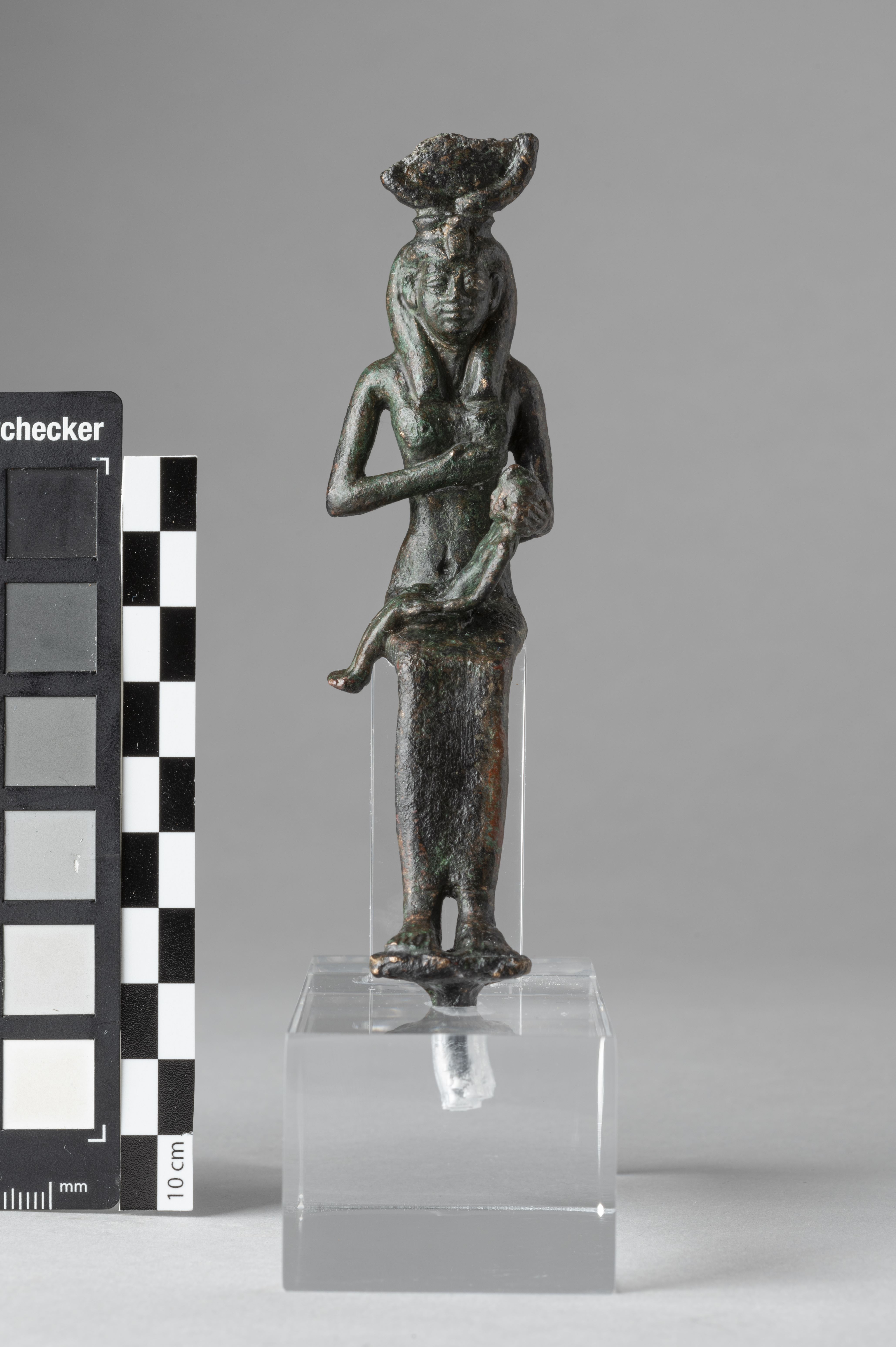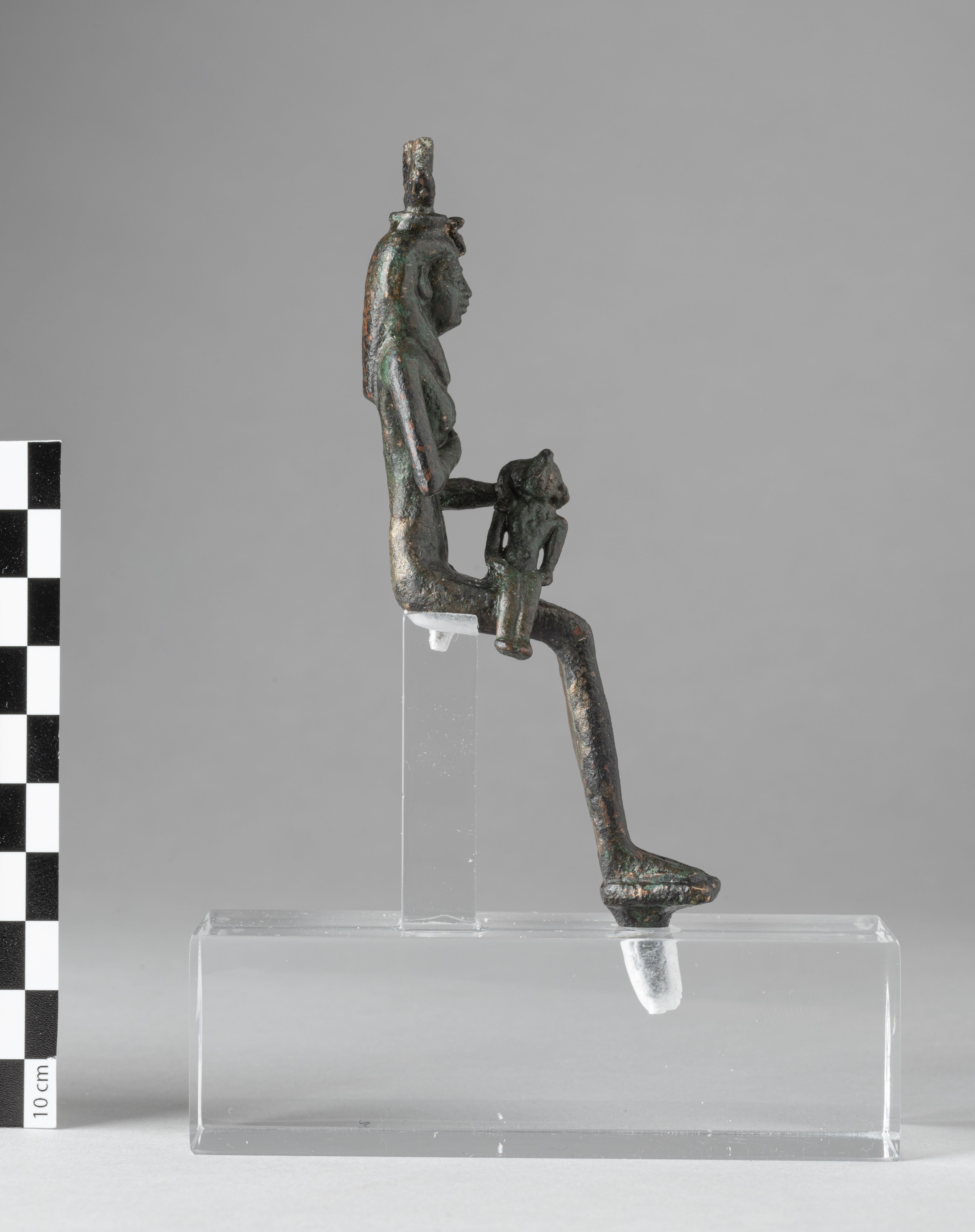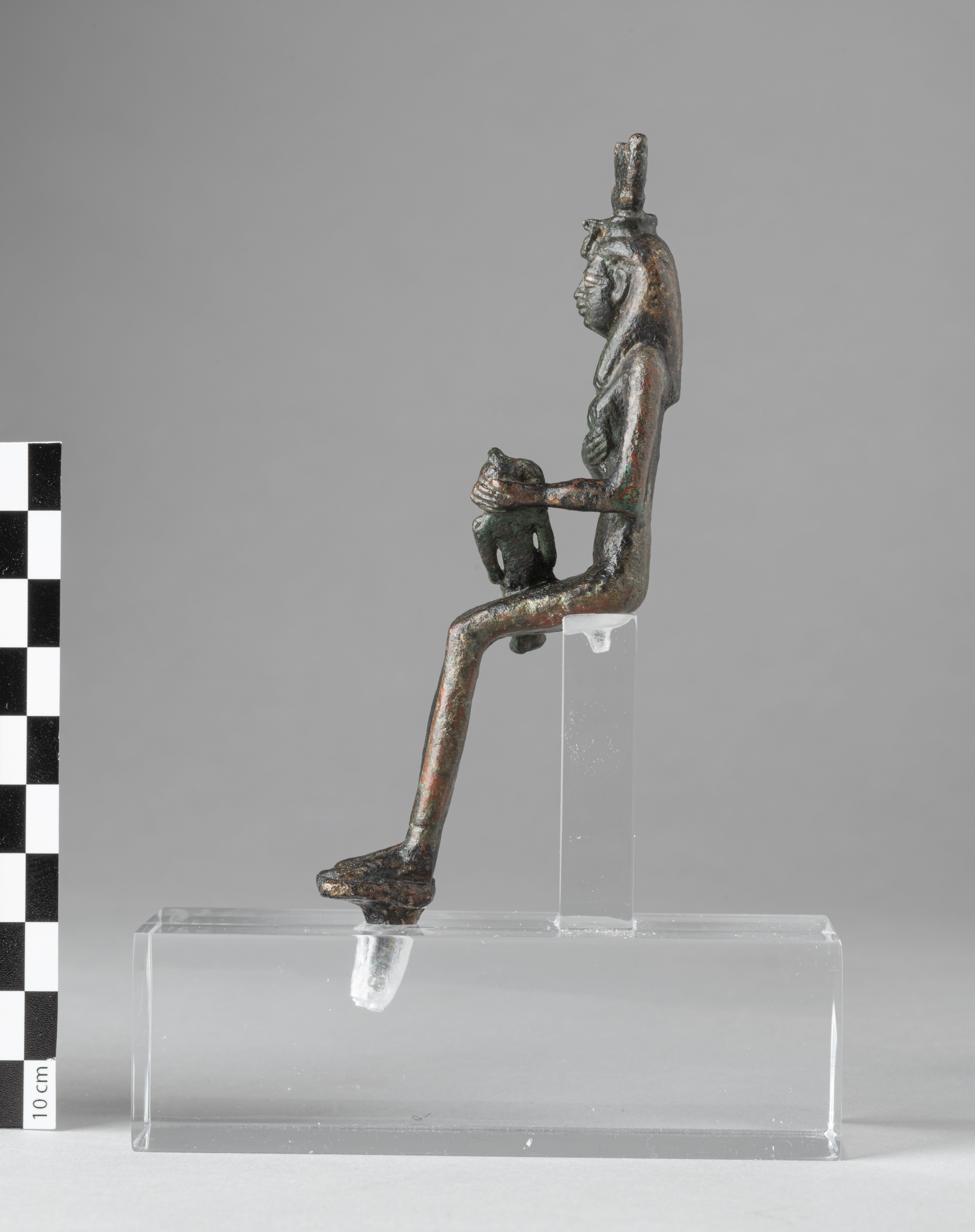 Seated figure of Isis suckling Harpocrates (identifiable with the so-called ‘Isis lactans’ motif). The goddess is wearing a hathoric crown and a tripartite wig with a stylised vulture head. The goddess is wearing an ankle-lenght, tight-fitting dress. She brings her right hand to her left breast, while her left hand holds Harpocrates’ head. Under the buttocks there is a small broken circular tenon. The feet rest on a thin trapezoidal base. From the base, a circular tenon projects down. The god Harpocrates is sitting on Isis’ lap. The god is depicted naked, with the side-lock on the right side of the head, which ends with a curl on the right shoulder and wearing a skullcap decorated with a stylised uraeus. The god has his arms at sides with hands open, the palms facing down. The object is made in the lost-wax technique for solid casts.