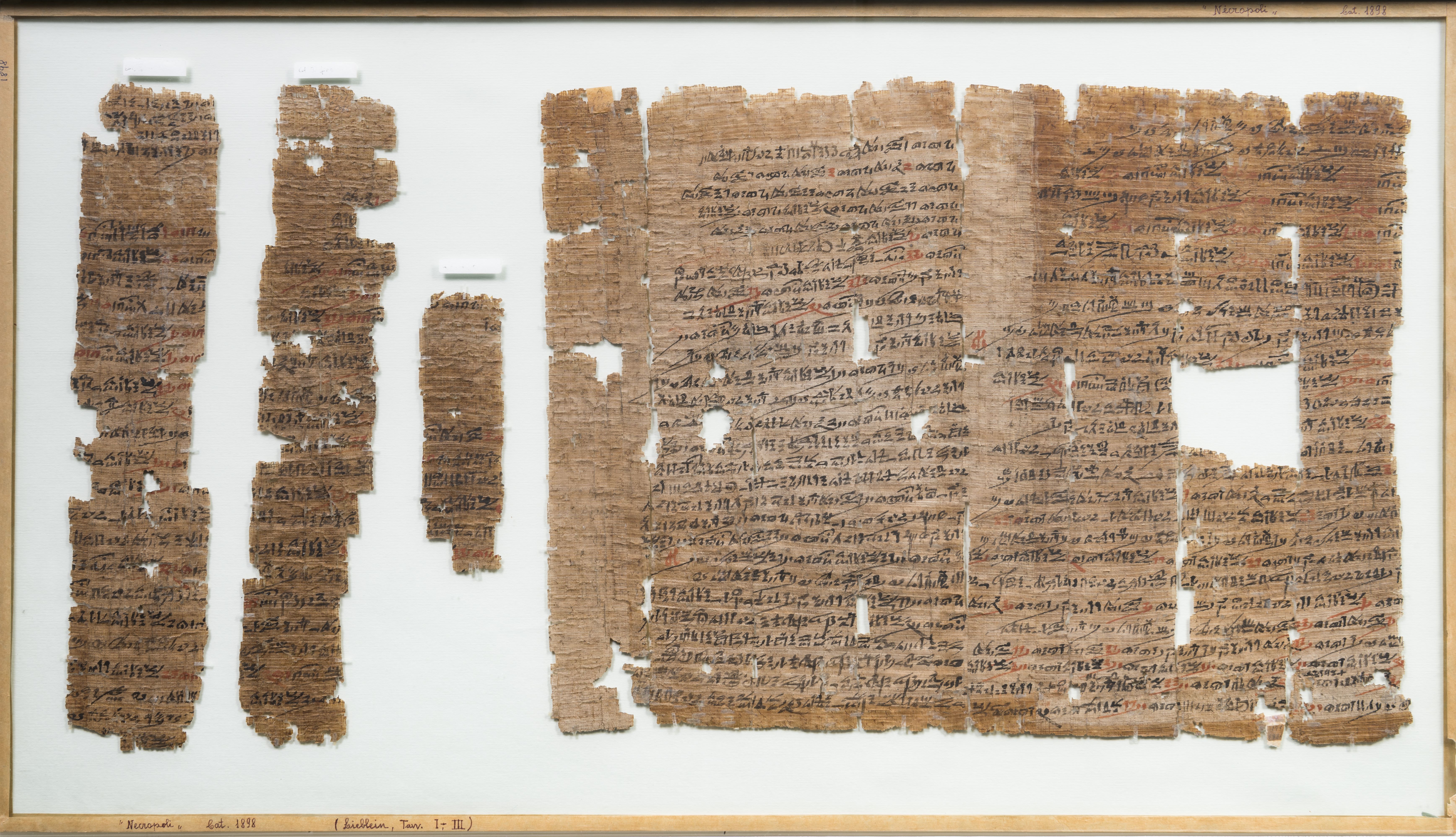This papyrus contains portion of the journal of the Necropolis, which is the daily report on the progress of work in the royal tomb in the Valley of the Kings, and of events concerning the community of the workmen. The part displayed here records the main events that occurred during the short reign of Ramesses X, at the end of the New Kingdom.