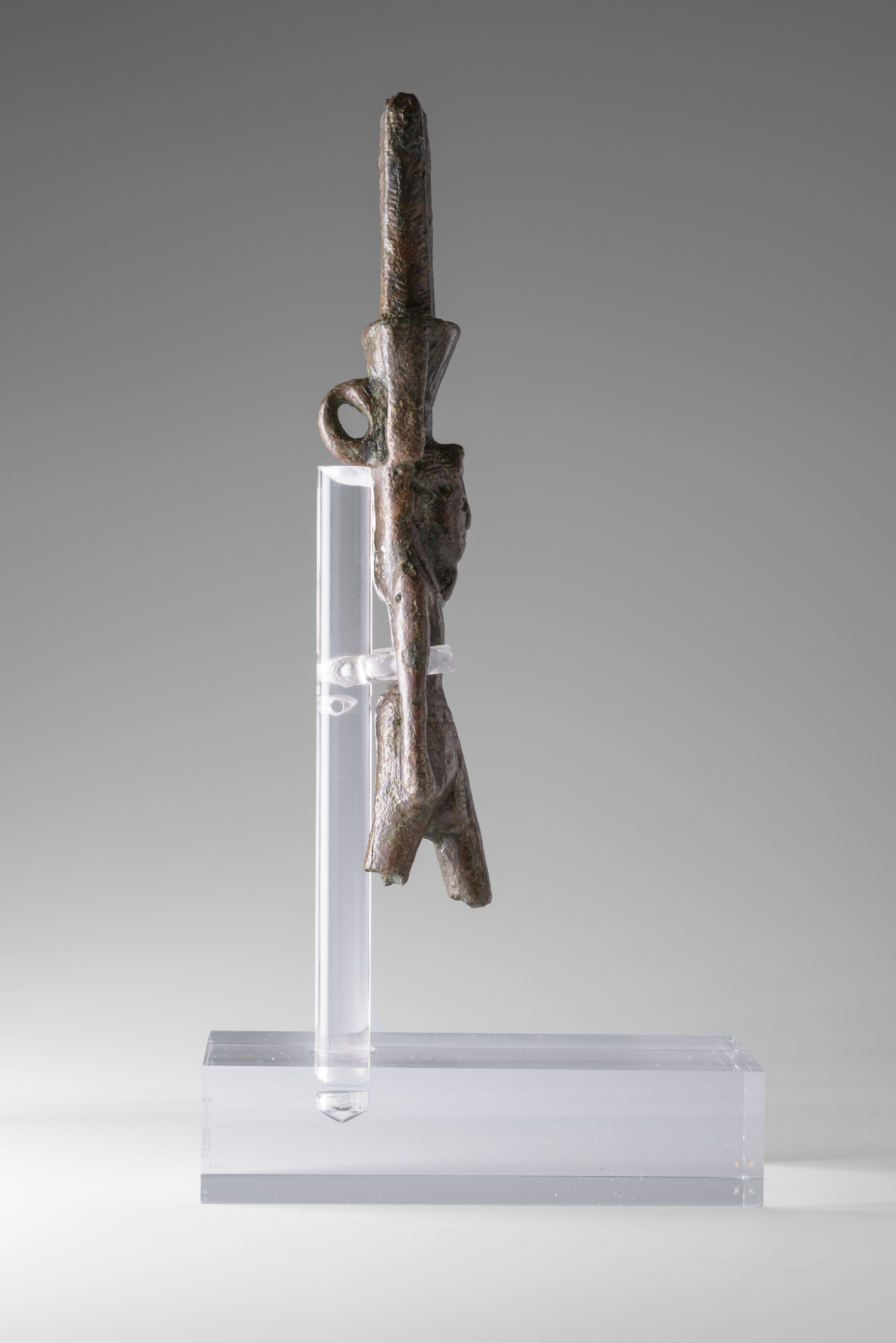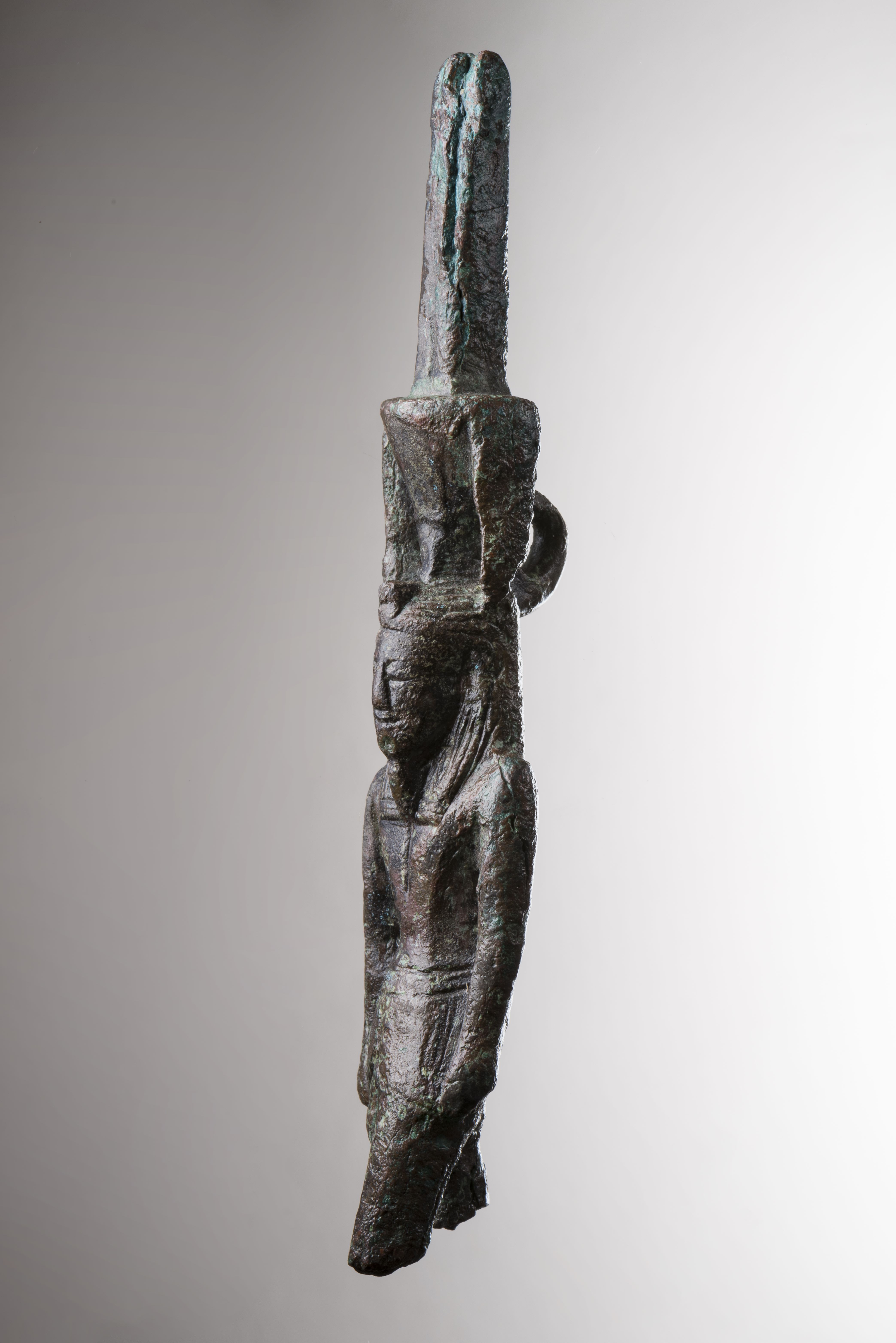 Standing figure of Nefertem, striding with left leg forward. The god is wearing a headdress composed of a lotus blossom flanked by two bronze elements, probably identifiable as menat counterpoises (a hathoric symbol of fertility) and surmounted by two tall plumes. There is a suspension loop on the back, between the crown and the head. Nefertem has a tripartite wig equipped with a uraeus. The god has a false beard and wears the shendyt kilt. Nefertem has his arms at sides, the hands are clenched into fists. The lower part of the legs is missing. The object is made in the lost-wax technique for solid casts.
