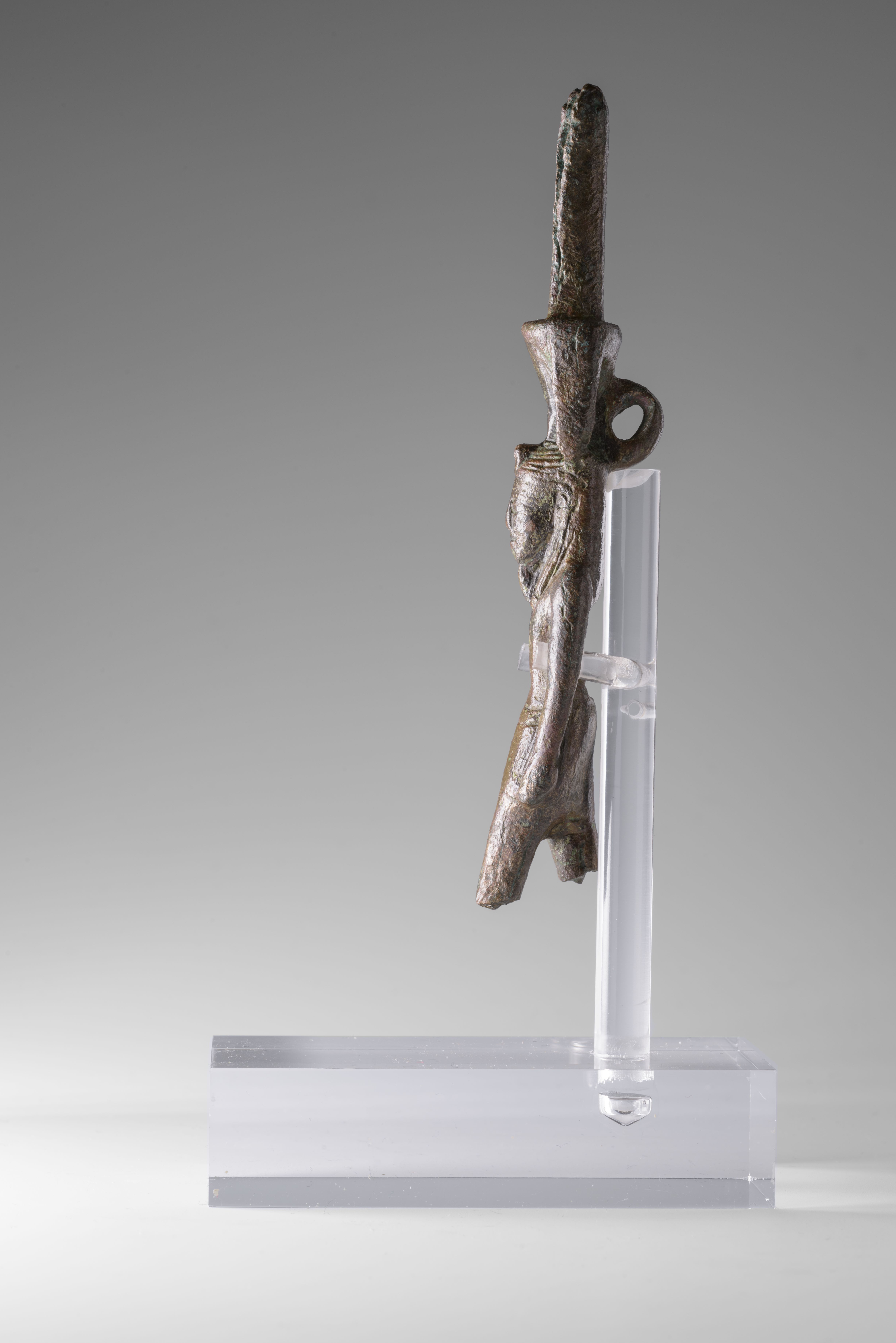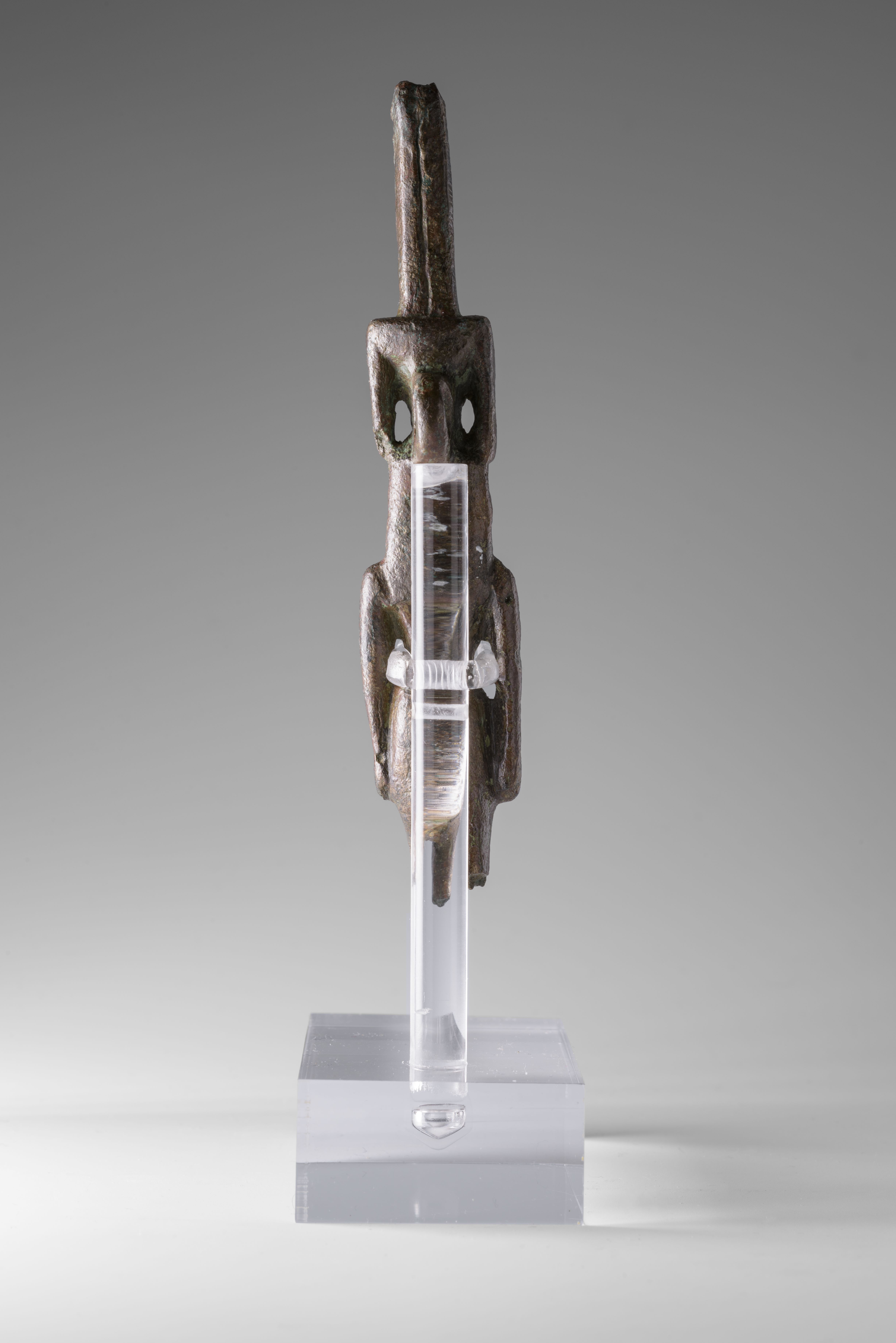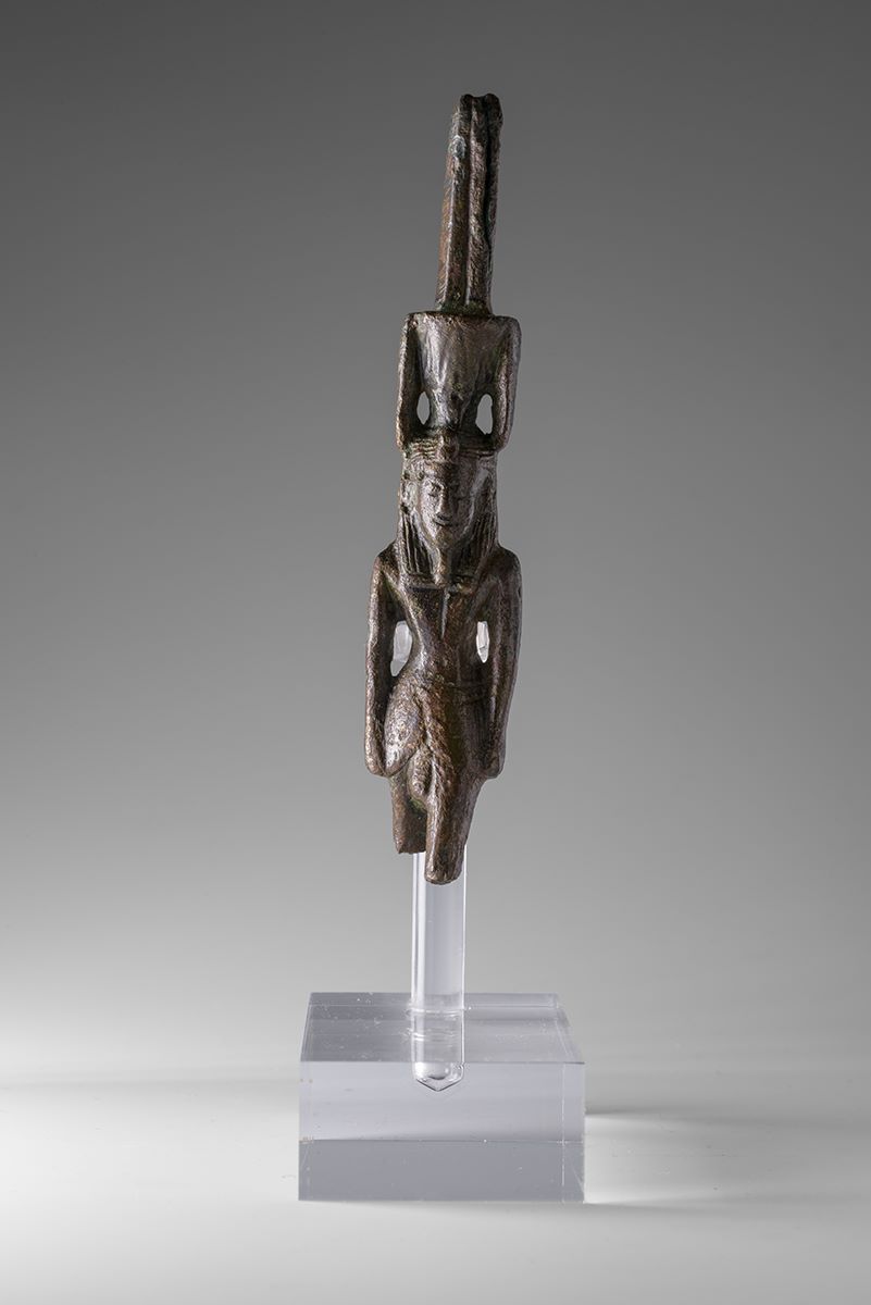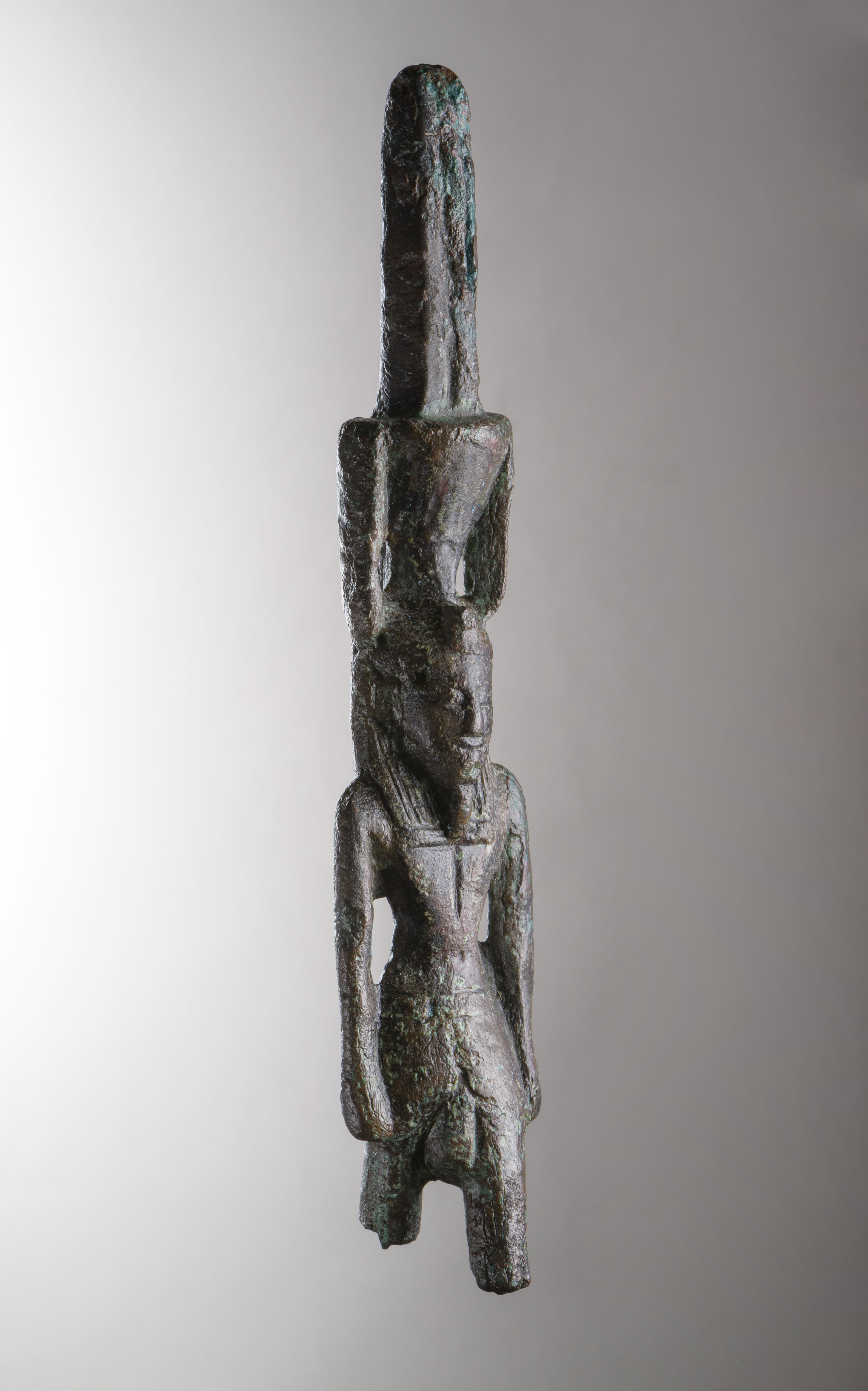 Standing figure of Nefertem, striding with left leg forward. The god is wearing a headdress composed of a lotus blossom flanked by two bronze elements, probably identifiable as menat counterpoises (a hathoric symbol of fertility) and surmounted by two tall plumes. There is a suspension loop on the back, between the crown and the head. Nefertem has a tripartite wig equipped with a uraeus. The god has a false beard and wears the shendyt kilt. Nefertem has his arms at sides, the hands are clenched into fists. The lower part of the legs is missing. The object is made in the lost-wax technique for solid casts.
