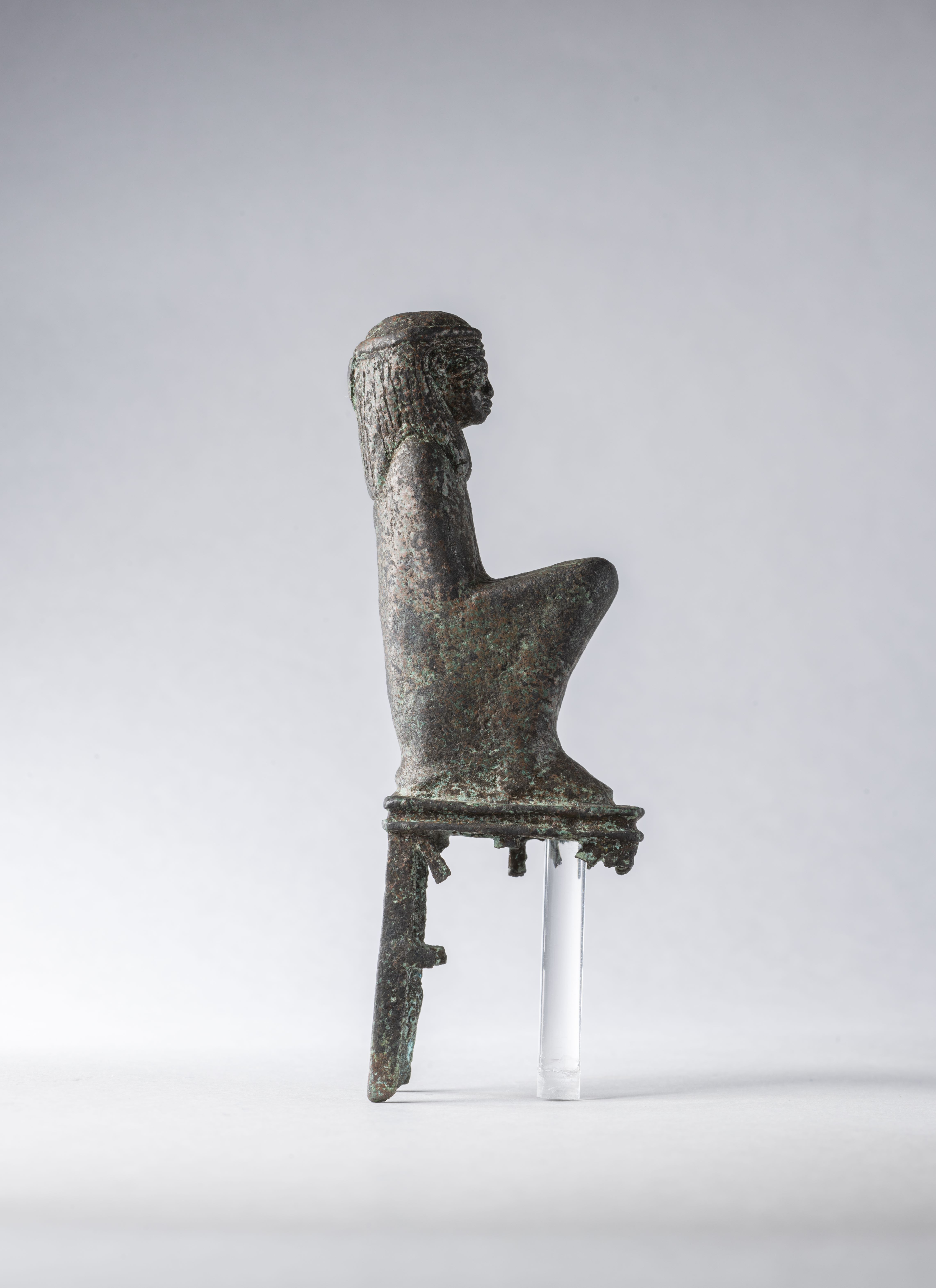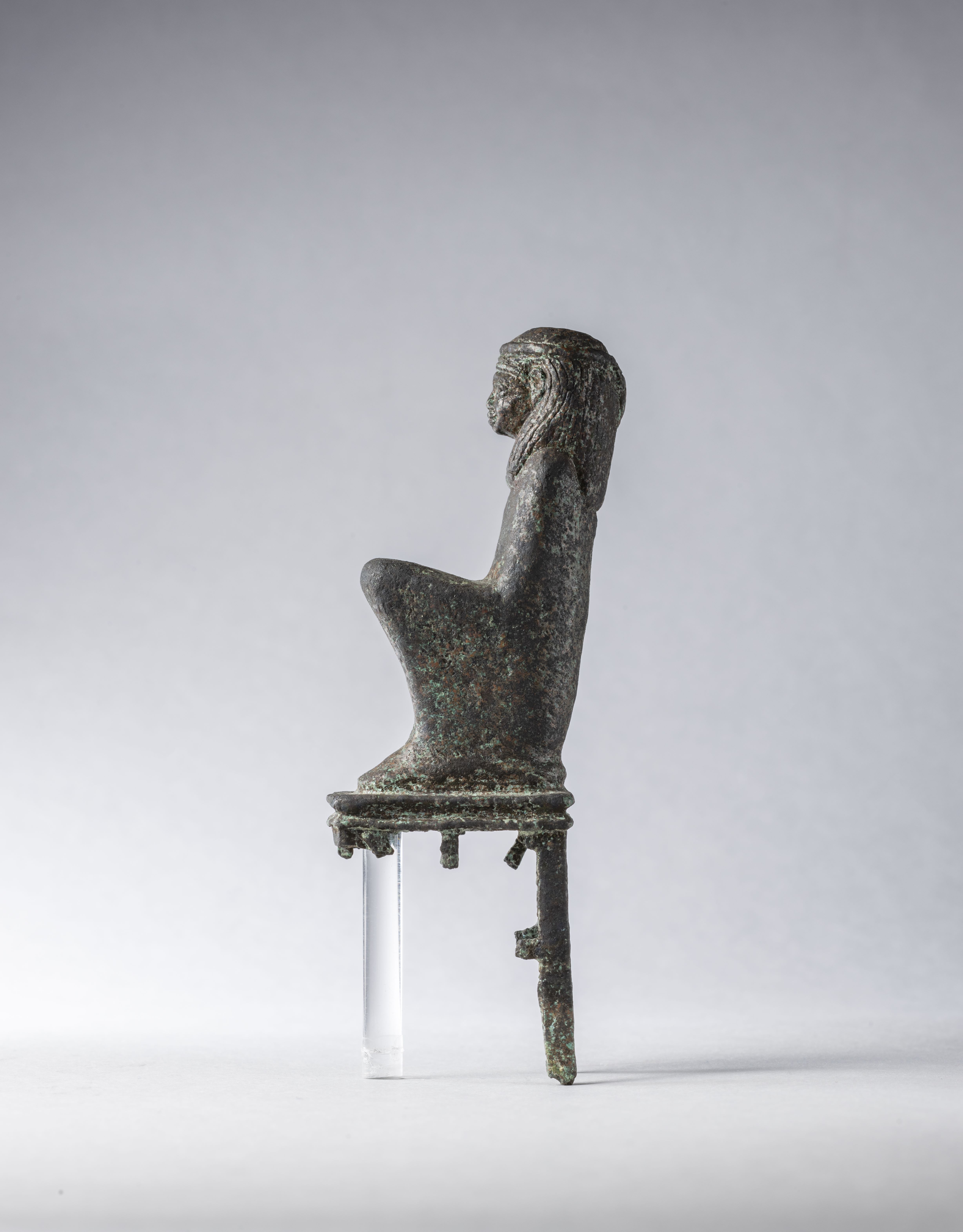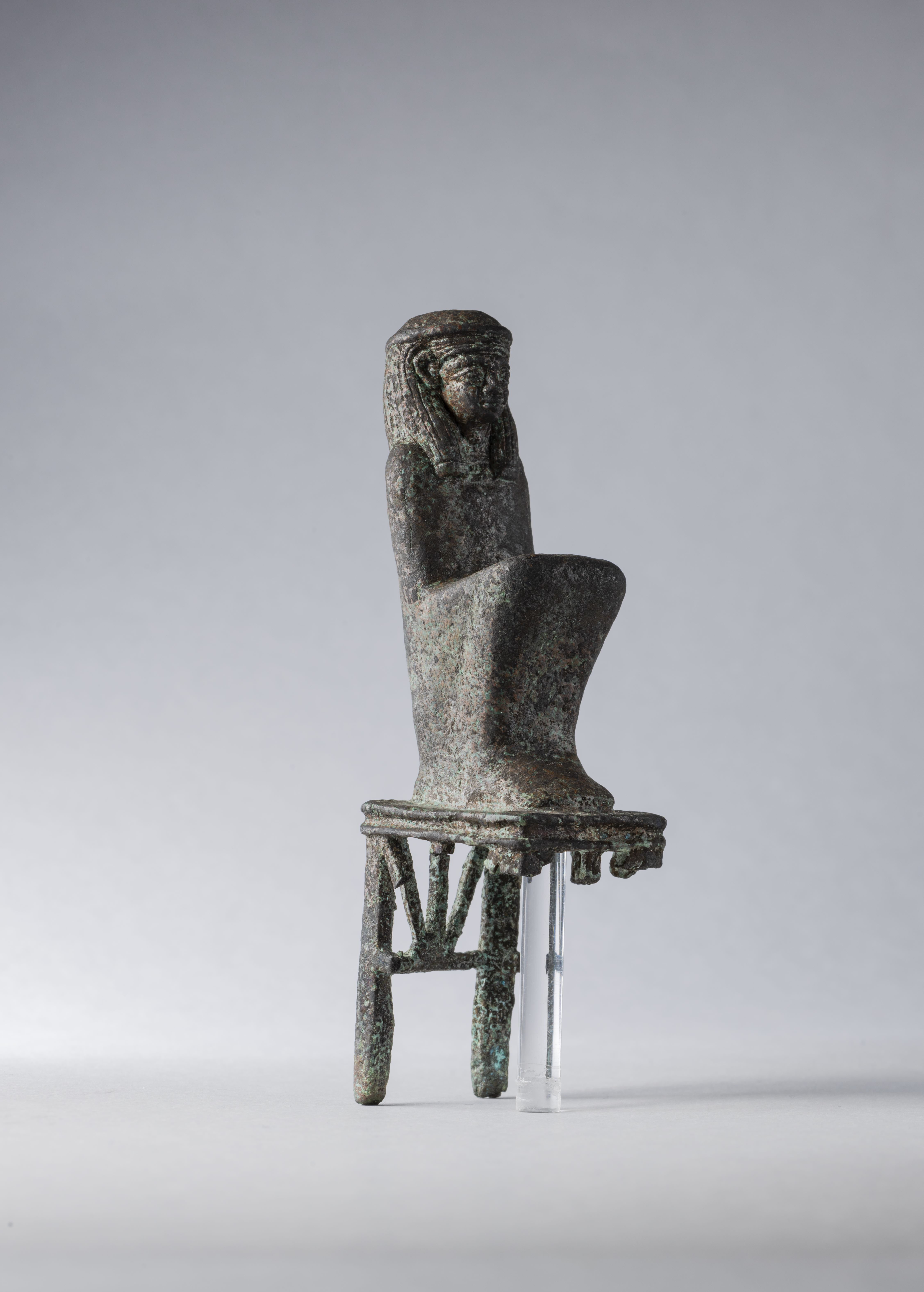 Squatting figure of Maat on a decorated seat. Maat wears a tripartite wig, which was probably topped with a tall ostrich feather, now missing. There is a square recess on the top of the wig for fitting the feather. The wig is decorated with a band around the head. The goddess is wearing a dress that does not allow distinguishing the limbs, and rests on a seat with a rectangular base with a recessed profile. The seat is made of four legs with a square cross-section, and the top is closed and decorated with three bars that meet in a single apex at the bottom. Perhaps the figure was part of a group. The object appears to have been made in the lost-wax technique for hollow casts.