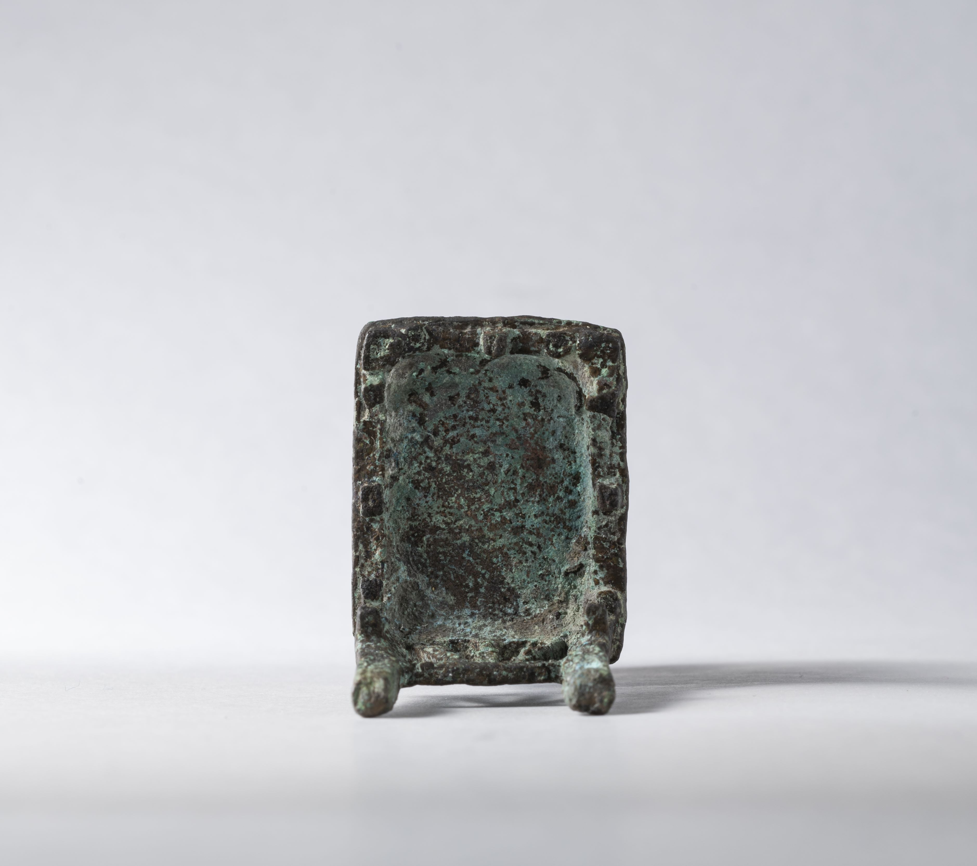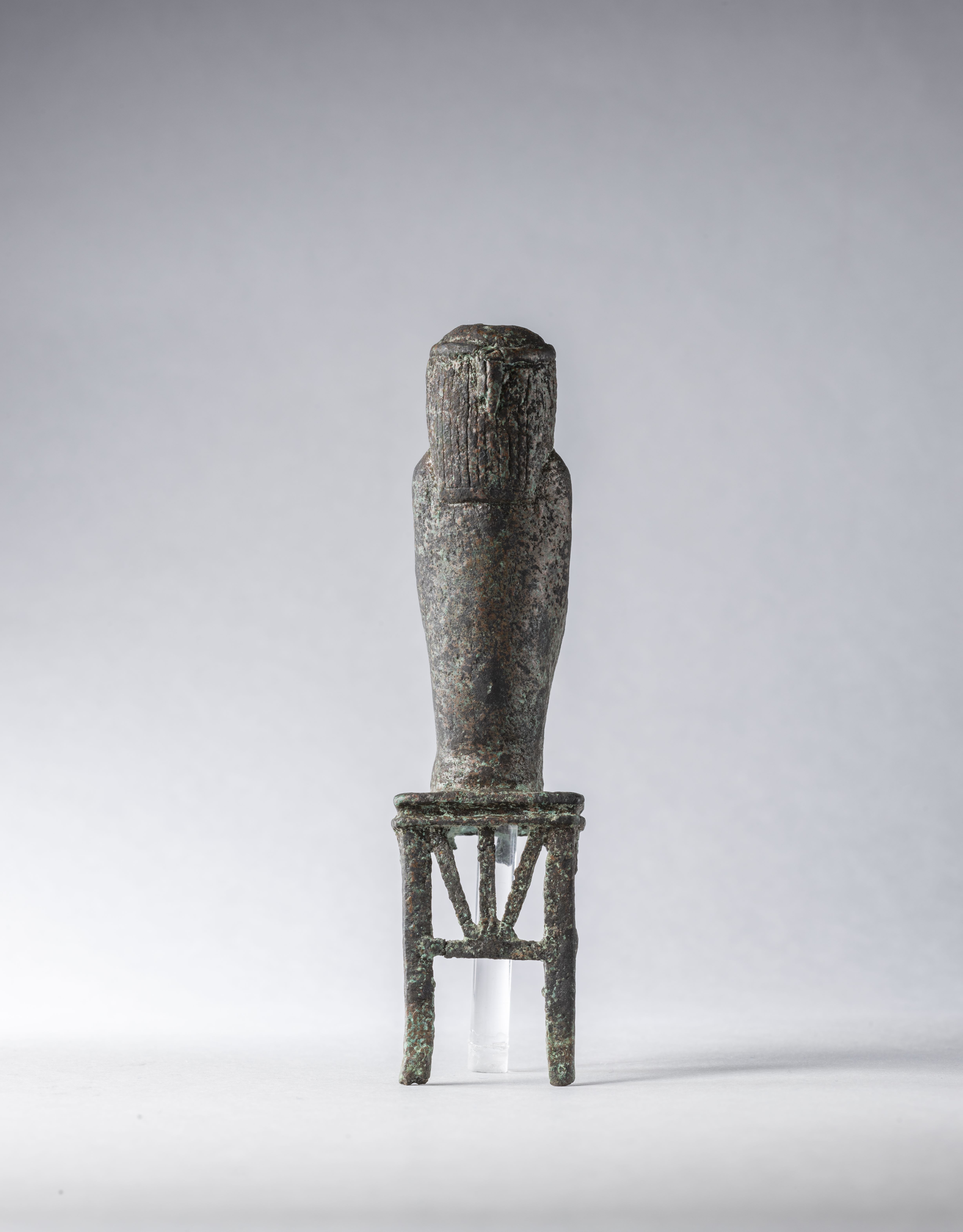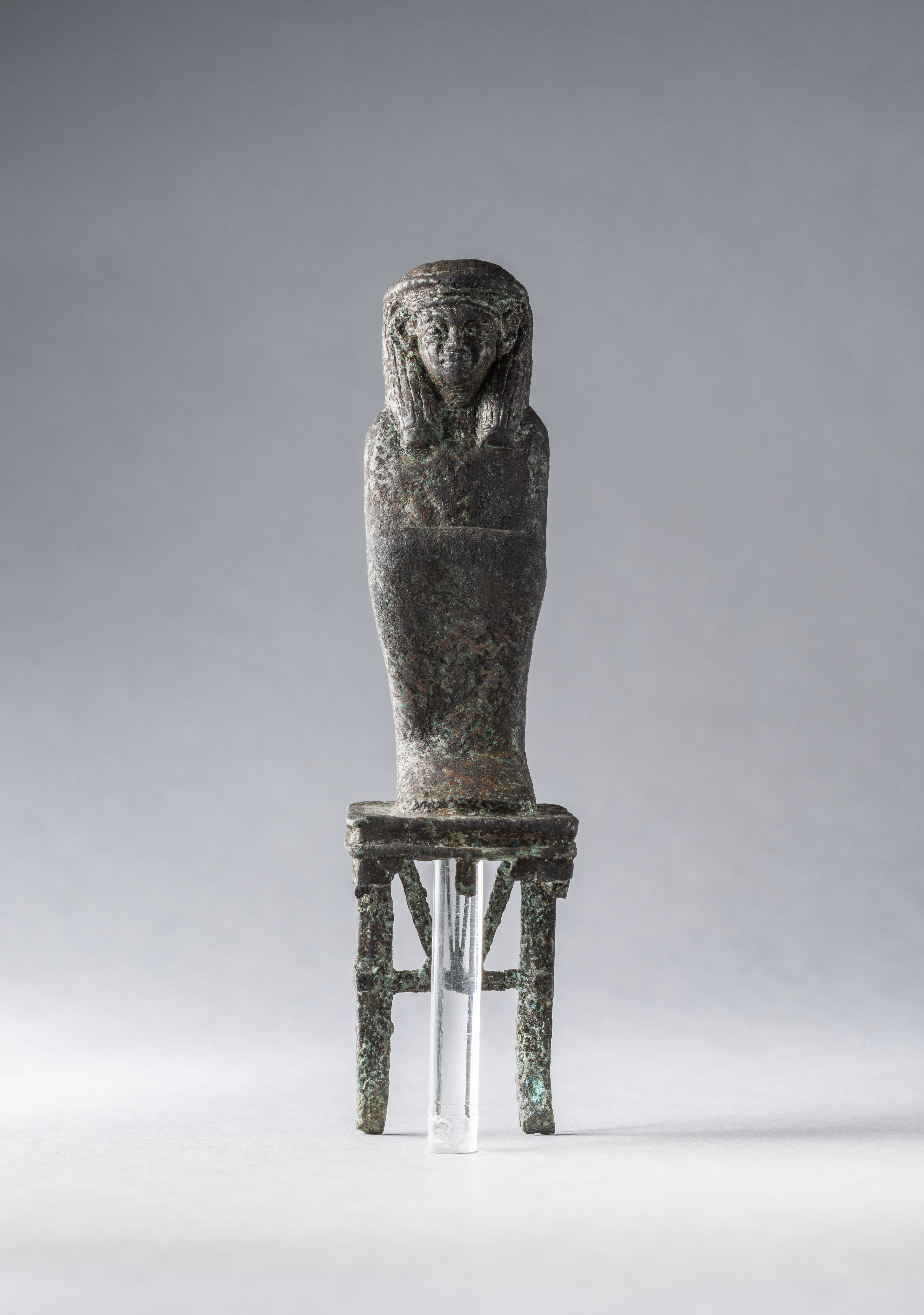 Squatting figure of Maat on a decorated seat. Maat wears a tripartite wig, which was probably topped with a tall ostrich feather, now missing. There is a square recess on the top of the wig for fitting the feather. The wig is decorated with a band around the head. The goddess is wearing a dress that does not allow distinguishing the limbs, and rests on a seat with a rectangular base with a recessed profile. The seat is made of four legs with a square cross-section, and the top is closed and decorated with three bars that meet in a single apex at the bottom. Perhaps the figure was part of a group. The object appears to have been made in the lost-wax technique for hollow casts.