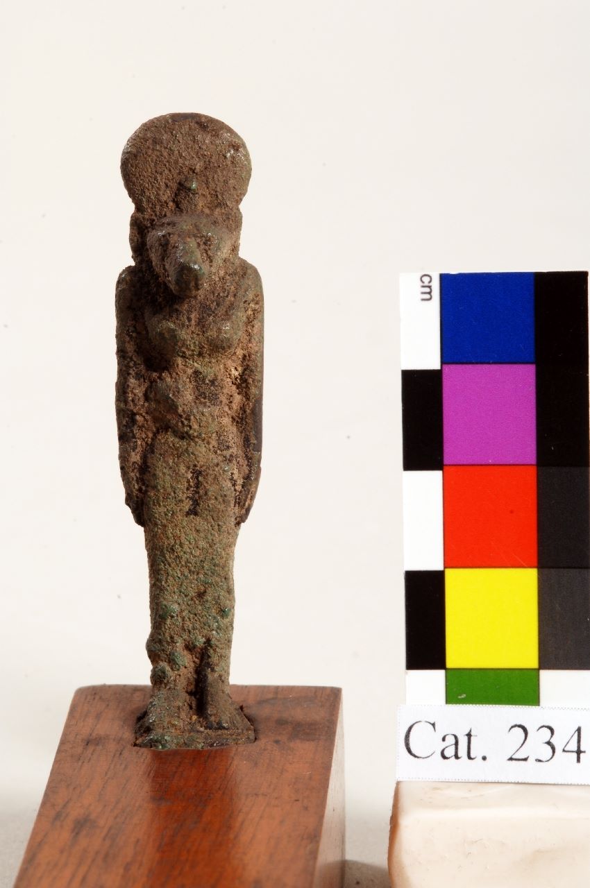 Standing figure of lion-headed Sekhmet. The goddess is crowned with a solar disc equipped with a barely visible uraeus. The head is well-modelled despite the small size of the figure, the muzzle is protruding downwards, the eyes are separated by the nasal bridge, the whiskers and mouth are indicated as thin incised lines. The mane is visible on the front left part of the chest. The goddess has a tripartite wig, only visible on the back, and decorated with vertical streaks. There is a suspension loop between the back of the solar disc and the head. Sekhmet’s arms are along her body, with palms pressed onto the thighs. The legs are together. The feet rest on a trapezoidal base. The statuette is mounted on a modern wooden base. The object is made in the lost-wax technique for solid casts.