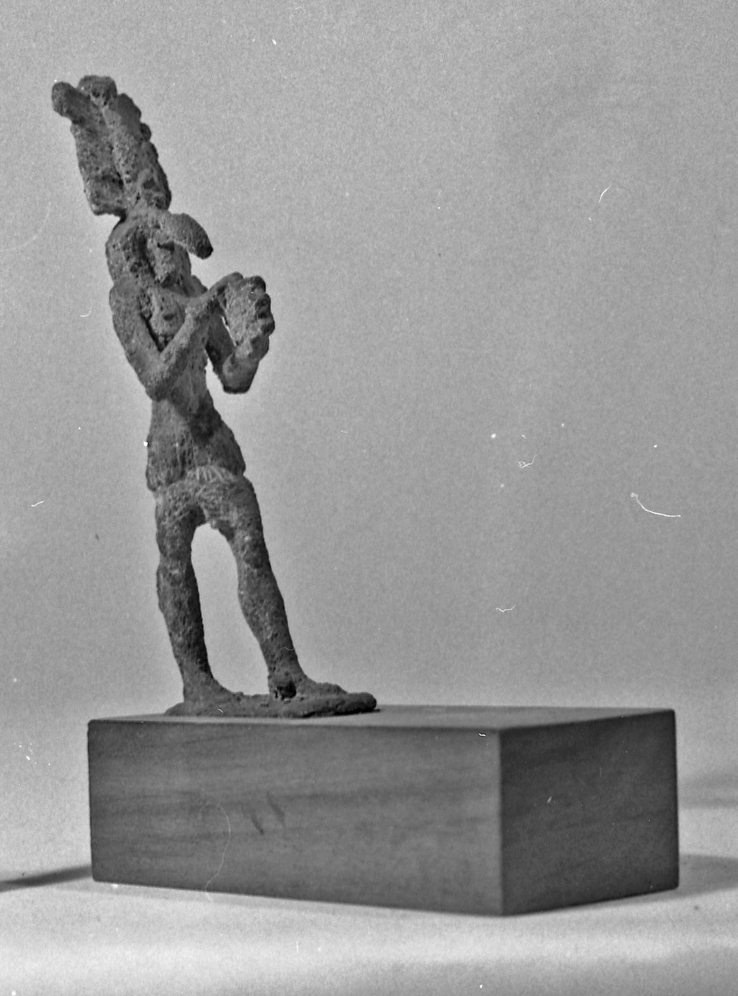 Standing figure of Thoth, represented as an ibis-headed, anthropomorphic deity, striding with the left leg forward. He wears the atef-crown, adorned with a prominent uraeus. Thoth is shown wearing a tripartite wig, from which the head of the ibis emerges. The god’s arms are bent, and he holds a wedjat eye in his hands—one positioned above, the other below. He is dressed in a kilt, which appears to be decorated. The feet rest on a rectangular base, from the centre of which projects down a square tenon. The object is made in the lost-wax technique for solid casts.