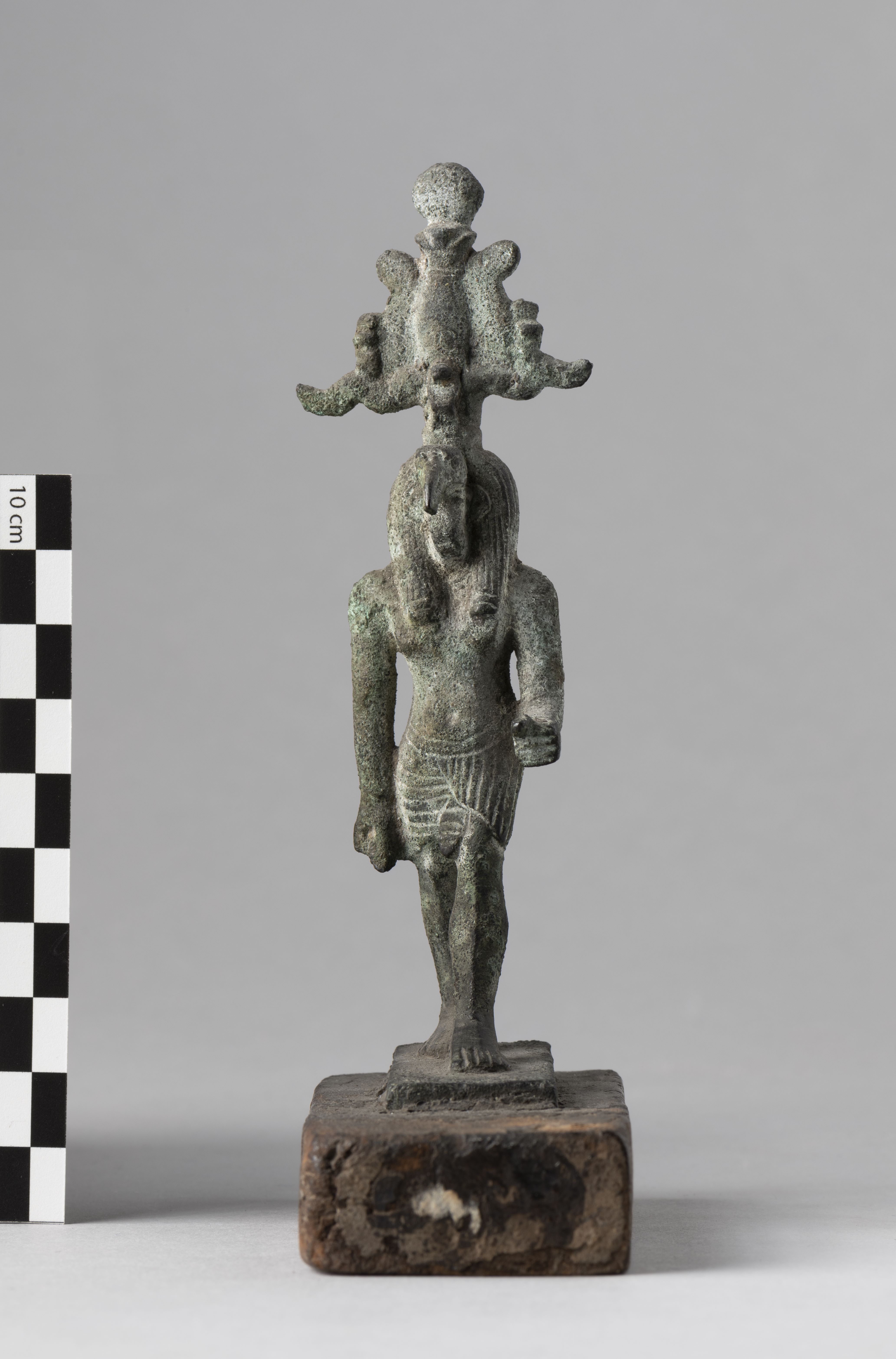 Standing figure of Thot, represented as an ibis-headed, anthropomorphic deity, striding with left leg forward. The god has a crown composed of a modius decorated with the uraeus, surmounted by a rush crown with ram horns, the ostrich feathers are flanked by uraei crowned with solar discs. The crown is topped with a solar disc. The head and neck of the ibis stick out from a tripartite wig. The left arm is bent forward, while the right arm is alongside the body, the hands are clenched into fists. The hands are pierced to hold the now missing insignia. The god wears a shendyt kilt with a belt and a central tab hanging down. The feet rest on a rectangular base. The figure is mounted on a wooden base that appears ancient. The object is made in the lost-wax technique for solid casts.