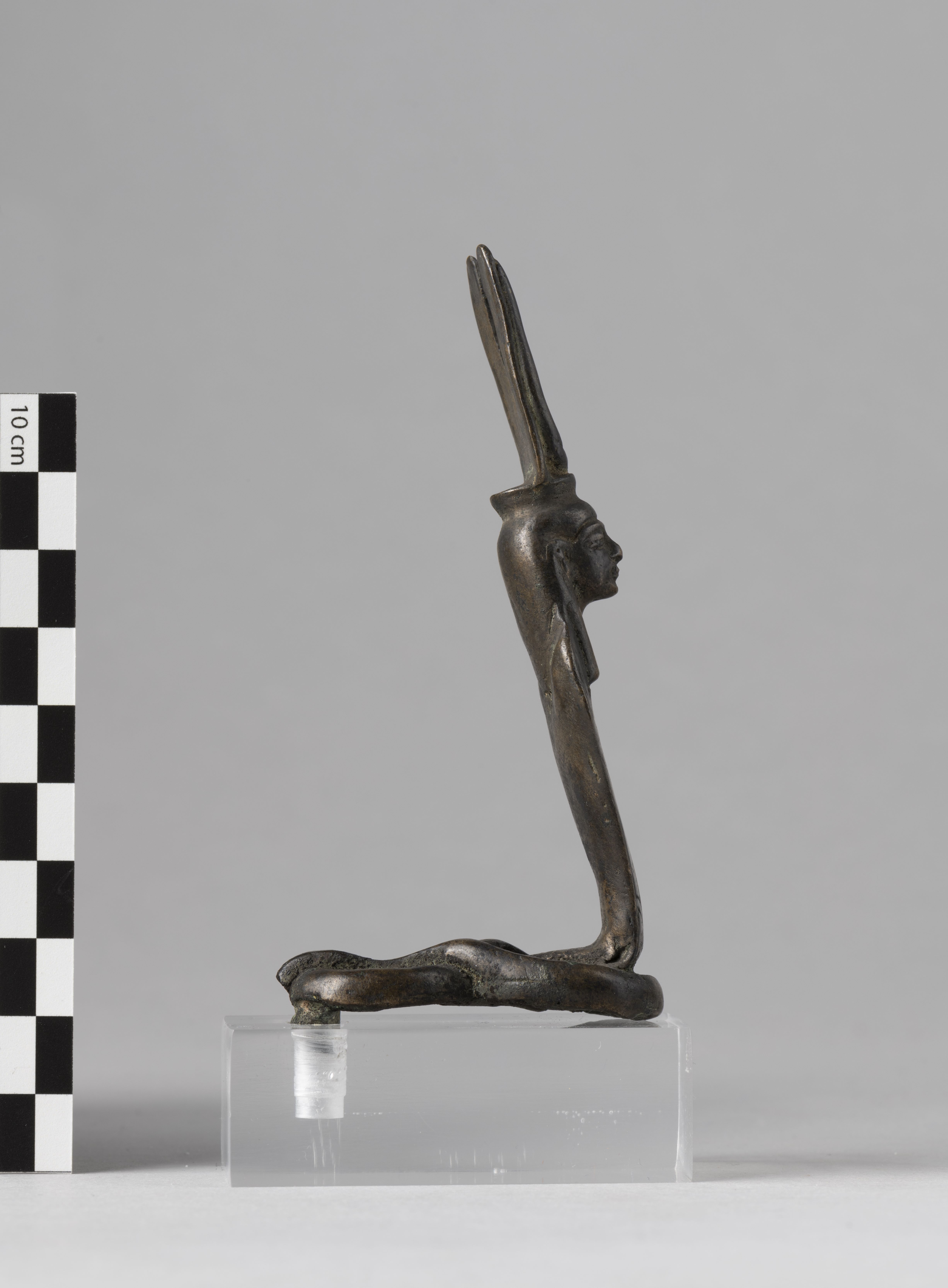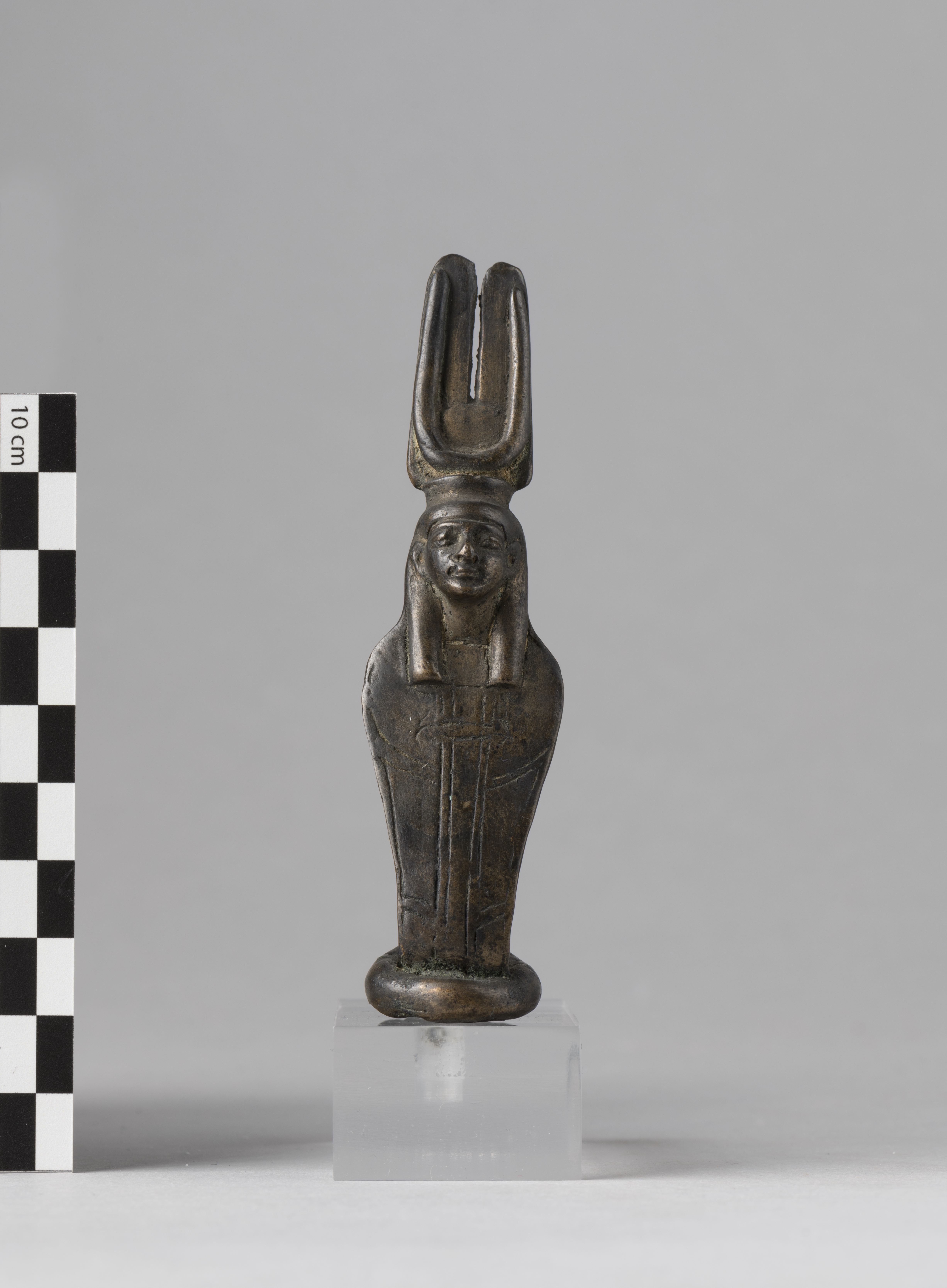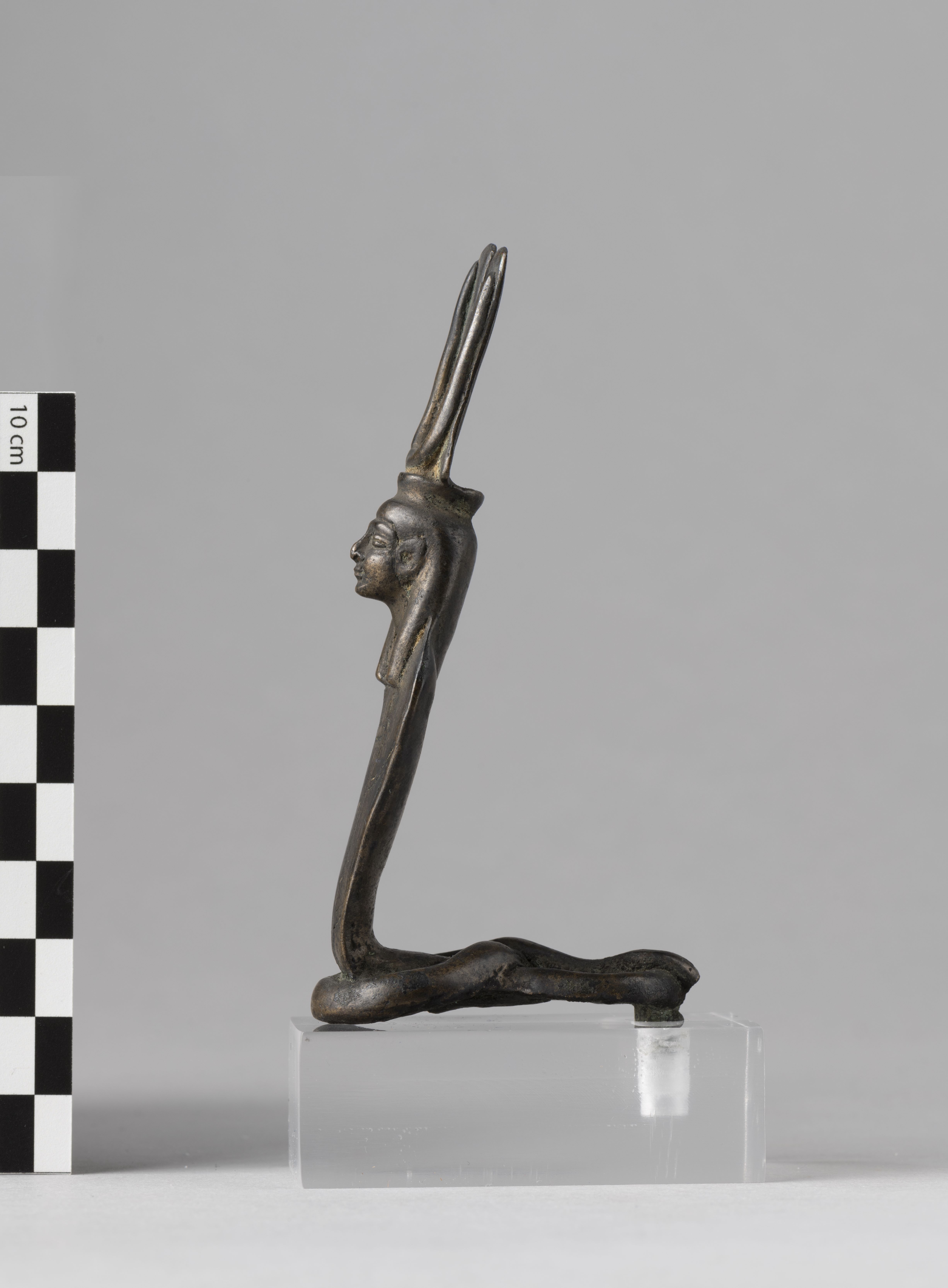 Figure of a woman-headed snake goddess. The figure is crowned with a headdress consisting of a solar disc with long cow horns, resting on two tall, thin feathers. The goddess wears a plain tripartite wig. The ventral scales of the snake are indicated, and the hood is divided into six sections. The tail is coiled forming a sort of figure-of-eight shape, though the terminal part is missing. The remnant of a tenon is present under the base, towards the rear. The object is made in the lost-wax technique for solid casts.