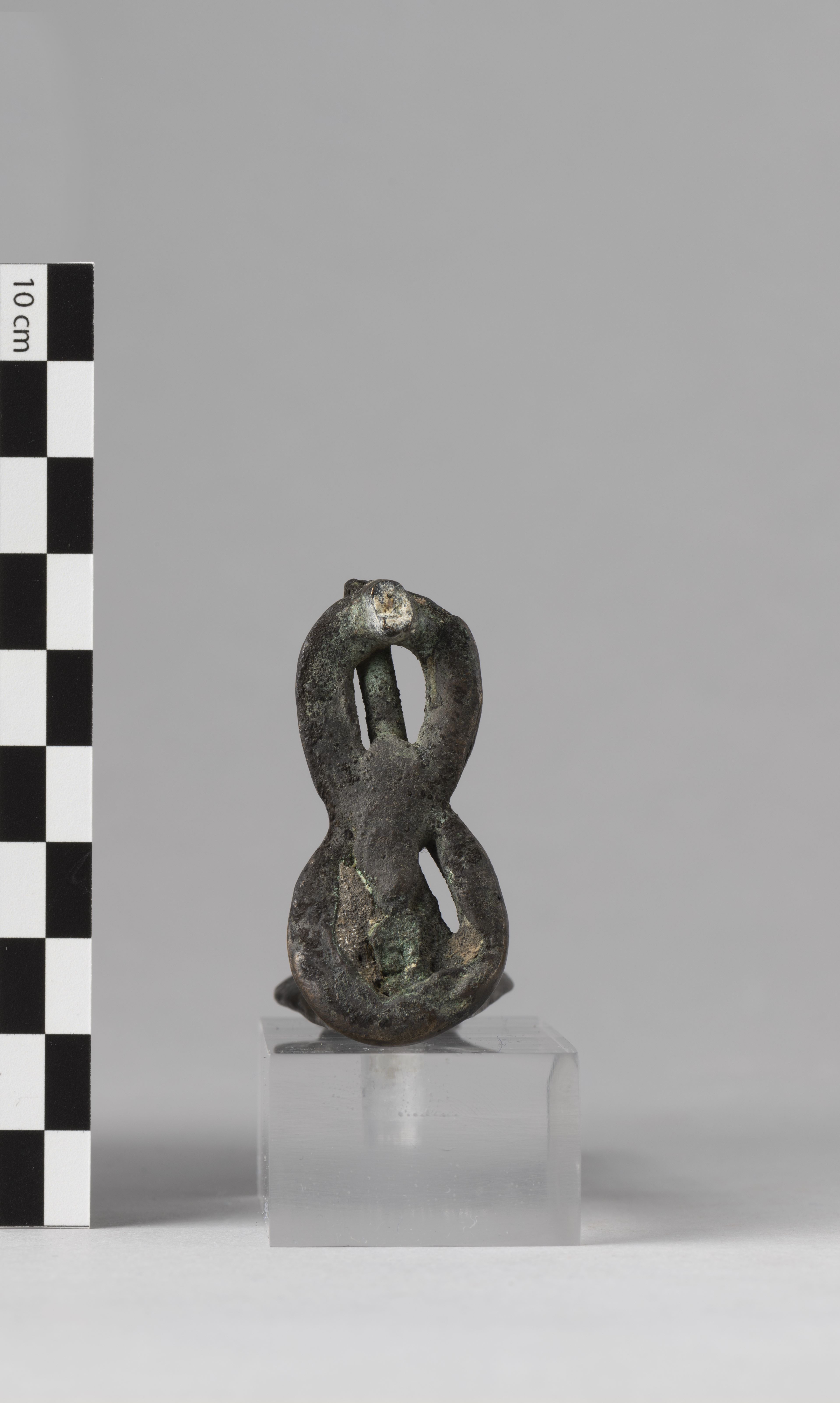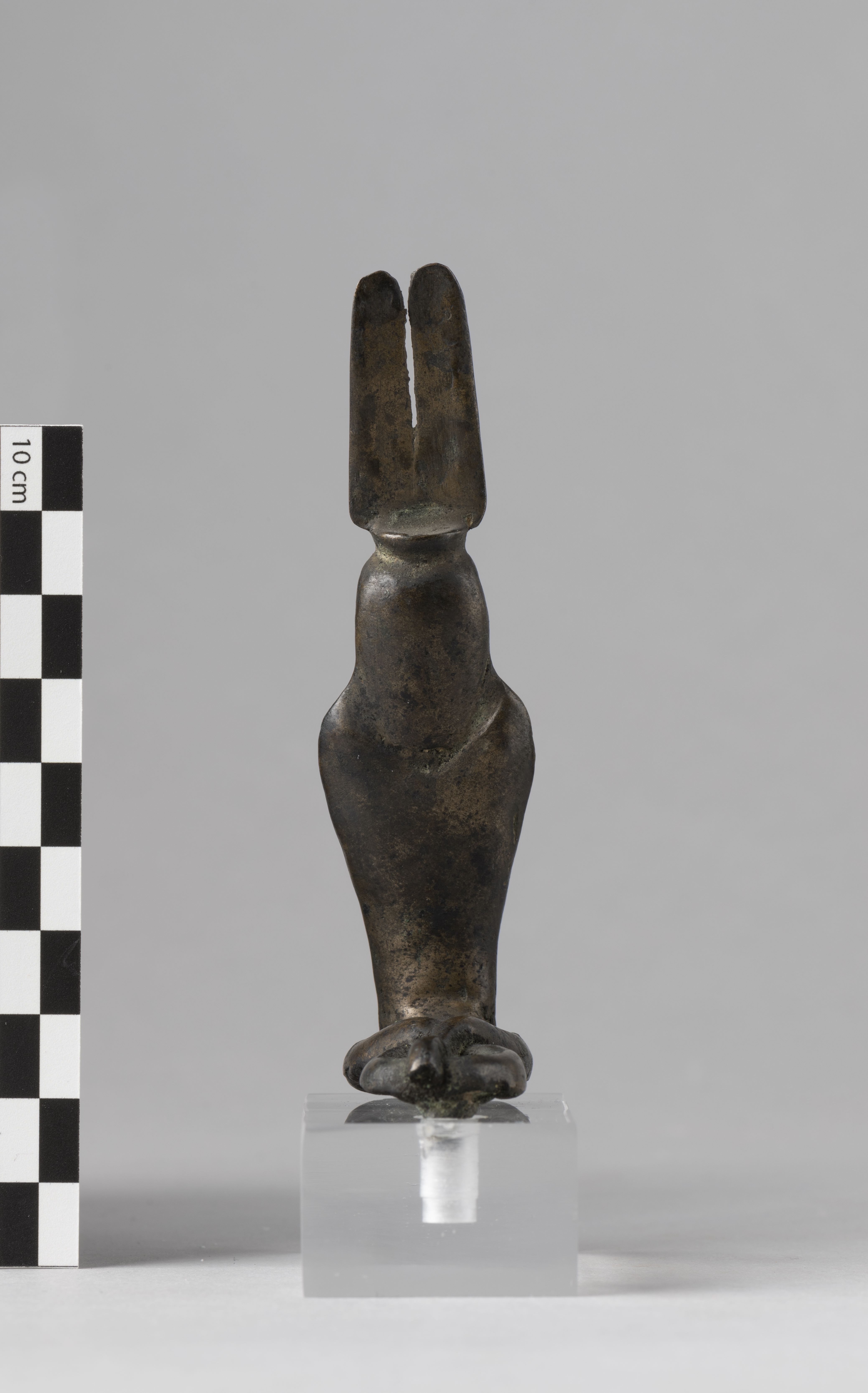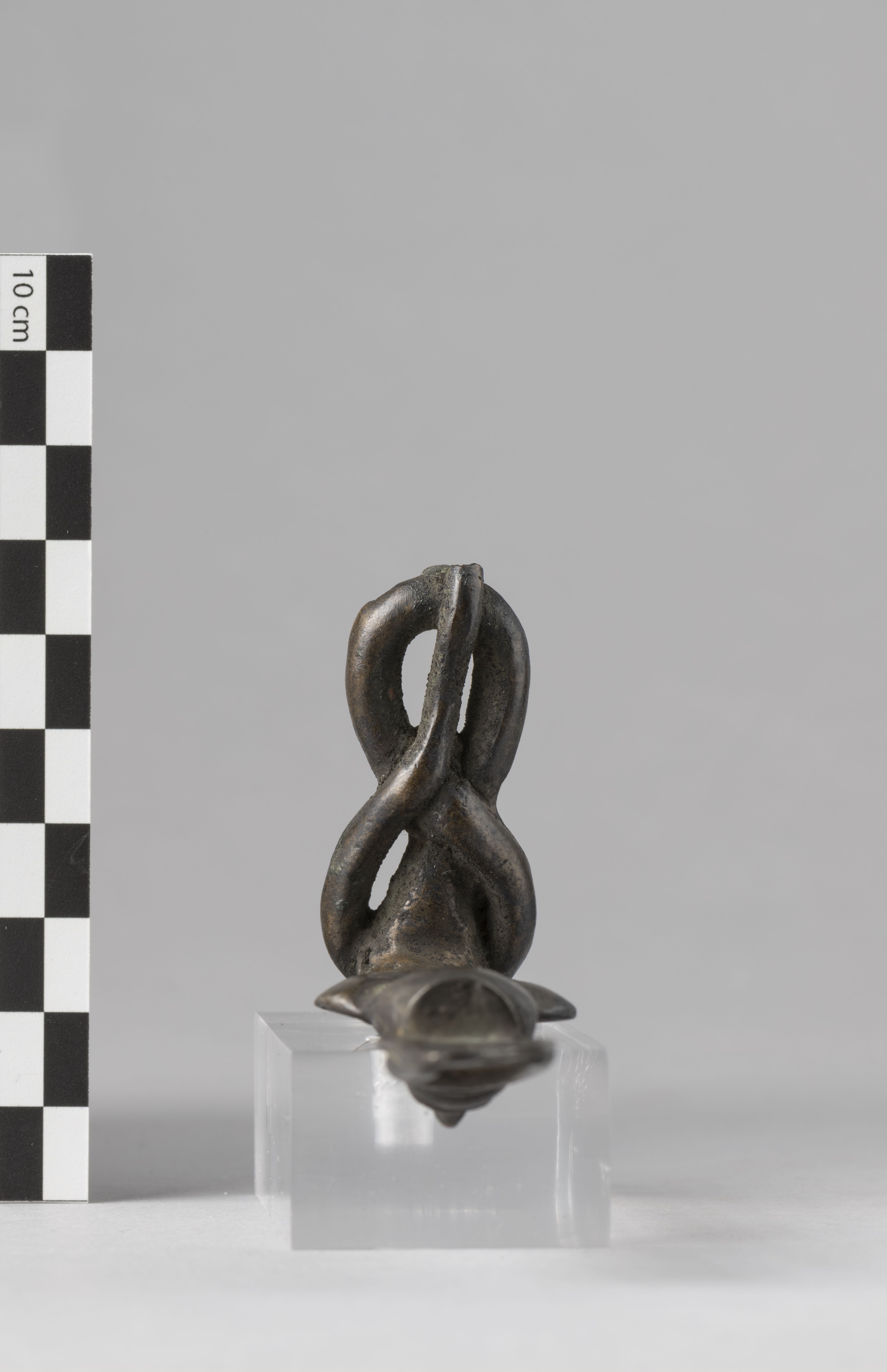 Figure of a woman-headed snake goddess. The figure is crowned with a headdress consisting of a solar disc with long cow horns, resting on two tall, thin feathers. The goddess wears a plain tripartite wig. The ventral scales of the snake are indicated, and the hood is divided into six sections. The tail is coiled forming a sort of figure-of-eight shape, though the terminal part is missing. The remnant of a tenon is present under the base, towards the rear. The object is made in the lost-wax technique for solid casts.