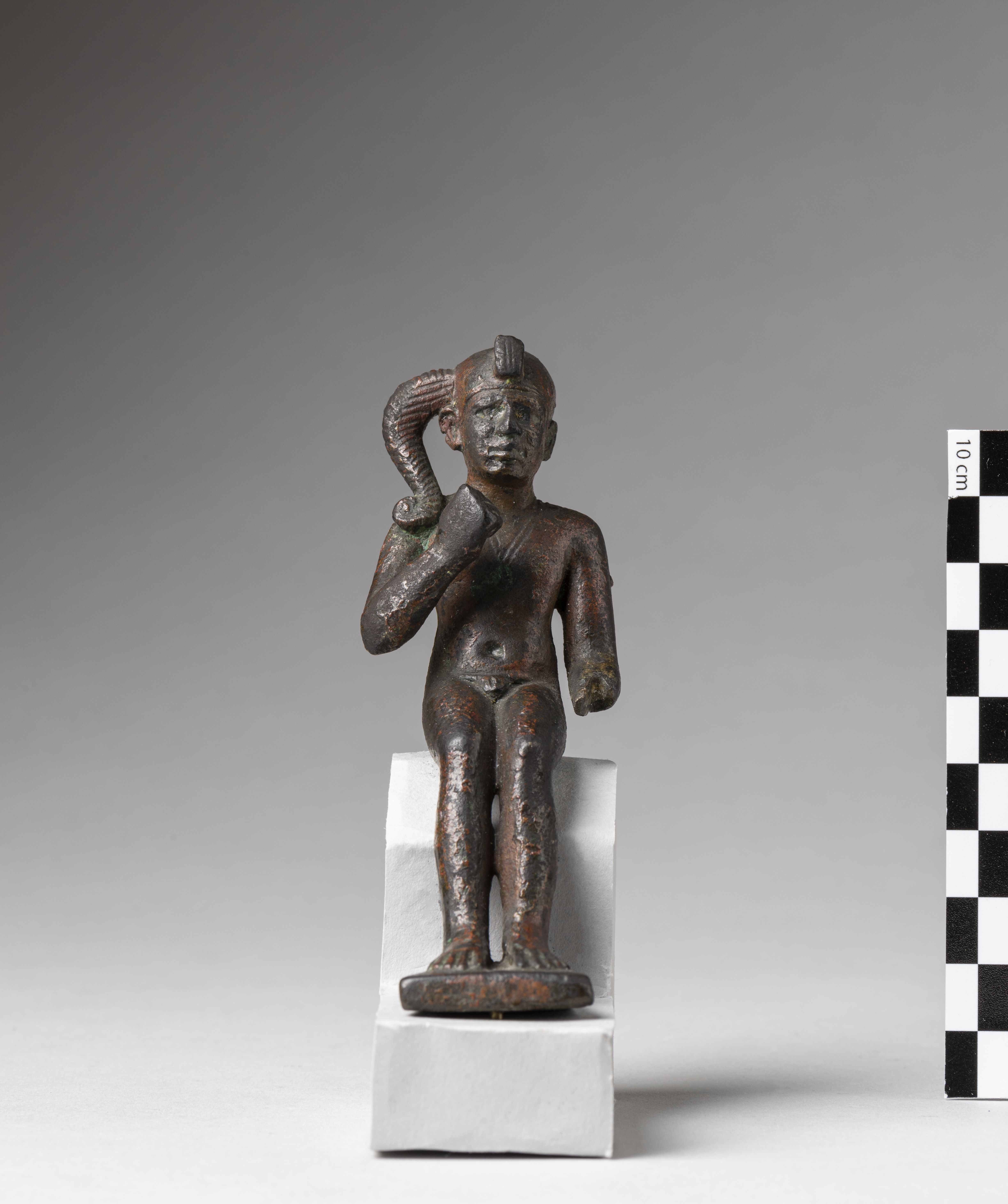Seated, naked figure of Harpocrates. The god is wearing a skullcap decorated with the uraeus whose head is missing, its sinuous tail is incised and extends on the top of the skullcap. Harpocrates has the side-lock on the right side of the head, decorated with a plaited pattern and ending with a curl on the right shoulder. Two streamers descend from the skullcap to the upper back. Harpocrates has a necklace with a pendant, which is not clearly visible. Harpocrates has his left arm at side, part of the forearm is missing. The right arm is bent, and the god is bringing his now missing right index finger to his mouth. The legs are together and cut out at some spots, the leg muscles are slightly indicated. The feet rest on a trapezoidal base. Two modern brass pins have been inserted, one under the buttocks and one under the base. The object is made in the lost-wax technique for solid casts.