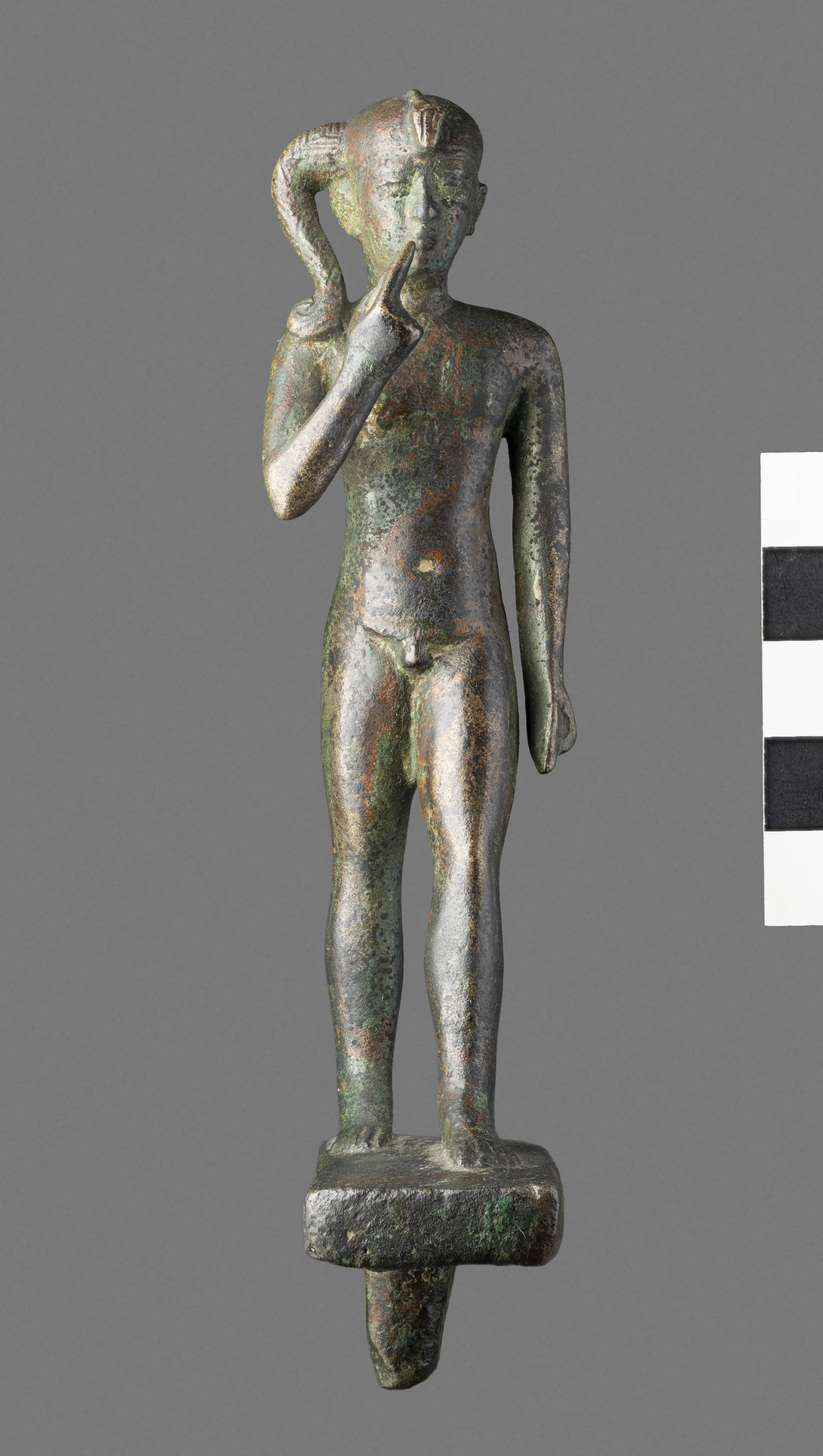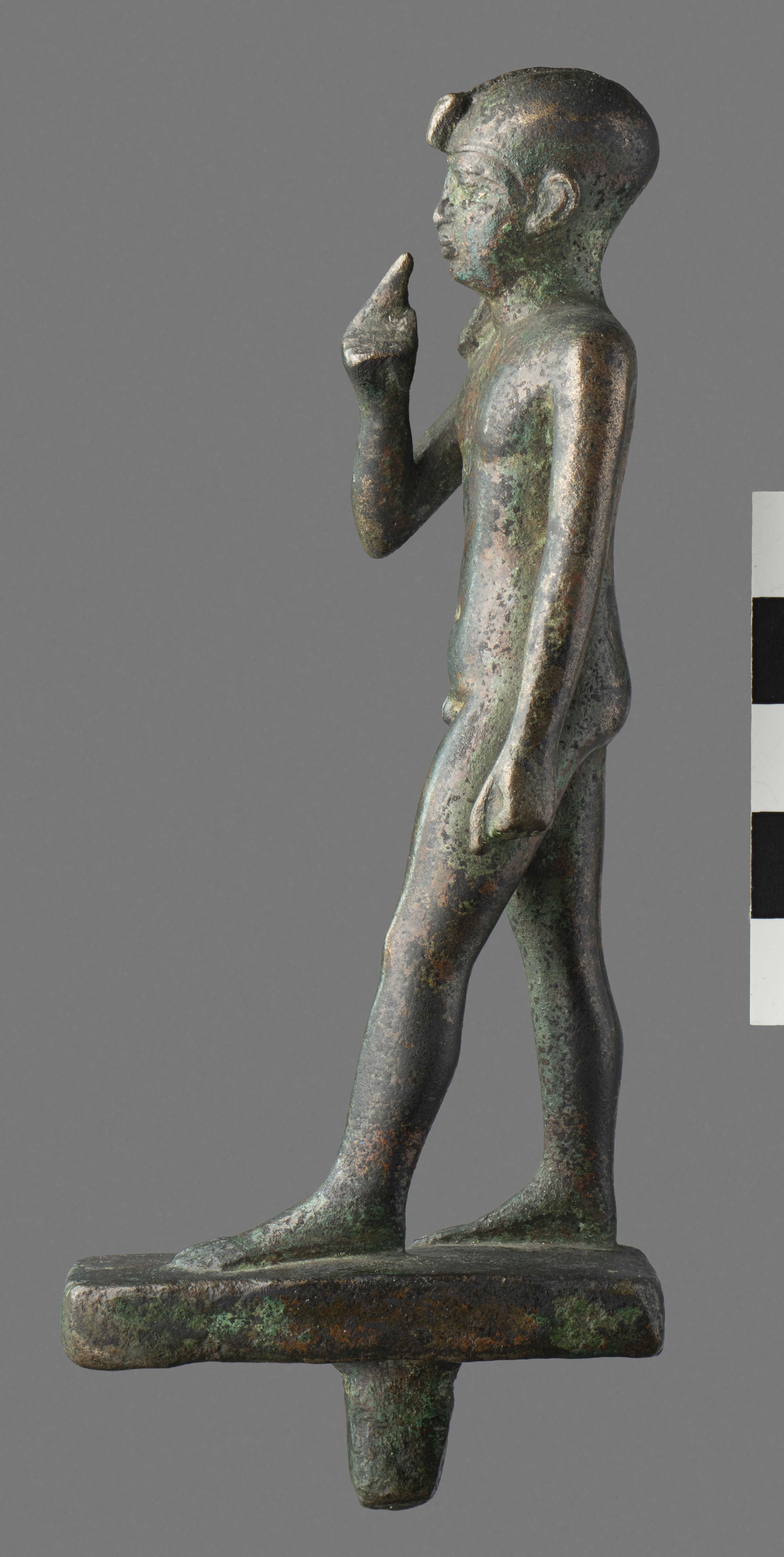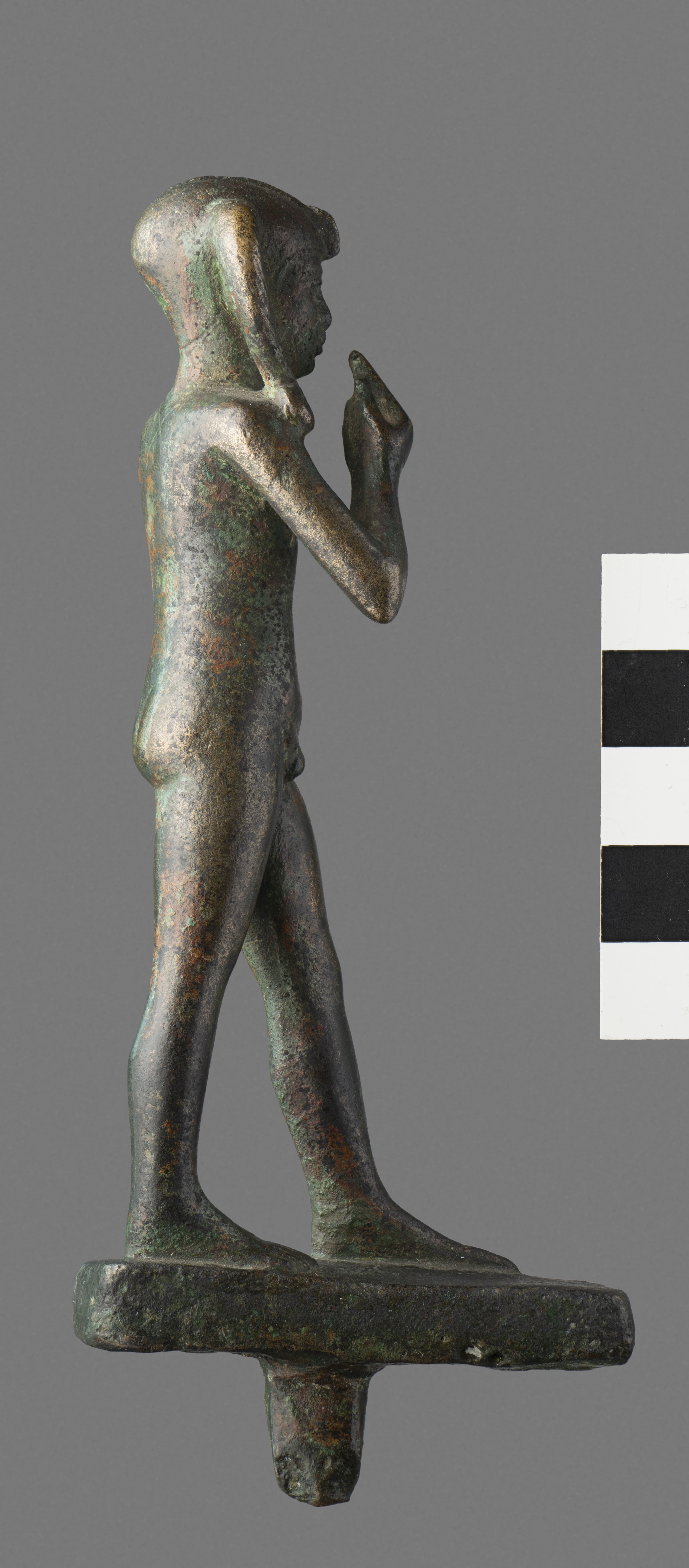 Standing figure of Harpocrates, striding with left leg forward. The god is wearing the skullcap decorated with the uraeus and a decorated side-lock of youth on the right side of the head, which ends with a curl on the shoulder. Harpocrates has a necklace, tied at the back, with a heart (Gardiner F34) as pendant. The necklace is also visible on the back. Harpocrates is bringing his right index finger to his mouth, the left arm is at side, the hand is clenched in a fist. The leg muscles are indicated. The feet rest on a rectangular base, from which an irregular square tenon projects down. The object is made in the lost-wax technique for solid casts.