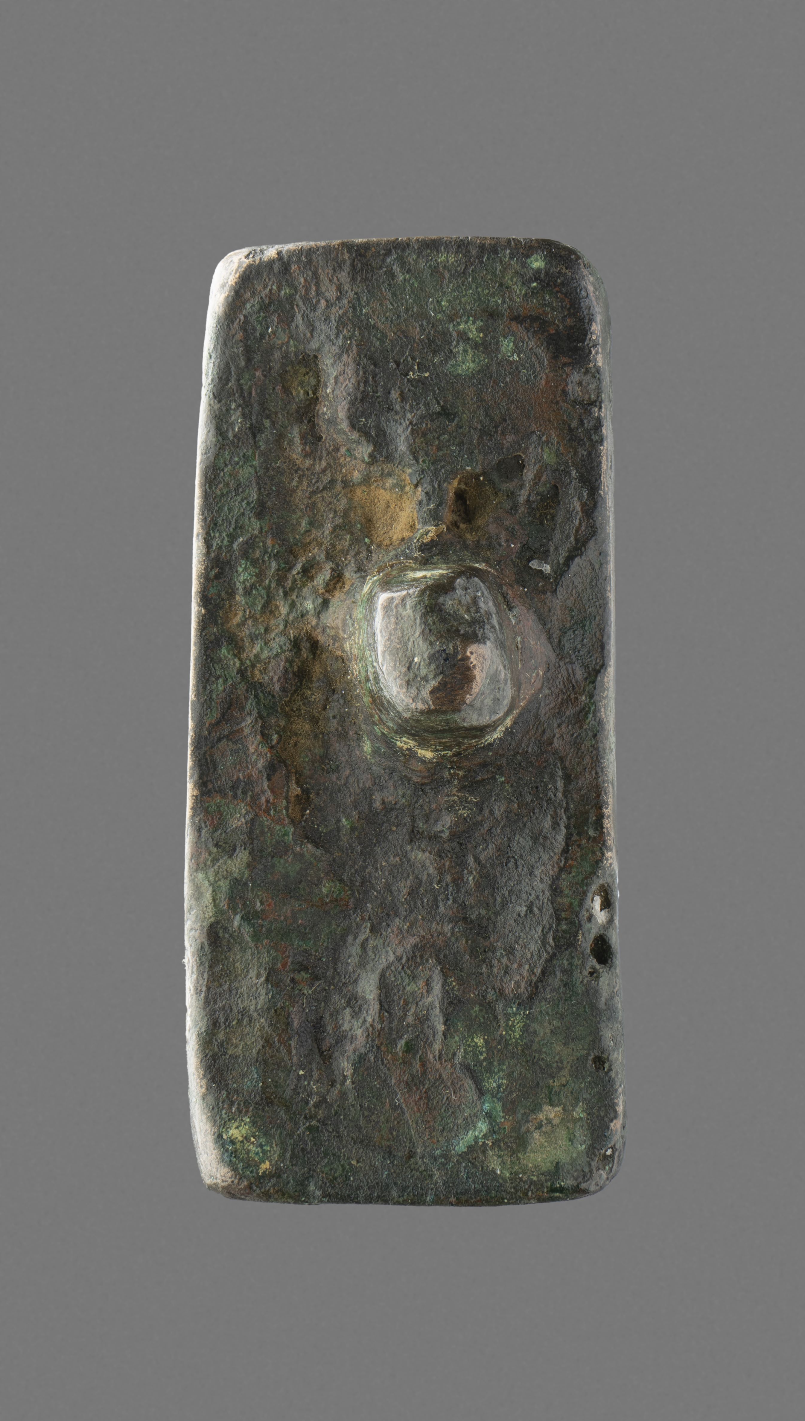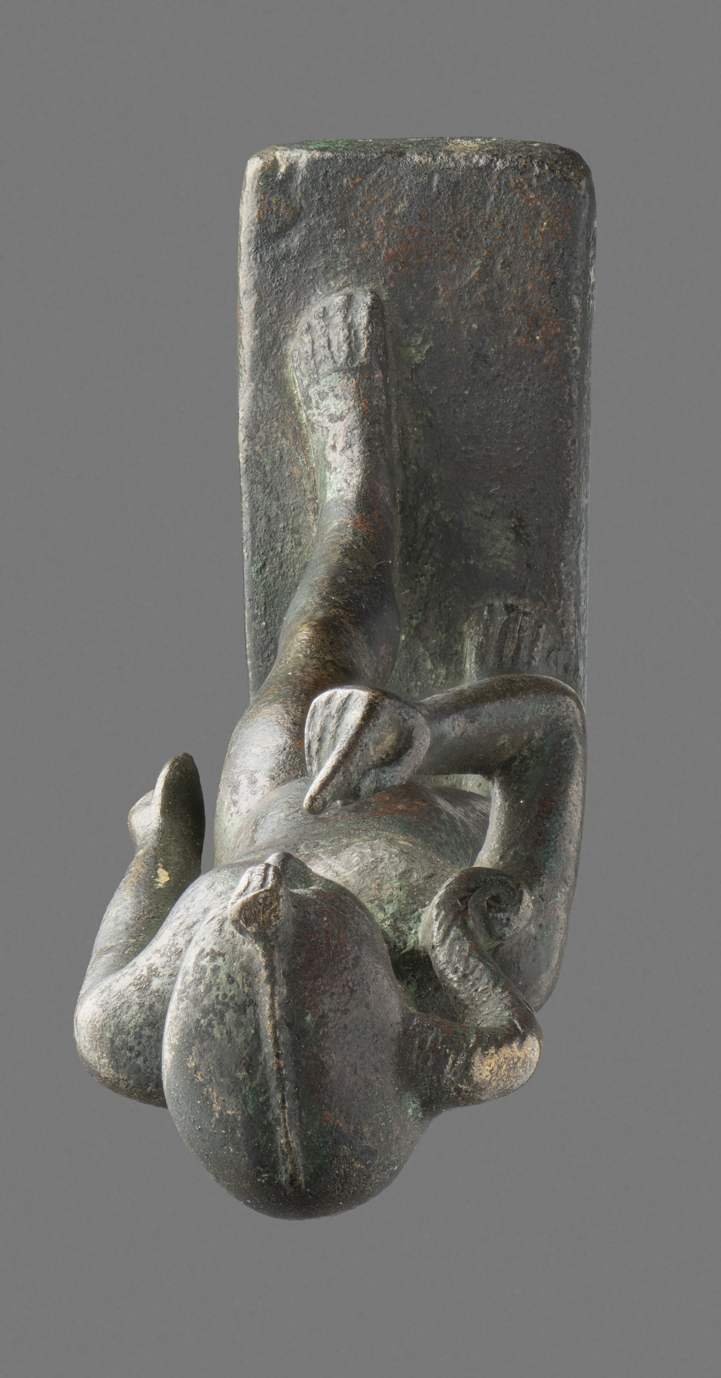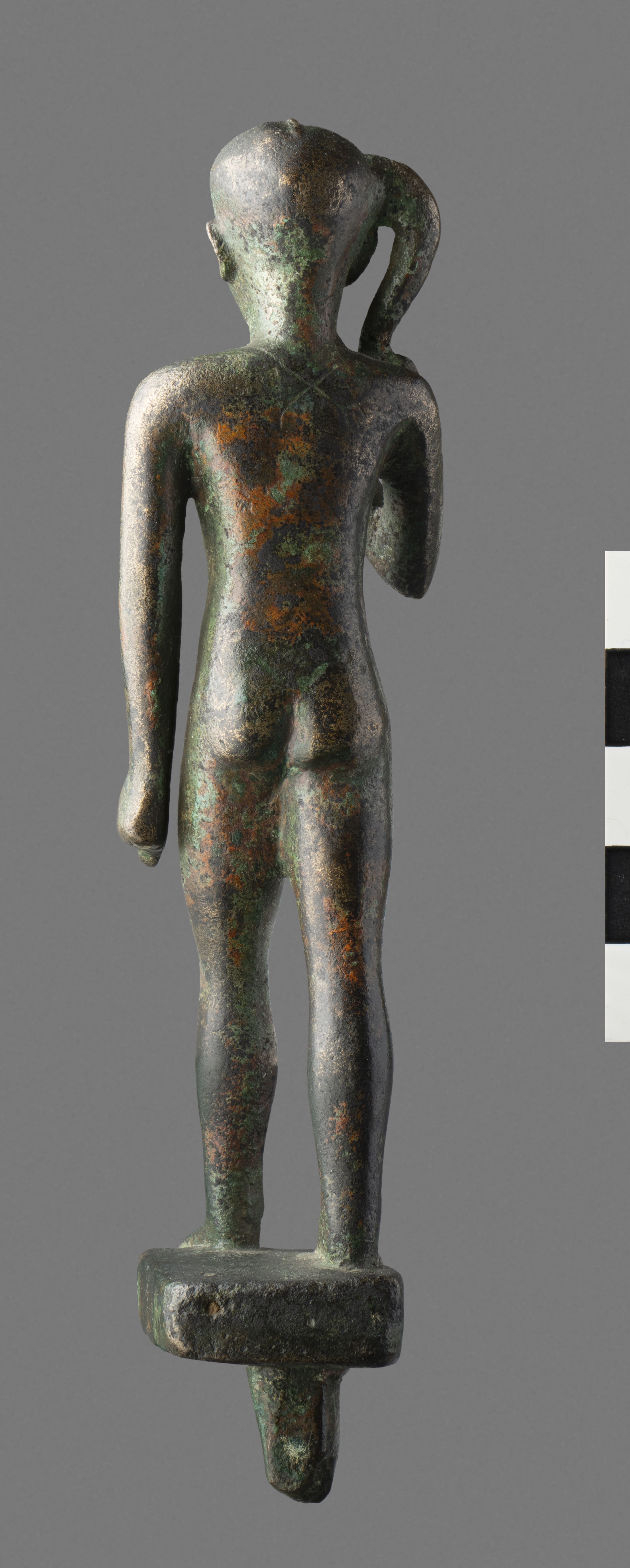 Standing figure of Harpocrates, striding with left leg forward. The god is wearing the skullcap decorated with the uraeus and a decorated side-lock of youth on the right side of the head, which ends with a curl on the shoulder. Harpocrates has a necklace, tied at the back, with a heart (Gardiner F34) as pendant. The necklace is also visible on the back. Harpocrates is bringing his right index finger to his mouth, the left arm is at side, the hand is clenched in a fist. The leg muscles are indicated. The feet rest on a rectangular base, from which an irregular square tenon projects down. The object is made in the lost-wax technique for solid casts.
