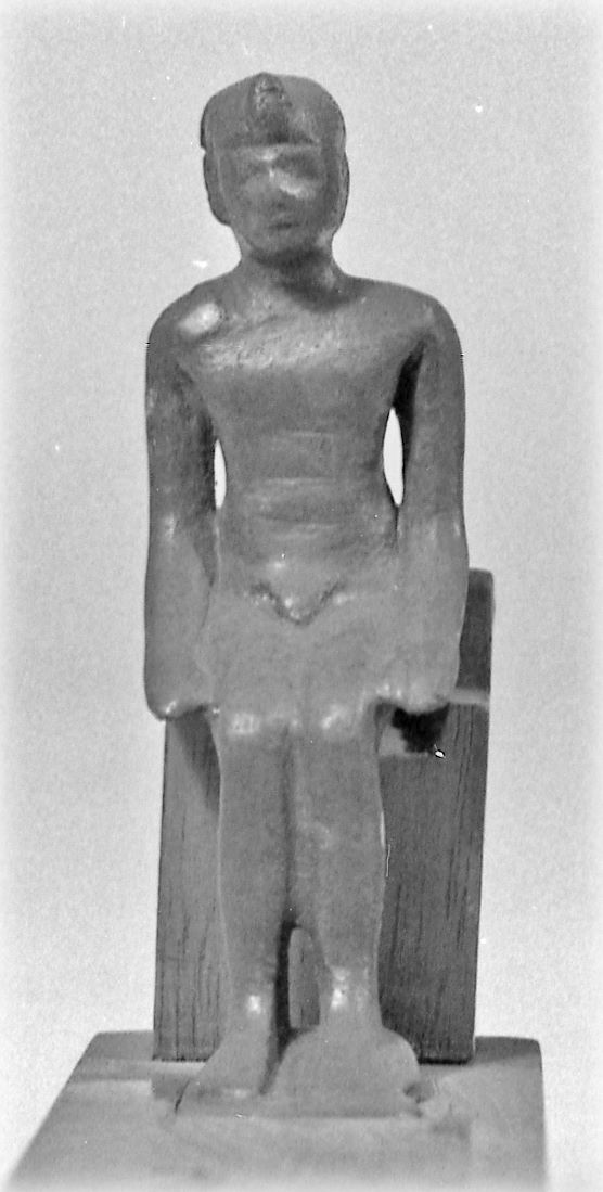 Seated, naked figure of Harpocrates. The god is wearing the skullcap decorated with the uraeus, the side-lock of youth is missing and has been filed off, as the suspension loop at the back of the neck. Harpocrates has his arms at sides with hands open, the palms facing down. The legs are together up to the ankles, the leg muscles are slightly indicated. The feet rest on a thin trapezoidal base. The object is made in the lost-wax technique for solid casts.
