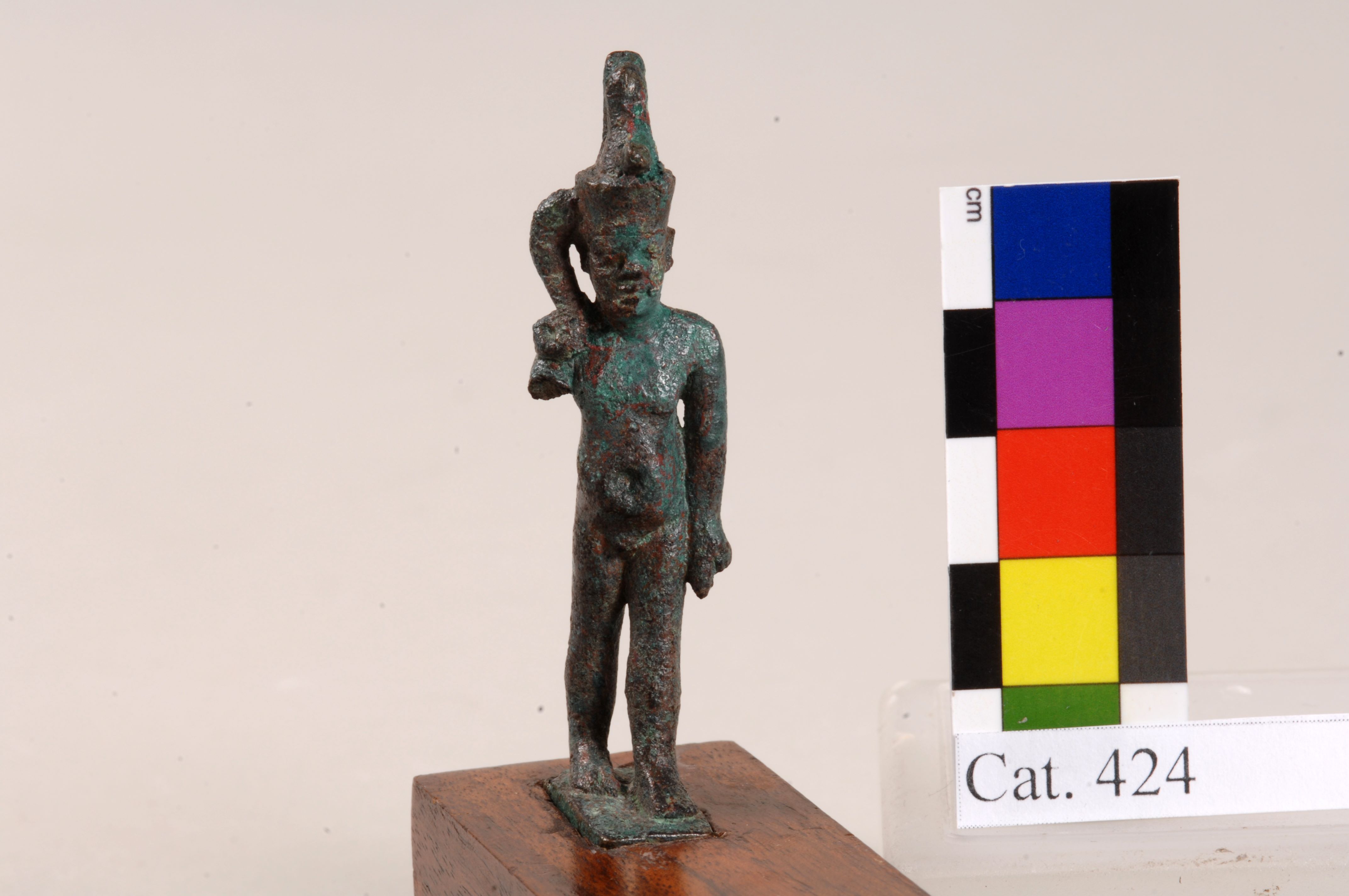 Standing figure of Harpocrates, striding with left leg forward. The god is depicted with the double crown and the side-lock on the right side of the head, which ends with a curl on the shoulder. The right arm is broken, the left arm is at side, the hand with modelled thumb is clenched in a fist. The feet rest on a rectangular base. The object is made in the lost-wax technique for solid casts.