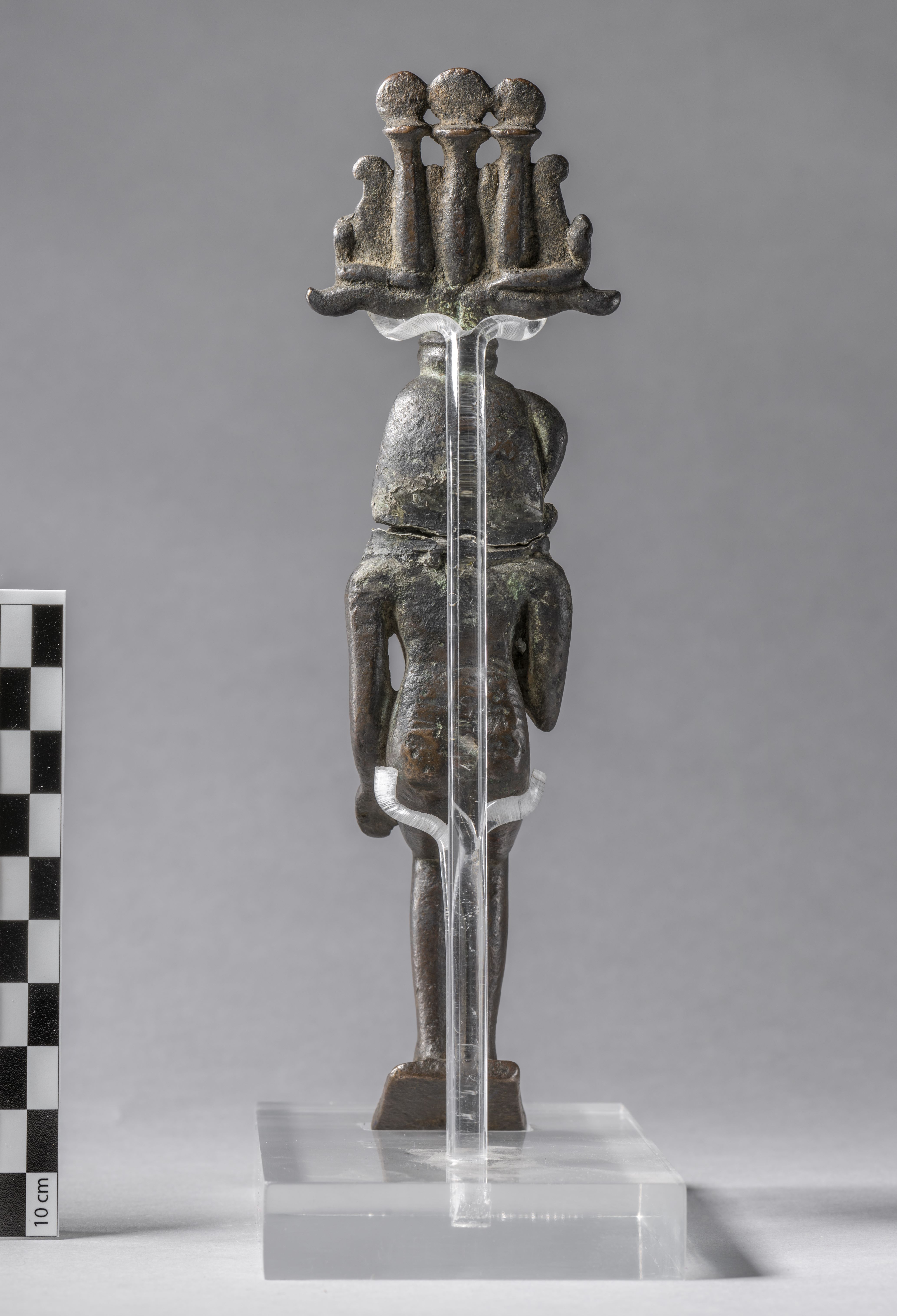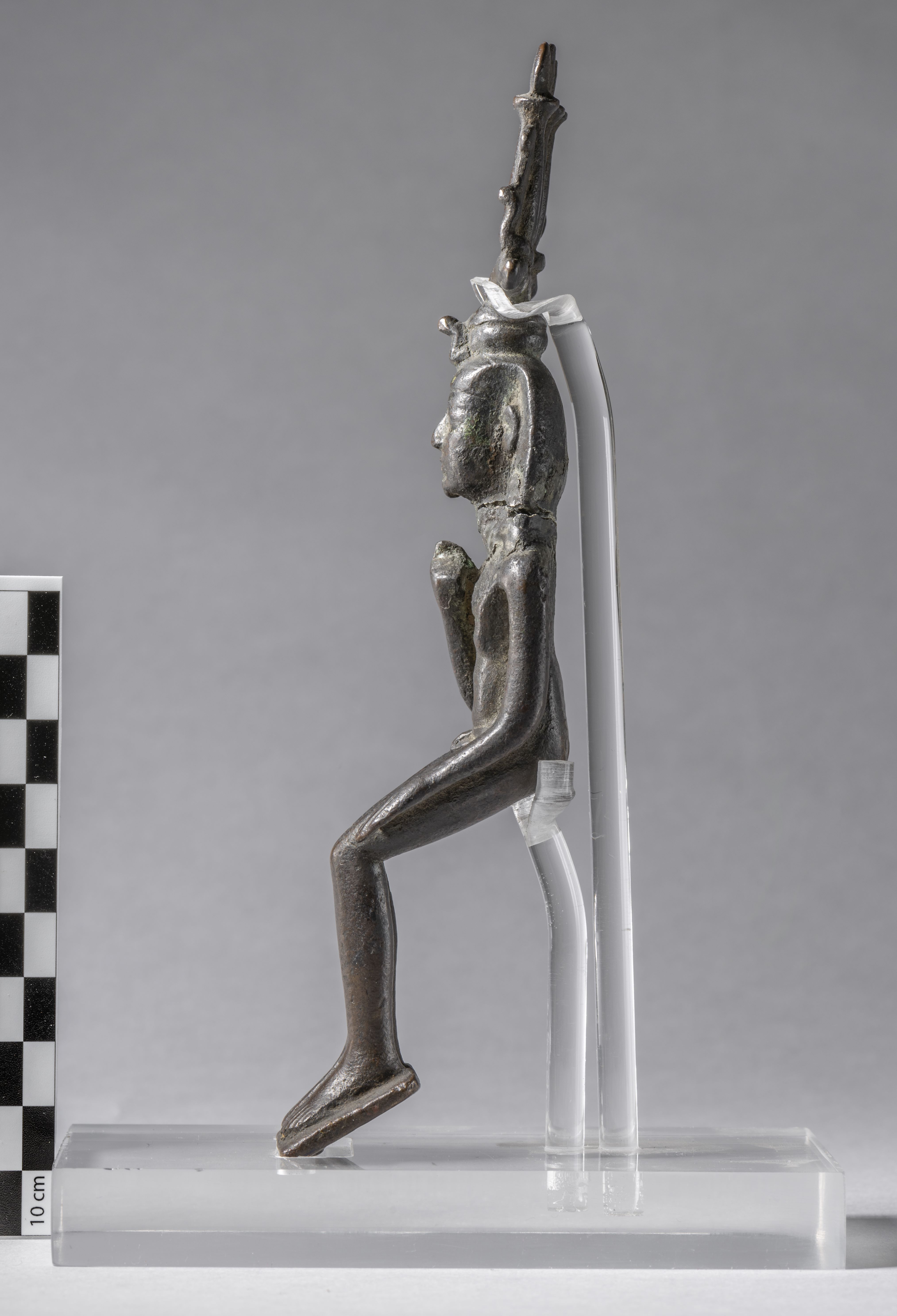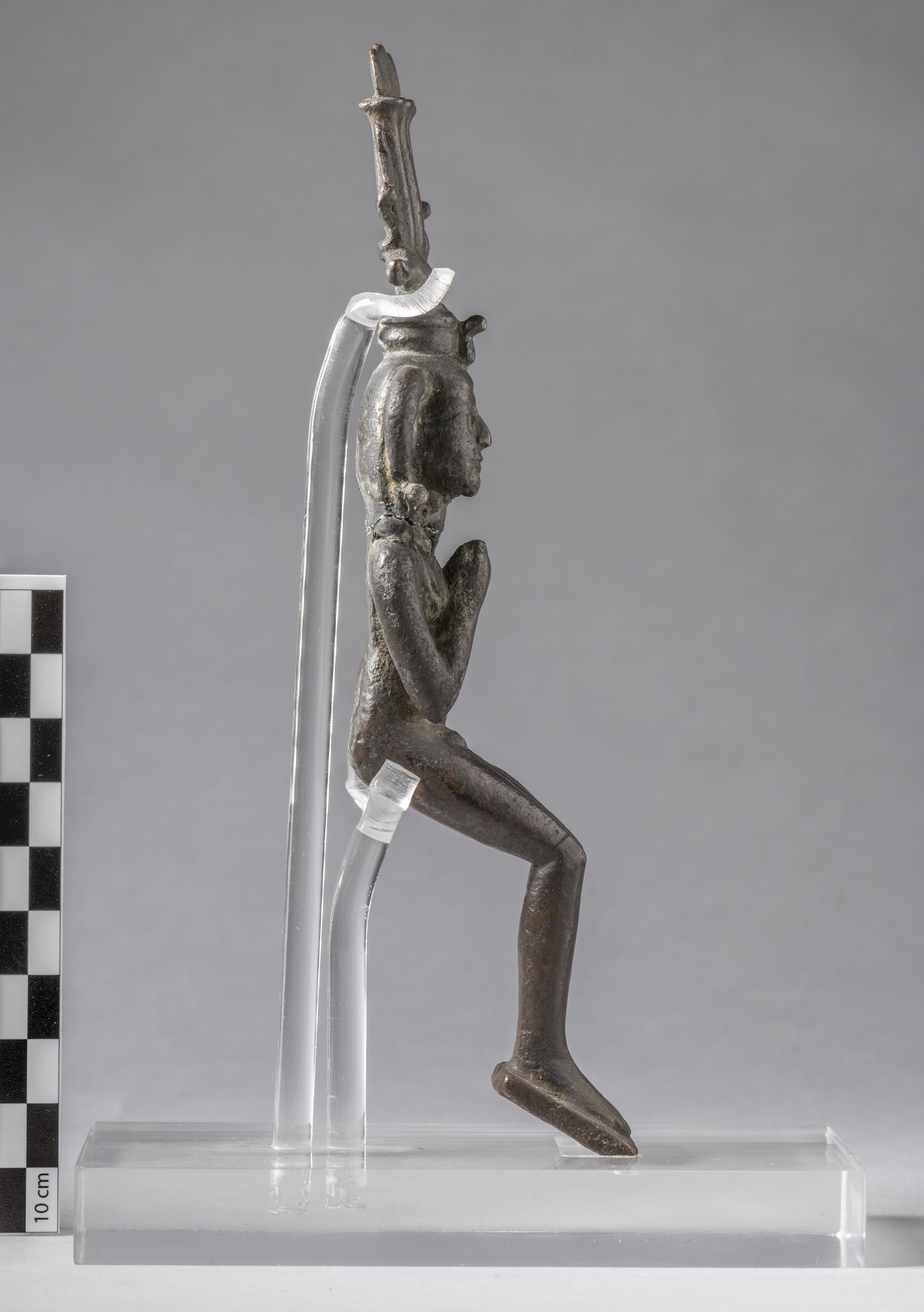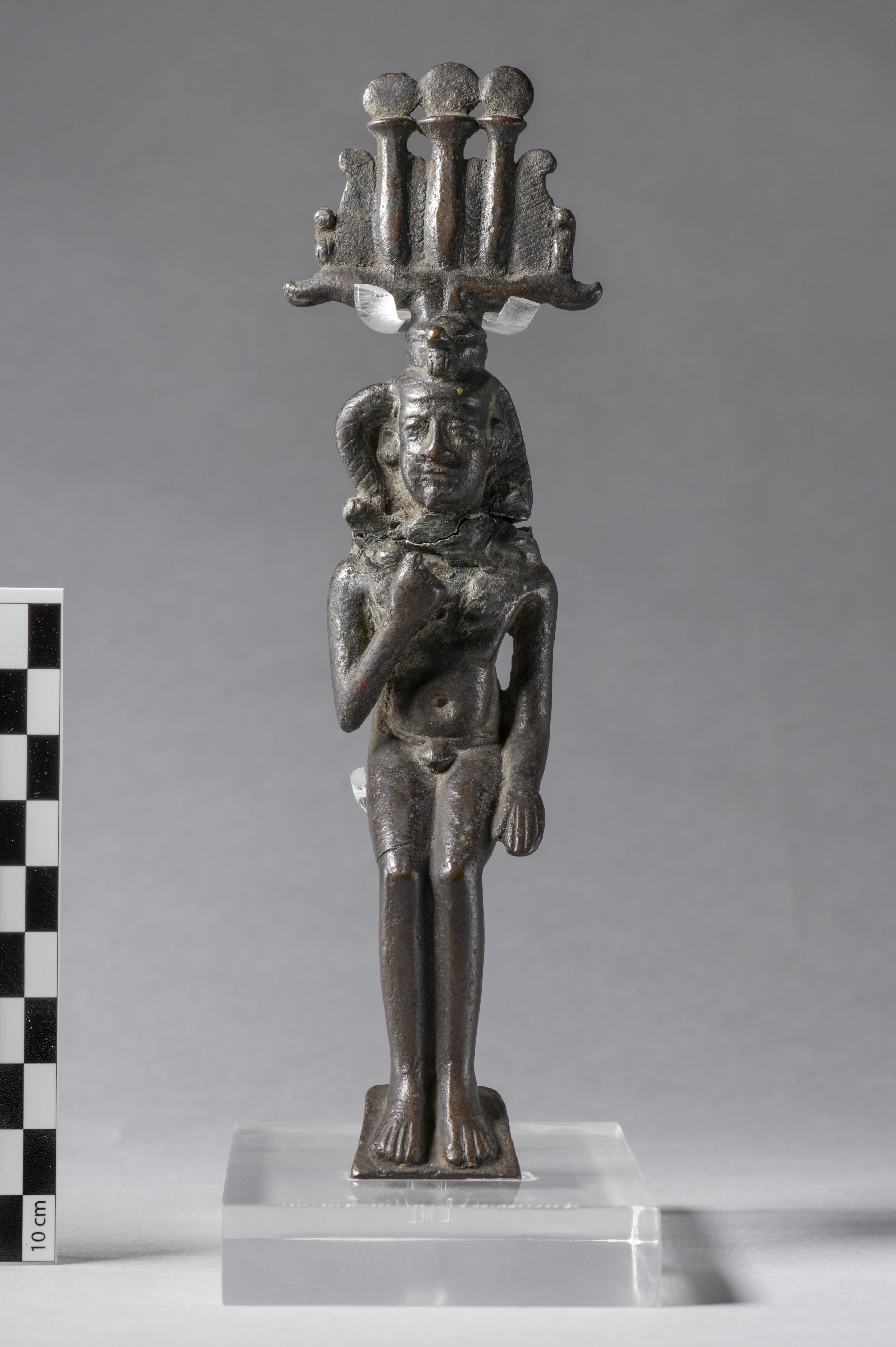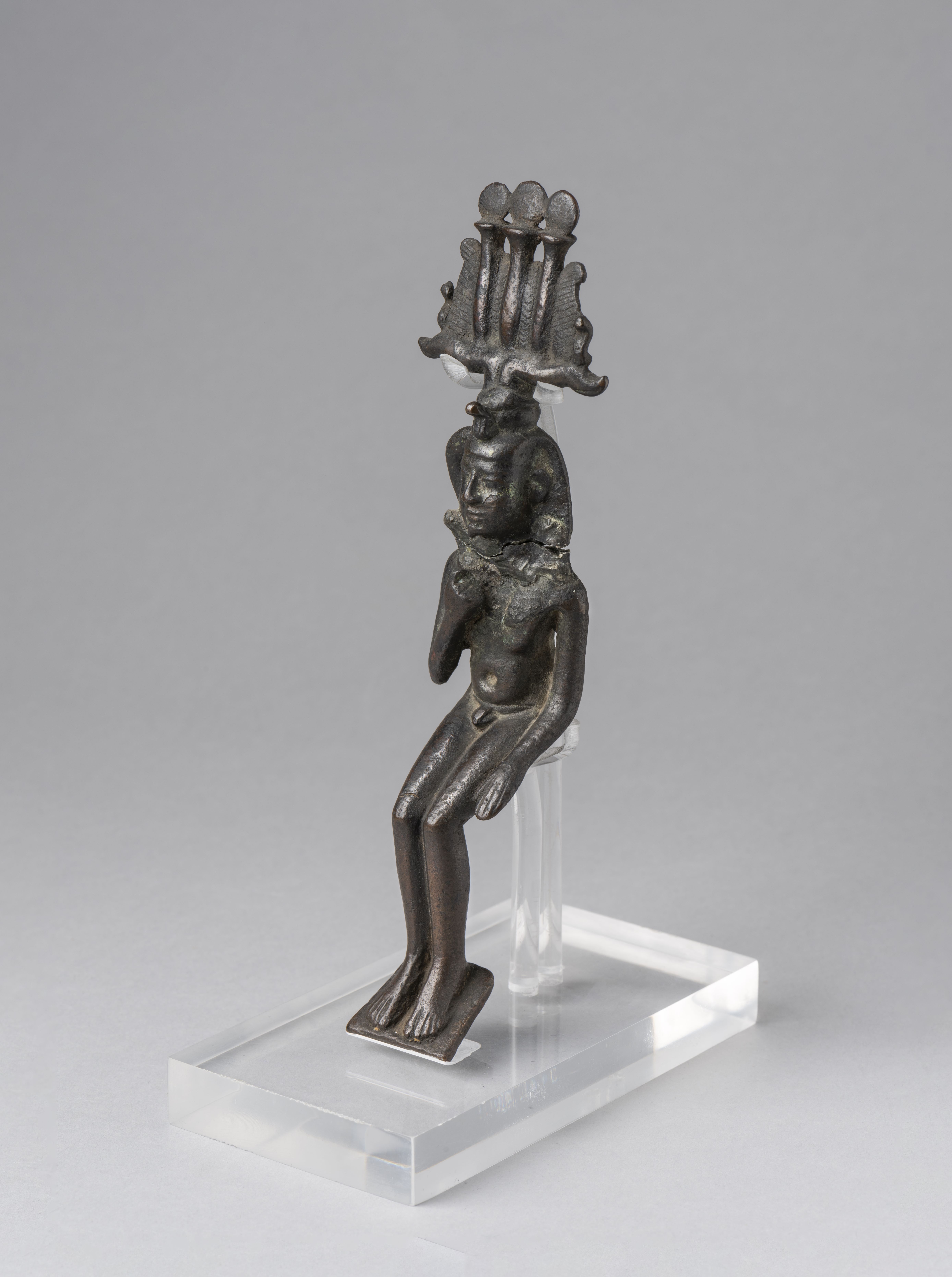 Seated, naked figure of Harpocrates. The head is detached from the body. The god is depicted with the side-lock on the right side of the head, ending with a curl. Harpocrates has the nemes, surmounted by the hemhem-crown. Harpocrates is bringing his now missing right index finger to his mouth, the left arm is at side. The feet rest on a thin trapezoidal base. The object is made in the lost-wax technique for solid casts.