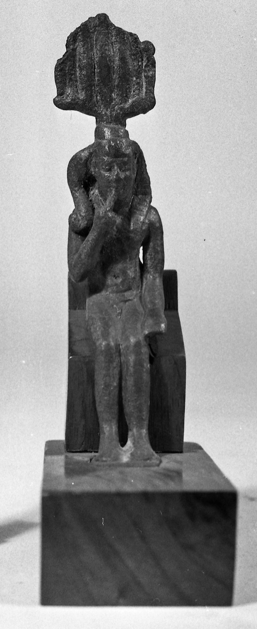 Seated, naked figure of Harpocrates. The god has the side-lock on the right side of the head, decorated with a plaited pattern and ending with a curl on the right shoulder. The god wears the nemes, surmounted by the hemhem-crown. At the back of the hemhem-crown there is a broken suspension loop, composed of two bands. Harpocrates is bringing his right index finger to his mouth, the left arm is at side, the hand open and with the pam facing down. The legs are together up to the knees. The leg muscles are slightly indicated. The feet rest on a thin rectangular base. The object is made in the lost-wax technique for solid casts.