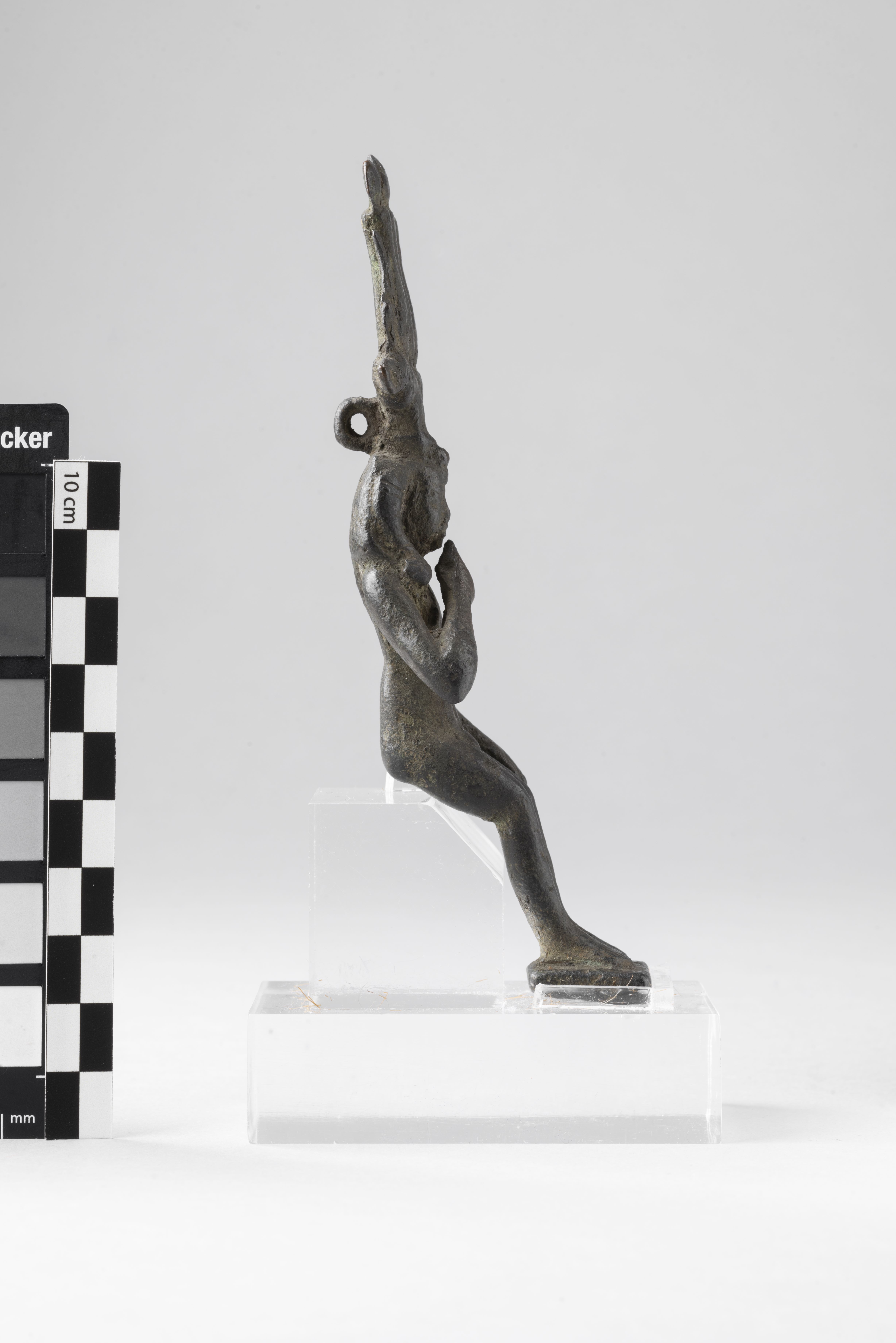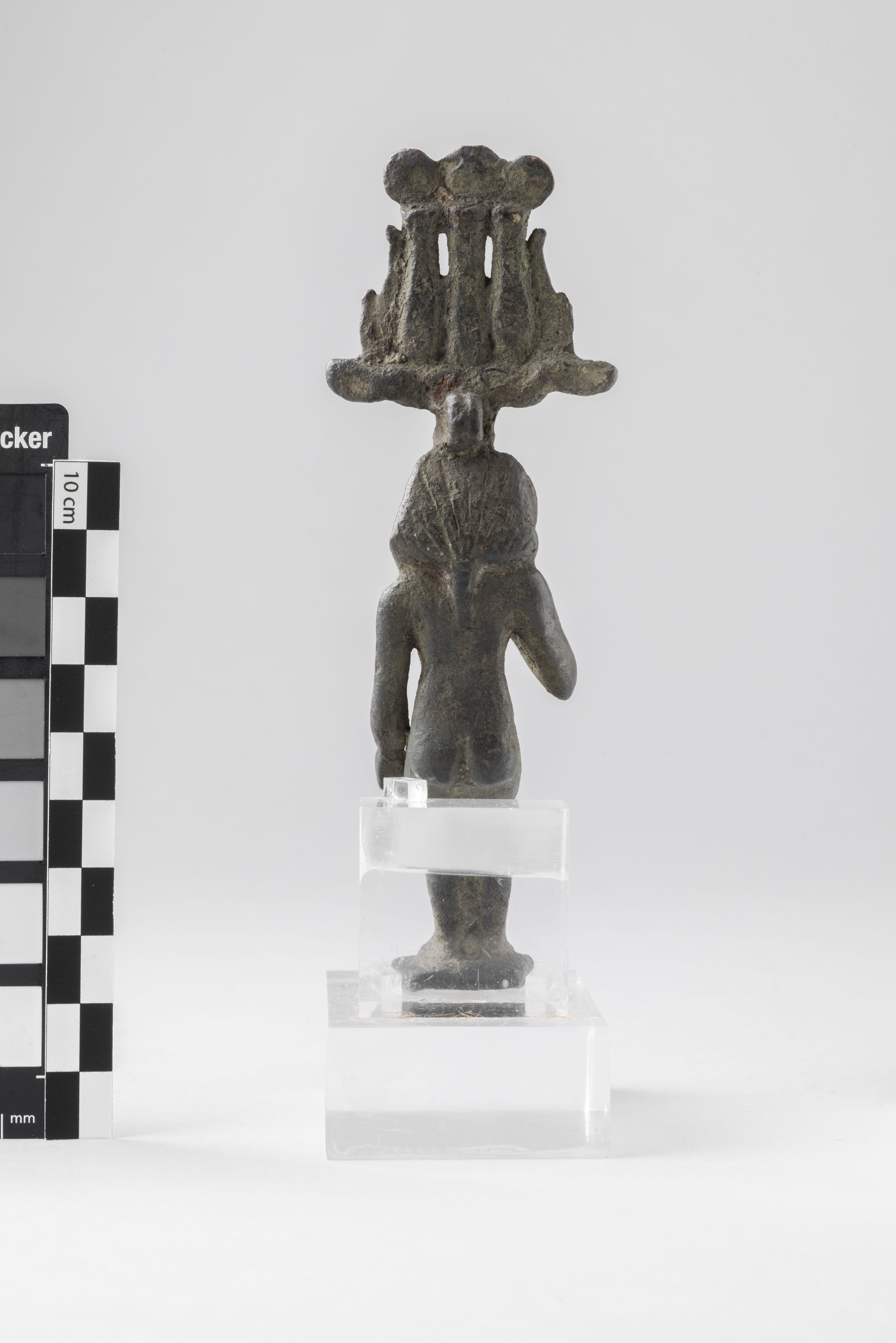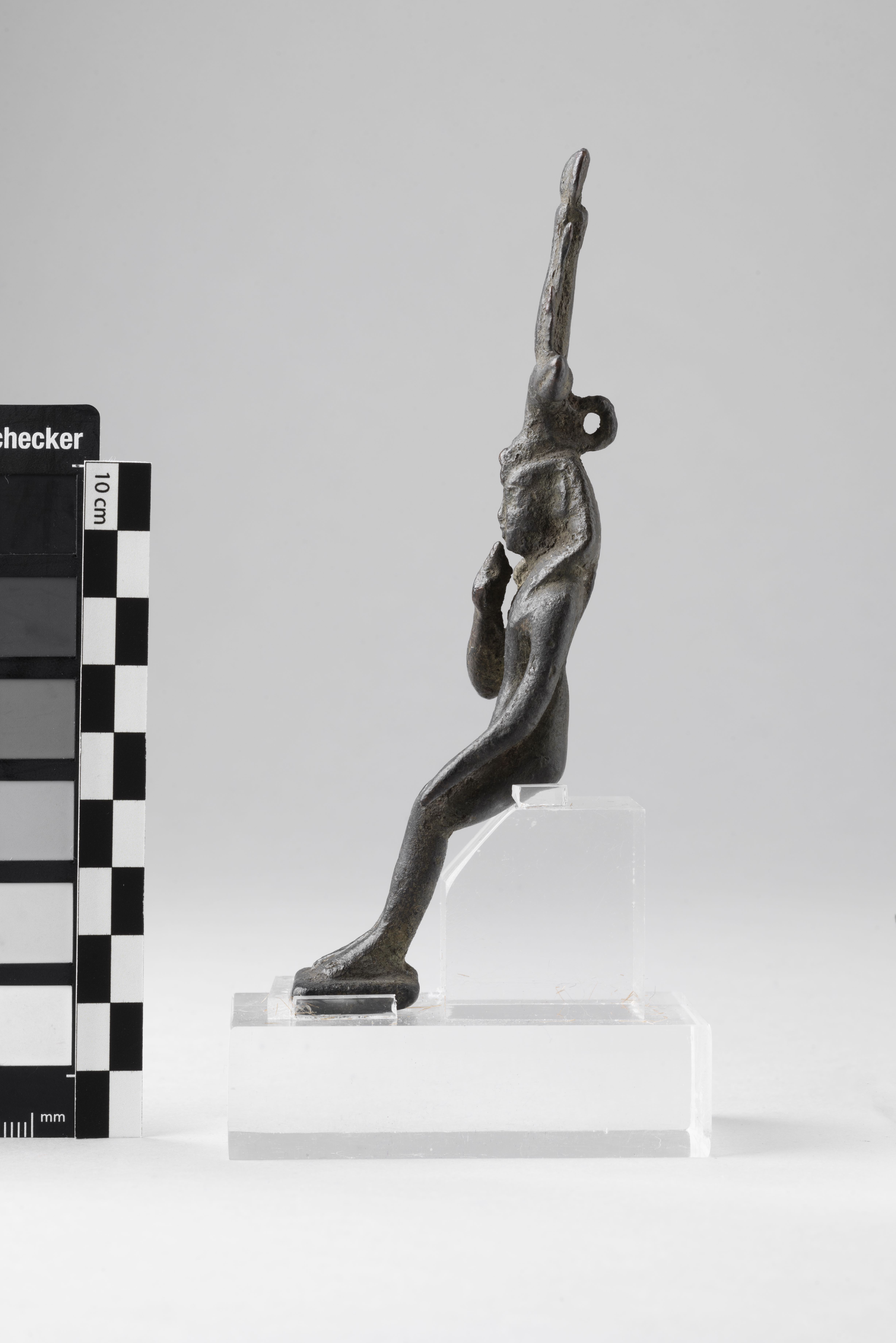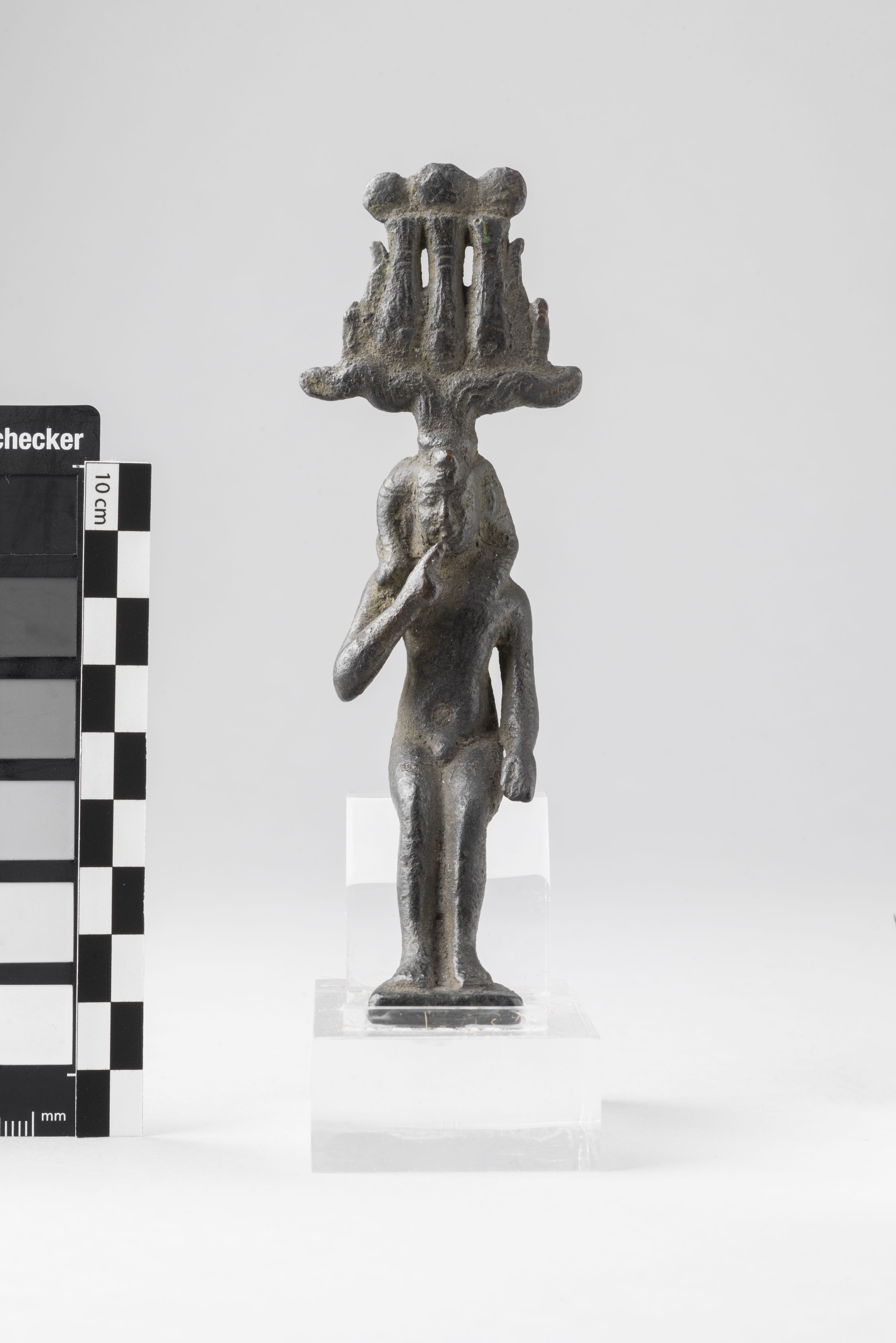 Seated, naked figure of Harpocrates. He wears a nemes, decorated with a stylised uraeus. On the back of the nemes is a suspension loop composed of two bands. The nemes is surmounted by a hemhem-crown, comprising twisted ram’s horns, a triple rush crown surmounted by solar discs, flanked by two slender feathers and two uraei. On the right side of the head is the characteristic side-lock of youth, ending in a curl on the shoulder. The face is oval, with stylised features. The god brings the index finger of his right hand to his mouth, while the left arm hangs along the body with the hand open and the palm facing downward. The legs are joined, and the feet rest on a trapezoidal base. The remnant of a rectangular-section tenon projects down from the front of the base. The object is made in the lost-wax technique for solid casts.