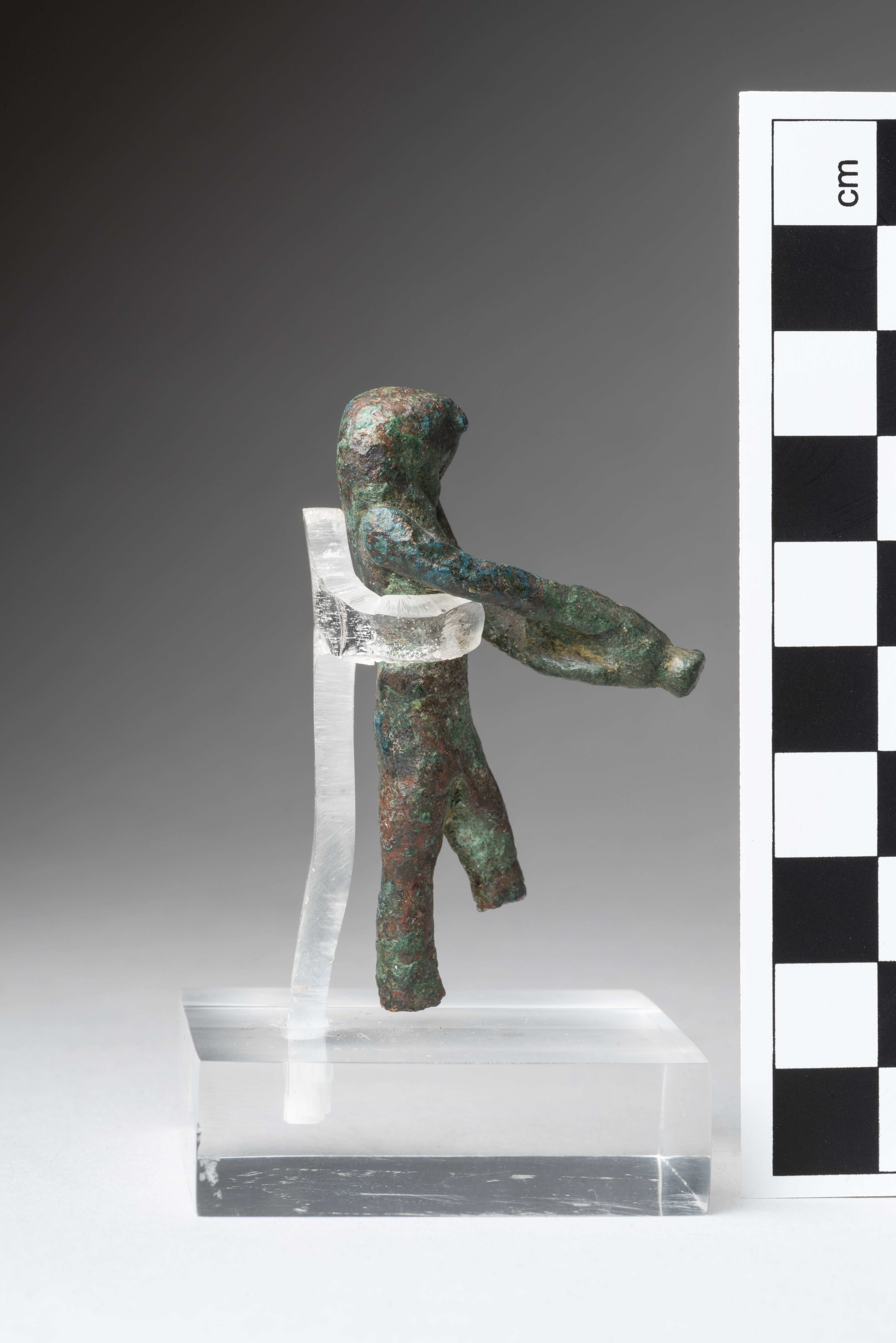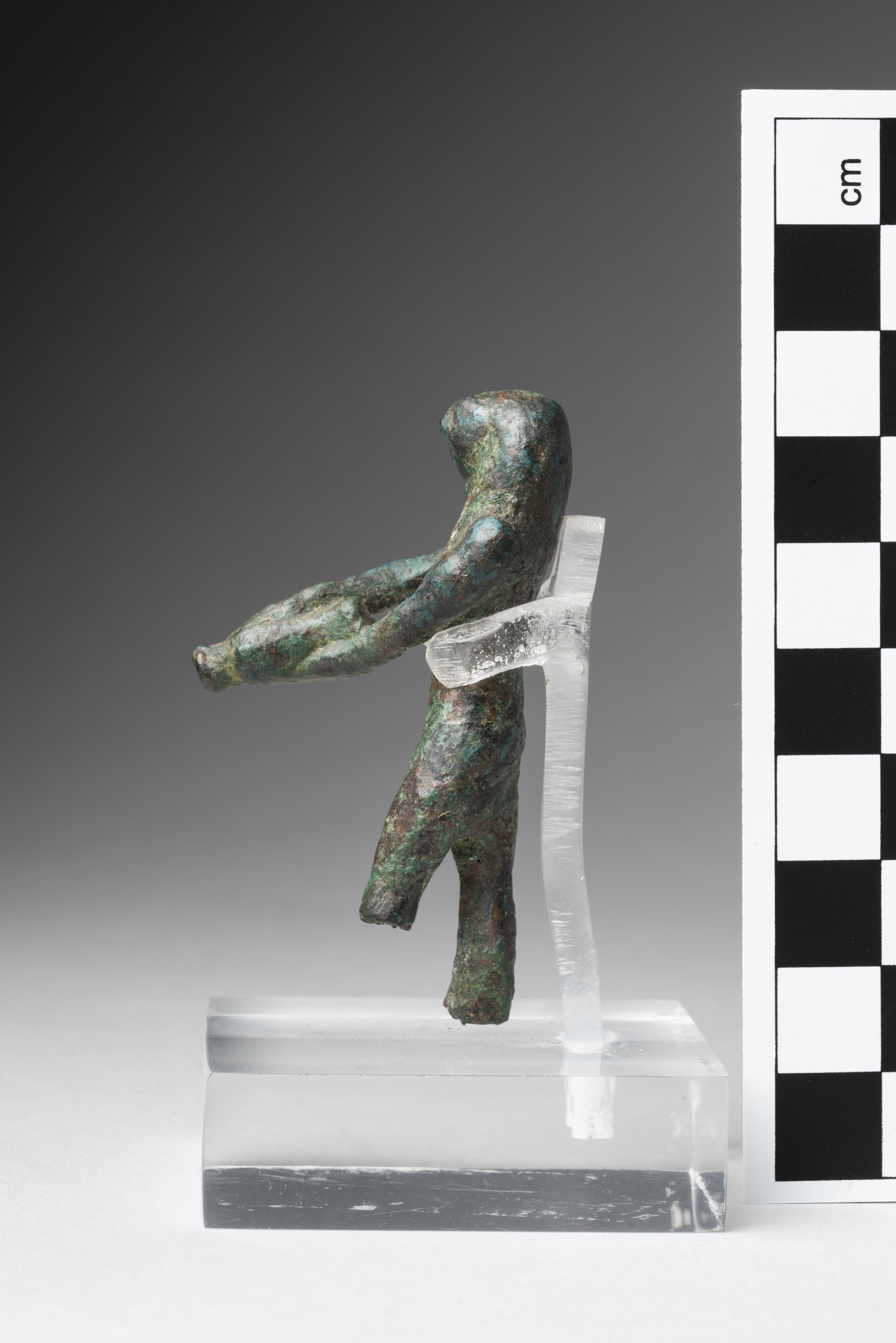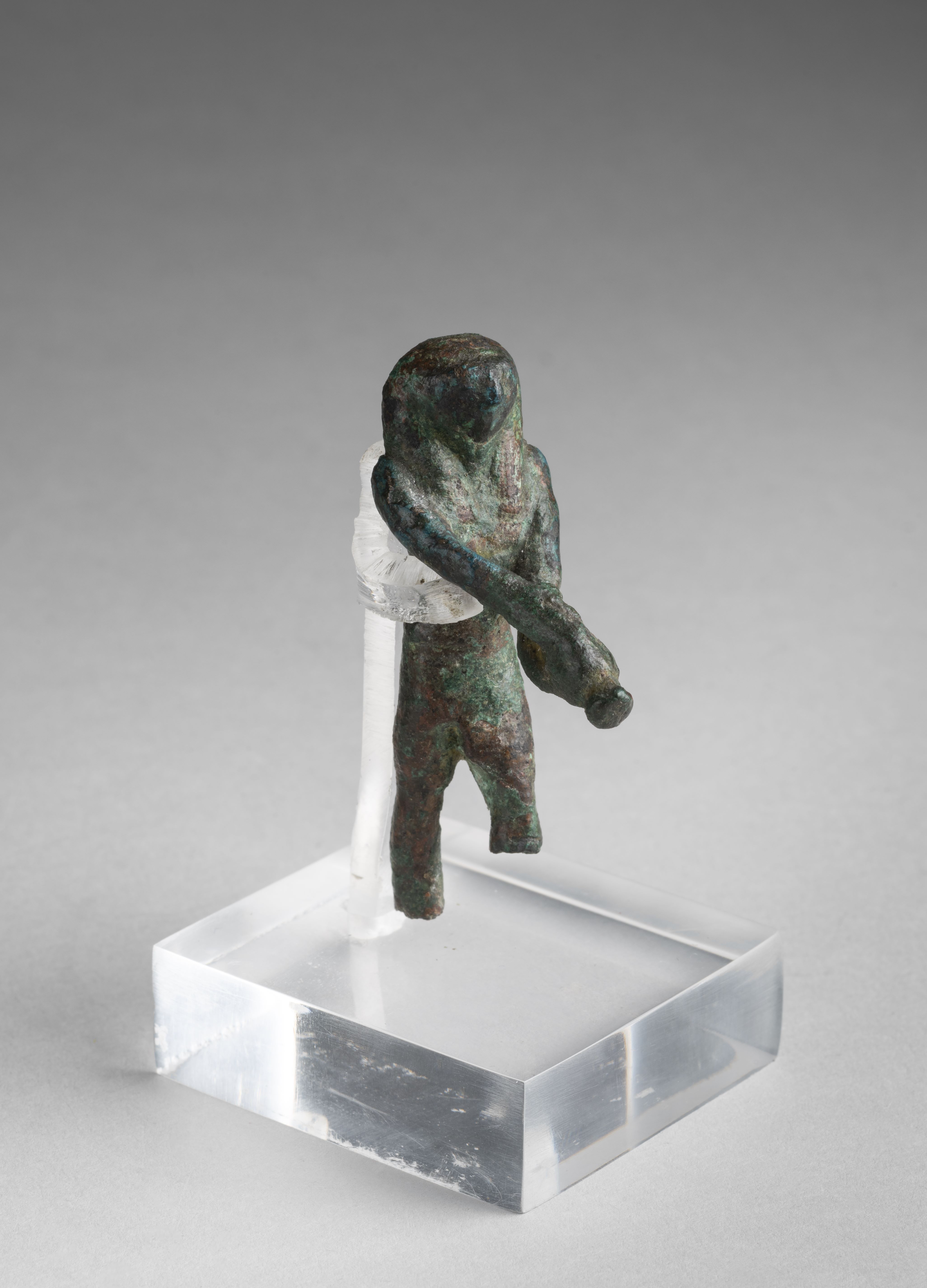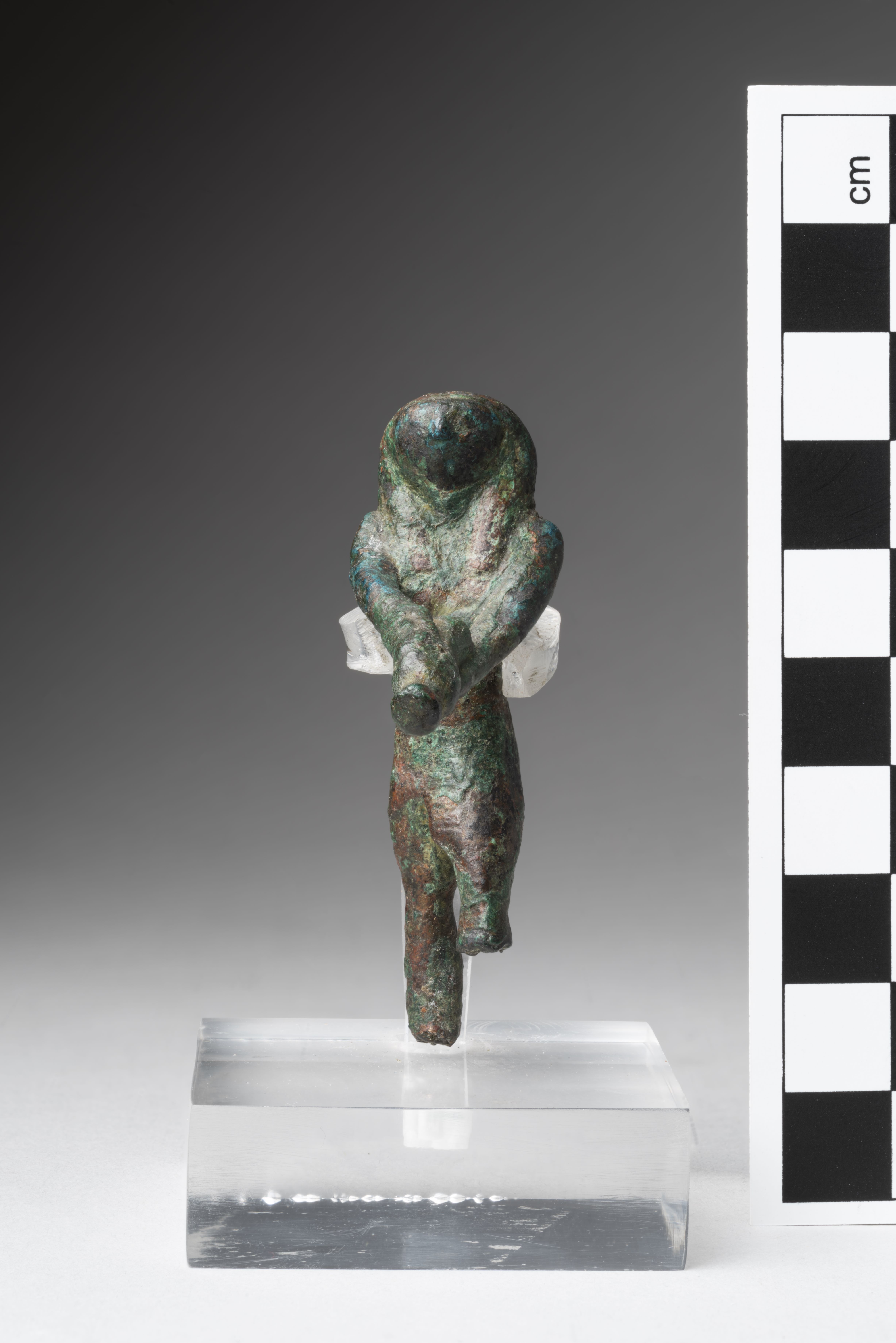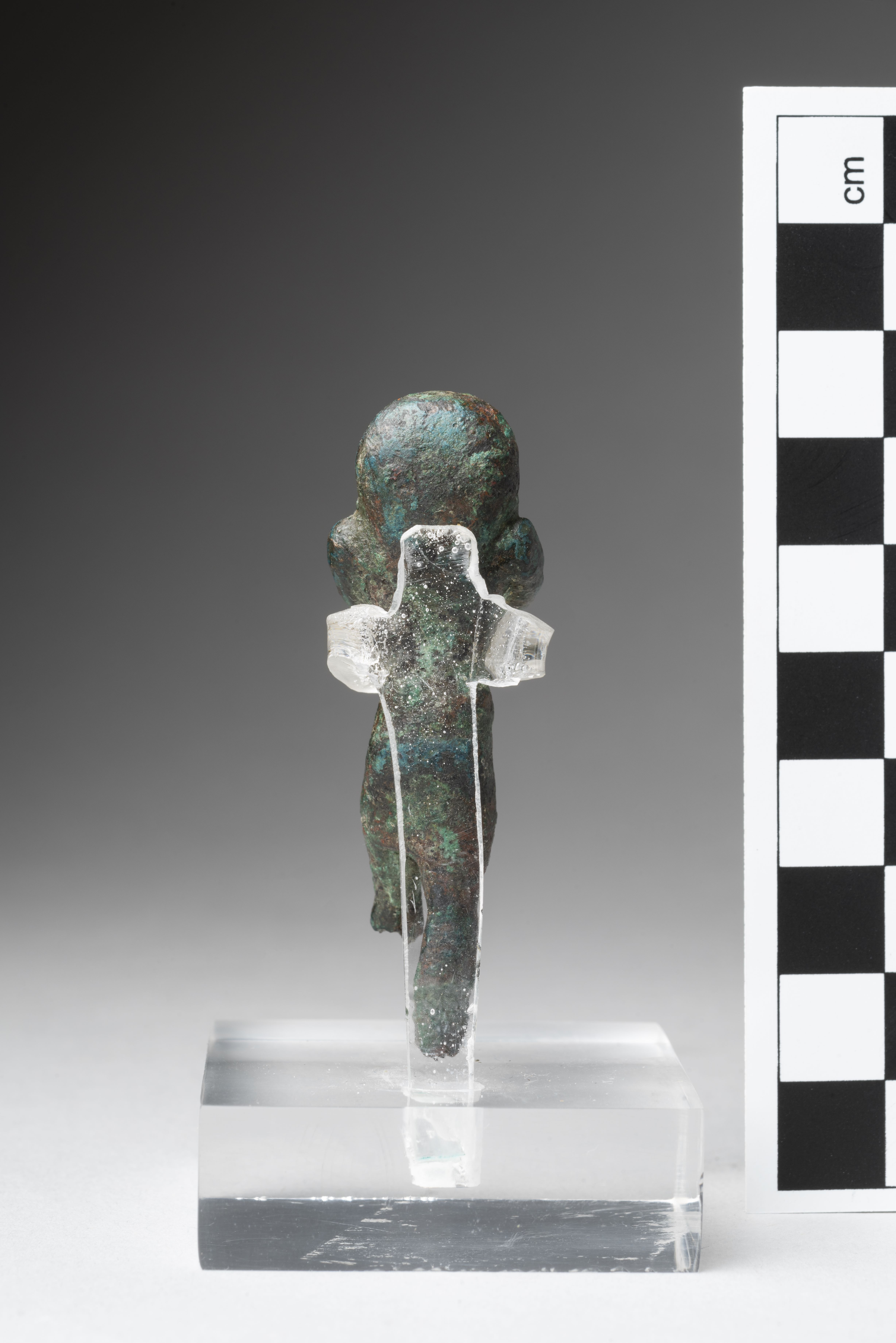 Standing figure of Horus represented as a falcon-headed, anthropomorphic deity, pouring a libation from a hes-vase. The god has a tripartite wig, the eyes are barely visible, the beak is small and slightly protruding. The god pours a libation from a hes-vase which he holds up in front of his torso with both hands. Horus has his left leg forward and he is wearing a shendyt-kilt with a central tab hanging down. The right foot is missing, the left leg is broken at mid-calf. The object is made in the lost-wax technique for solid casts.