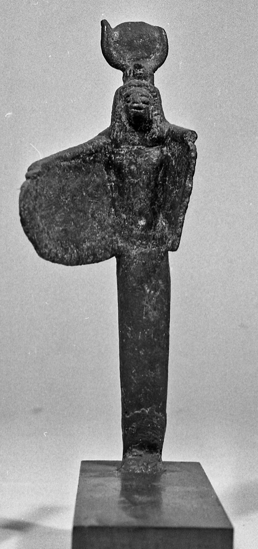Figure of winged Isis. The goddess wears a headdress consisting of a stylised uraeiform modius decorated with the uraeus, surmounted by the solar disc with cow horns. The goddess wears a tripartite wig with locks. The wings are outspread. The left wing is missing. On the right wing, the arm with the hand is discernible. The outer side of the wing is decorated with bands with small diagonal notches which reverse in the penultimate register. The legs are straight and there is a broken square tenon under the feet. The object is made in the lost-wax technique for solid casts.