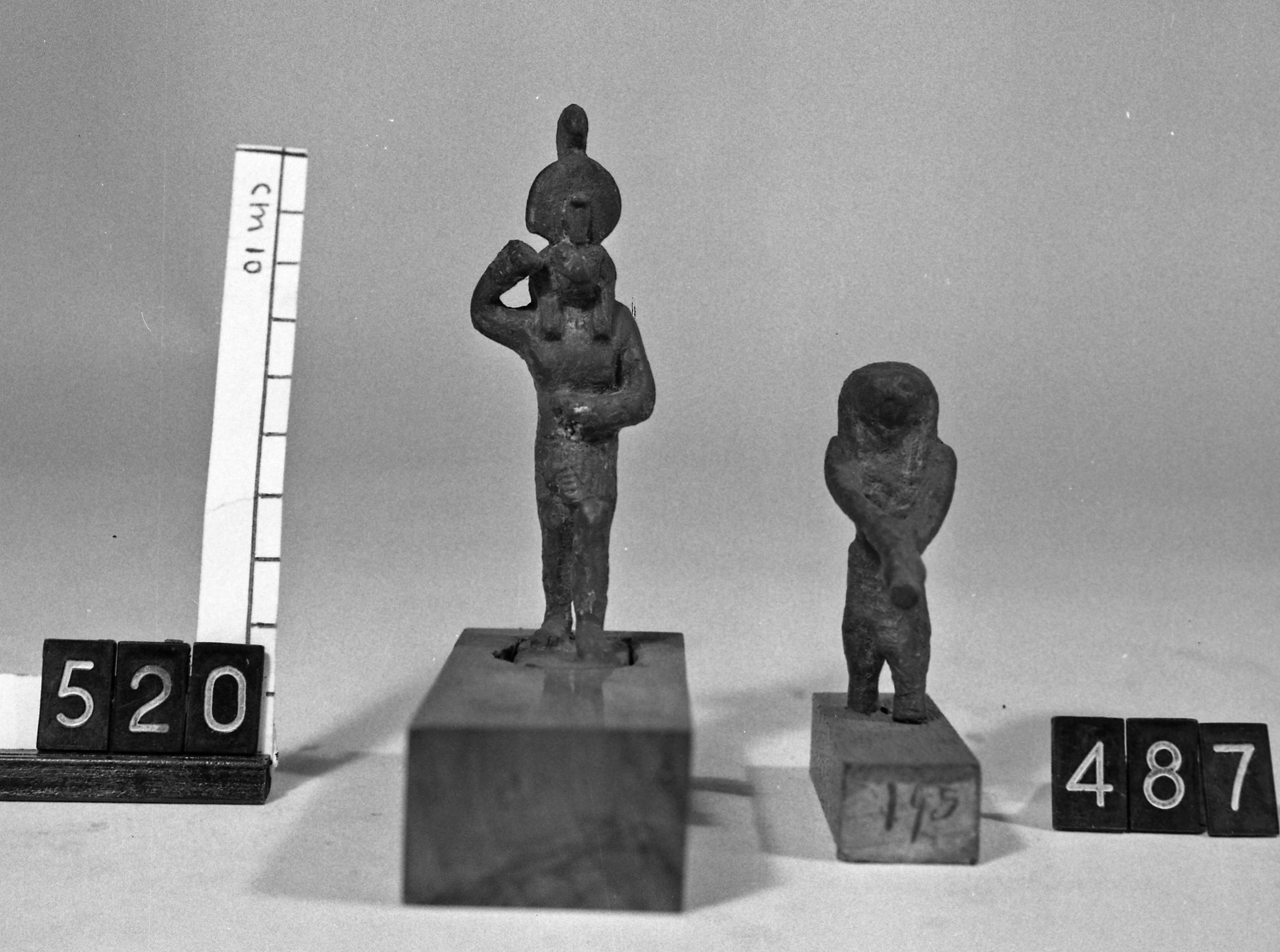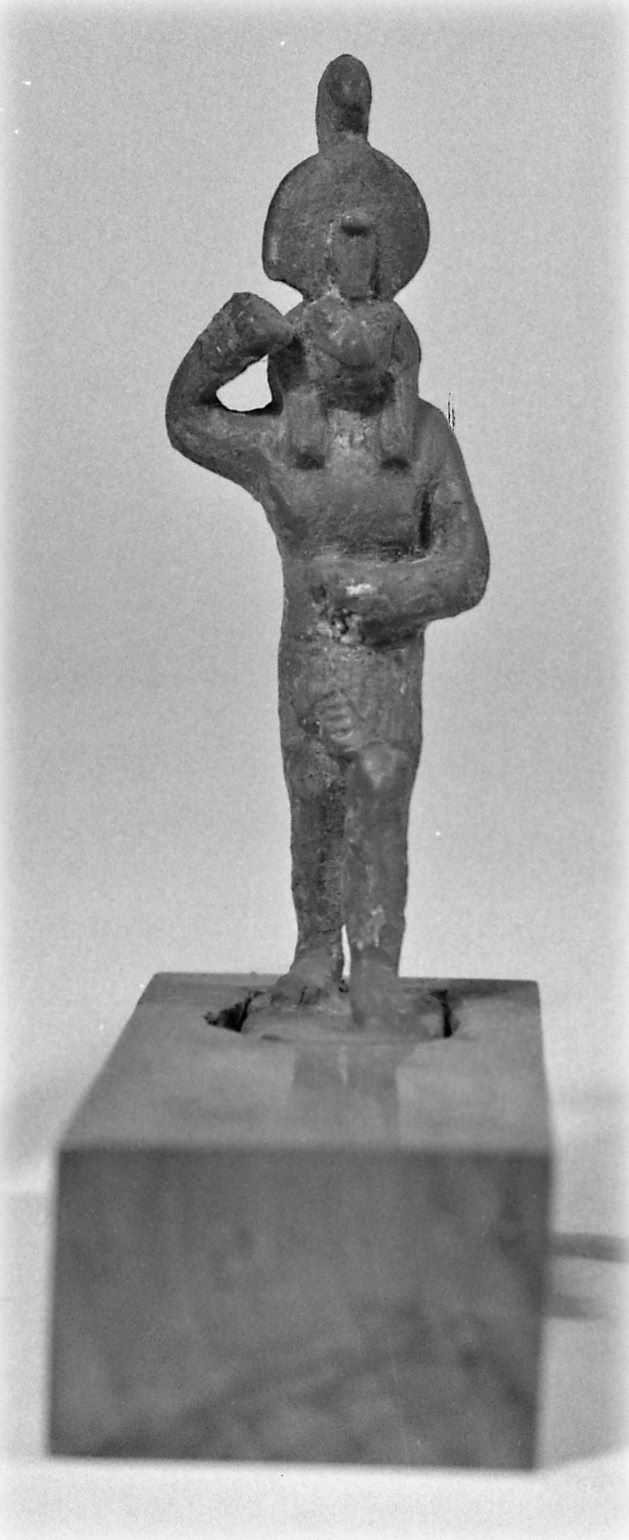 Standing figure of Horus represented as a falcon-headed, anthropomorphic deity, striding with the left leg forward. The figure may be identified as Horus spearing Seth with a harpoon, or alternatively, Horus binding Seth with a rope. The god wears a solar disk adorned with a uraeus on his head. Behind the solar disk is an element resembling a weapon—possibly an axe—and a broken suspension loop. The god has a tripartite wig, decorated with vertical streaks. The beak is curved. The right arm is raised, the hand formerly holding an object now missing. The left arm is bent and rests against the torso, with the hand clenched into a fist. Horus wears a shendyt-kilt. The feet rest on a base that is squared at the back and rounded at the front. The object is made in the lost-wax technique for solid casts.