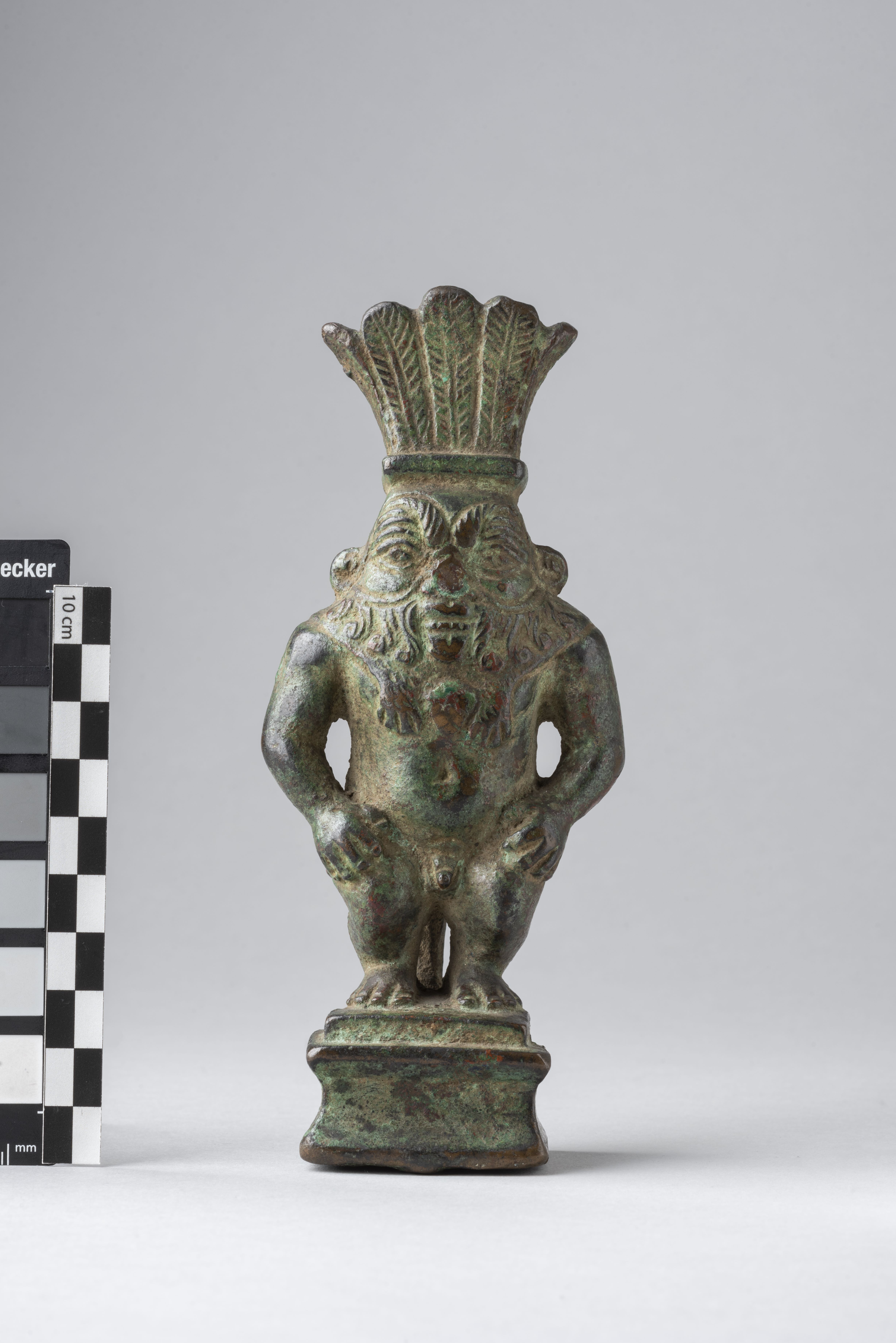 Figure of Bes. The deity wears a feathered headdress, with the plumage finely detailed; the feathers rest upon a rectangular base. The face is characterised by furrowed brows, the nose flattened and snub, the tongue protrudes, and the beard is rendered in curls. Leonine ears are visible on either side of the head. Bes is shown wearing a lion’s skin, with the paws visible across the chest and flanks. A rounded form at the centre of the chest probably represents the lion’s head. The god is depicted naked, in a squatting position with his arms arched, the hands on his legs. The tail is connected to the base. On the back, a pierced and flat bronze protrusion projects from the back, and the back of the figure is hollowed. The cavity is filled with a compact, homogeneous earthy material, grey-brown in colour. The figure of Bes stands atop a plinth, which in turn rests on a hollow square base with a recessed profile. The remnants of four square-section casting channels are present beneath each side of the base, at the centre. The object is made in the lost-wax technique for solid casts.