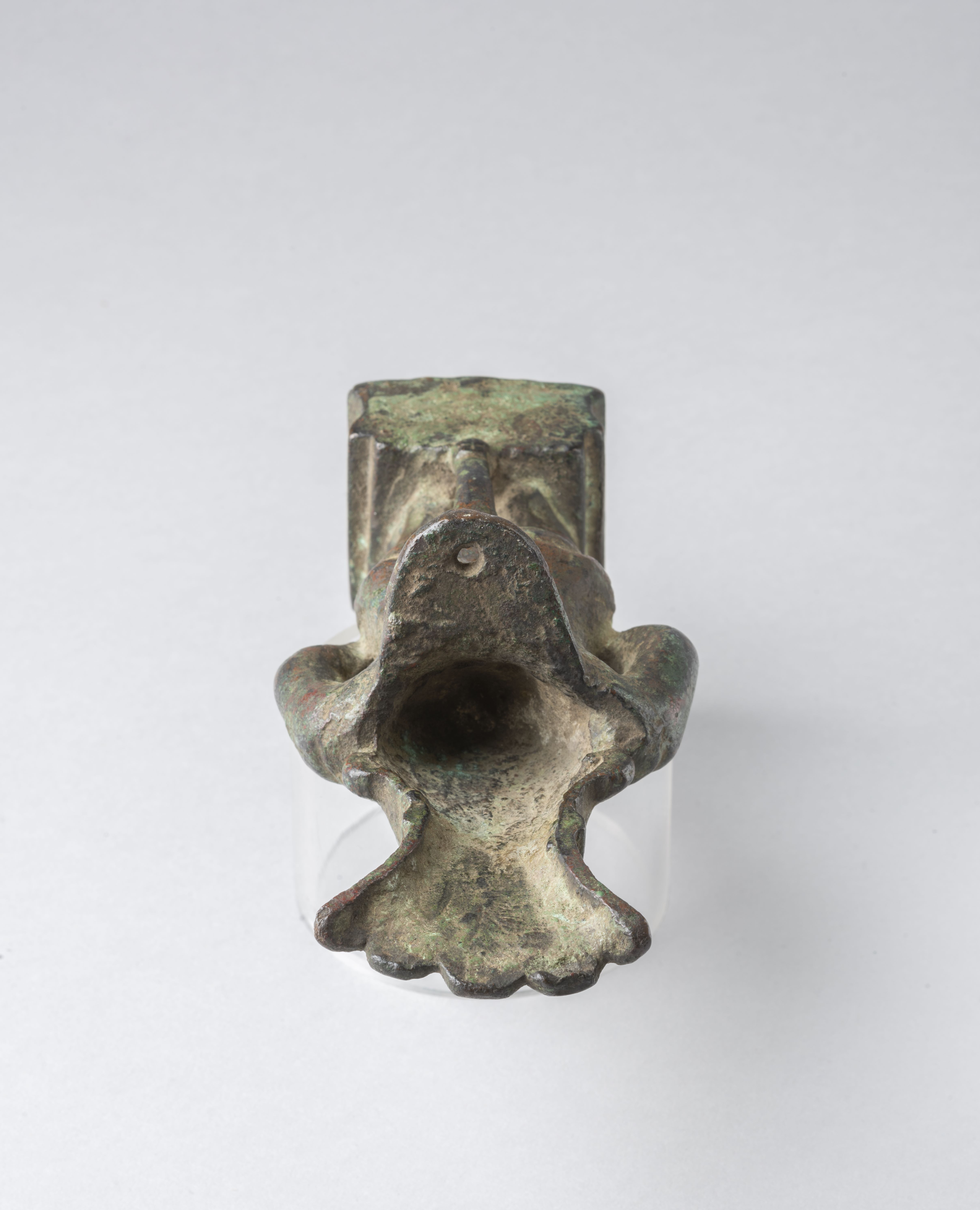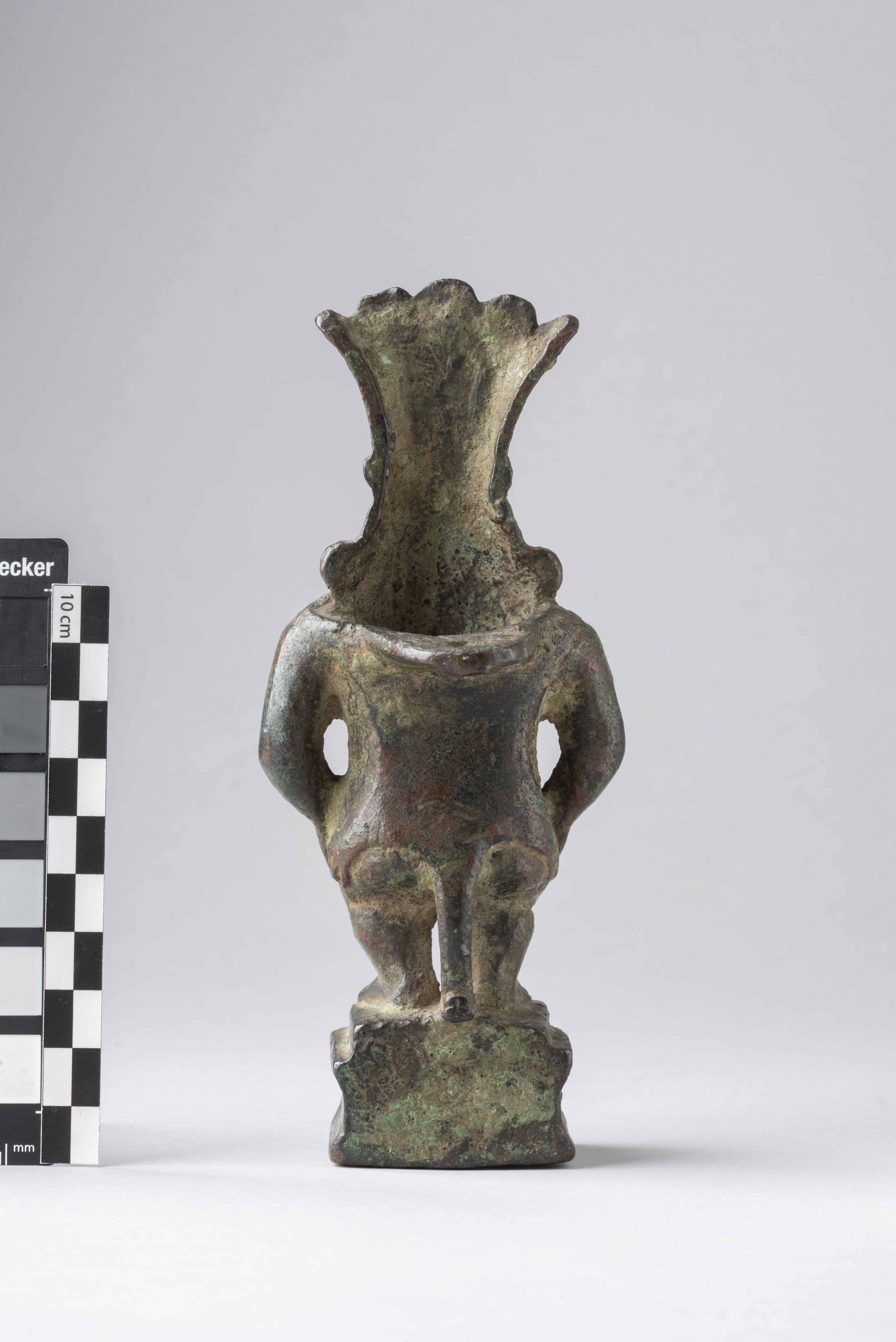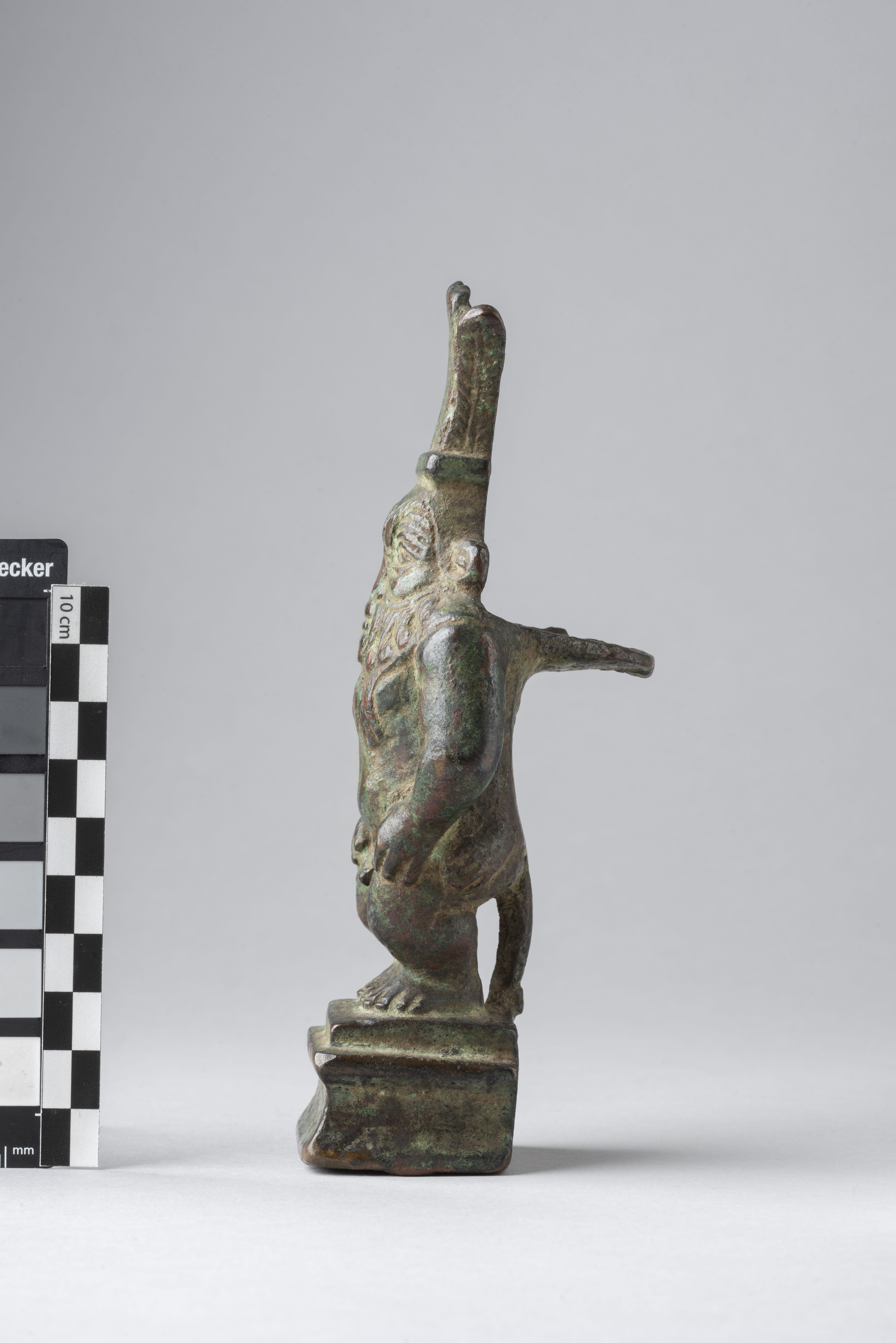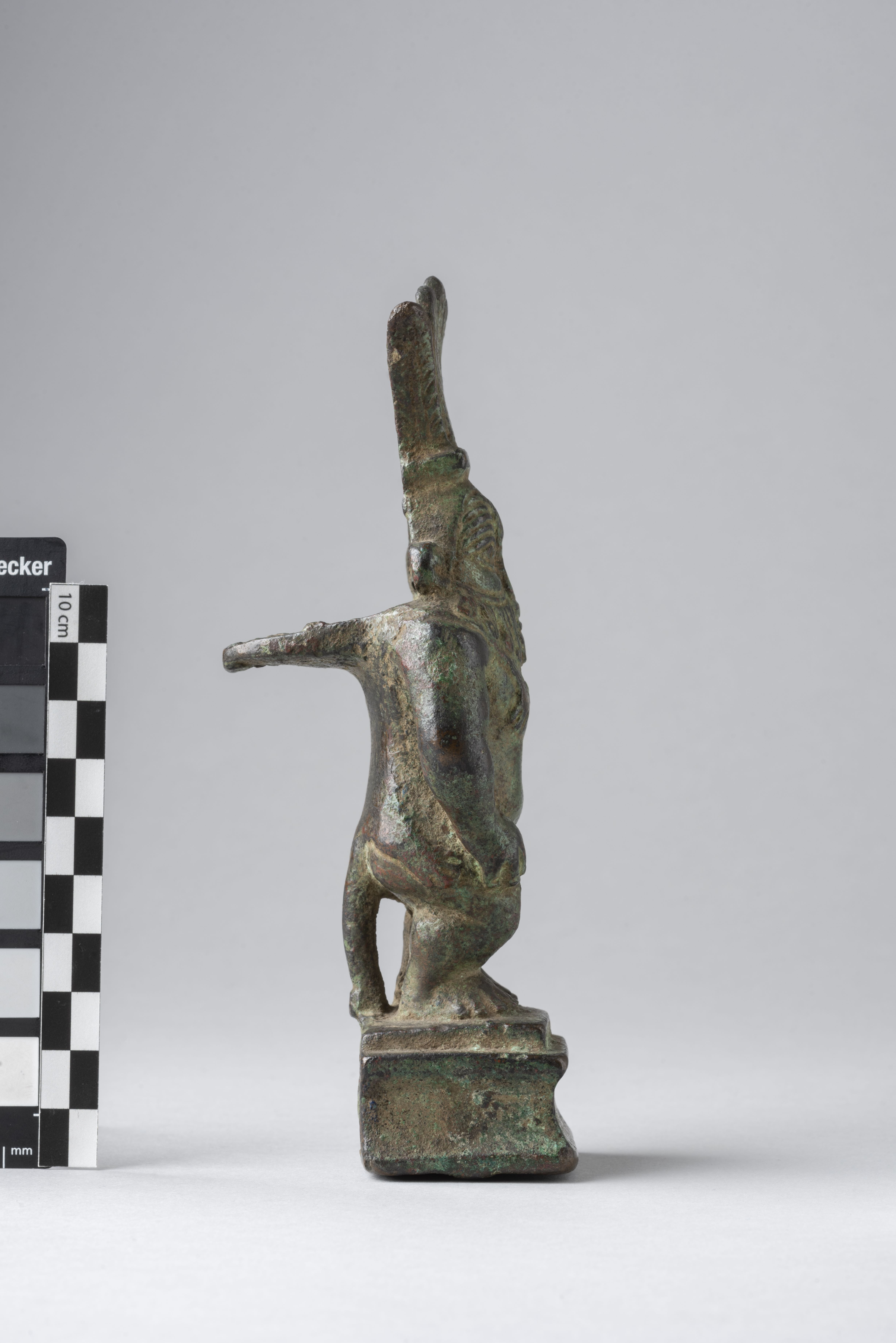 Figure of Bes. The deity wears a feathered headdress, with the plumage finely detailed; the feathers rest upon a rectangular base. The face is characterised by furrowed brows, the nose flattened and snub, the tongue protrudes, and the beard is rendered in curls. Leonine ears are visible on either side of the head. Bes is shown wearing a lion’s skin, with the paws visible across the chest and flanks. A rounded form at the centre of the chest probably represents the lion’s head. The god is depicted naked, in a squatting position with his arms arched, the hands on his legs. The tail is connected to the base. On the back, a pierced and flat bronze protrusion projects from the back, and the back of the figure is hollowed. The cavity is filled with a compact, homogeneous earthy material, grey-brown in colour. The figure of Bes stands atop a plinth, which in turn rests on a hollow square base with a recessed profile. The remnants of four square-section casting channels are present beneath each side of the base, at the centre. The object is made in the lost-wax technique for solid casts.
