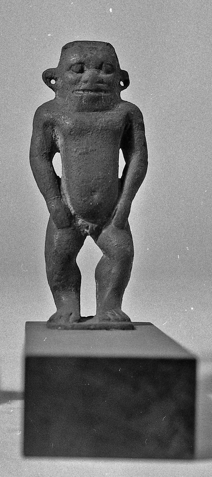 Figure of Bes. The headdress is missing. On his face, the forehead is wide, the eyes are visible, he has a snub nose, the mouth is rendered as a straight incision, the tongue is protruding and barely visible. The leonine ears are pierced, probably for earrings. The god is depicted naked, in a squatting position with his arms arched, the hands on his legs. The god has bow legs, the tail is broken. The feet rest on a square base. The figure is mounted on a modern wooden base. The object is made in the lost-wax technique for solid casts.