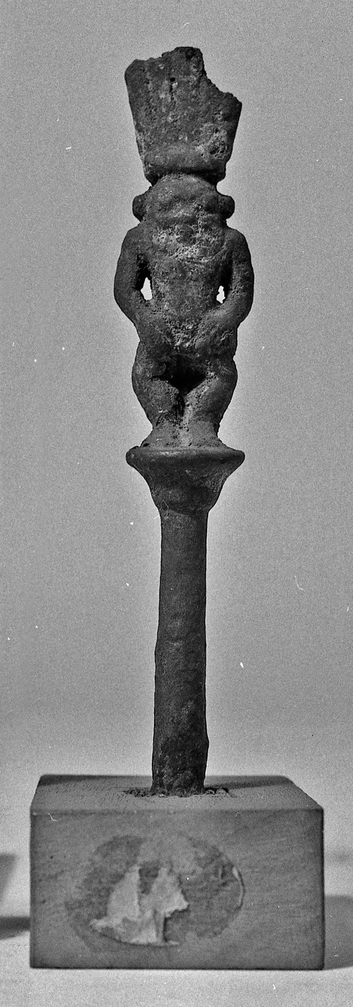 Figure of Bes on a papyriform column. He has a feathered headdress, broken at the top. At the back of the headdress there is a broken suspension loop, which is also blocked. The god’s facial features are barely visible. The leonine ears are modelled. The god is depicted naked, in a squatting position with his arms arched, the hands on his legs. The fingers are modelled. The leonine tail is connected to the column. The space between the legs is blocked, probably because of the corrosion. The figure is mounted on a modern wooden base. The object is made in the lost-wax technique for solid casts.