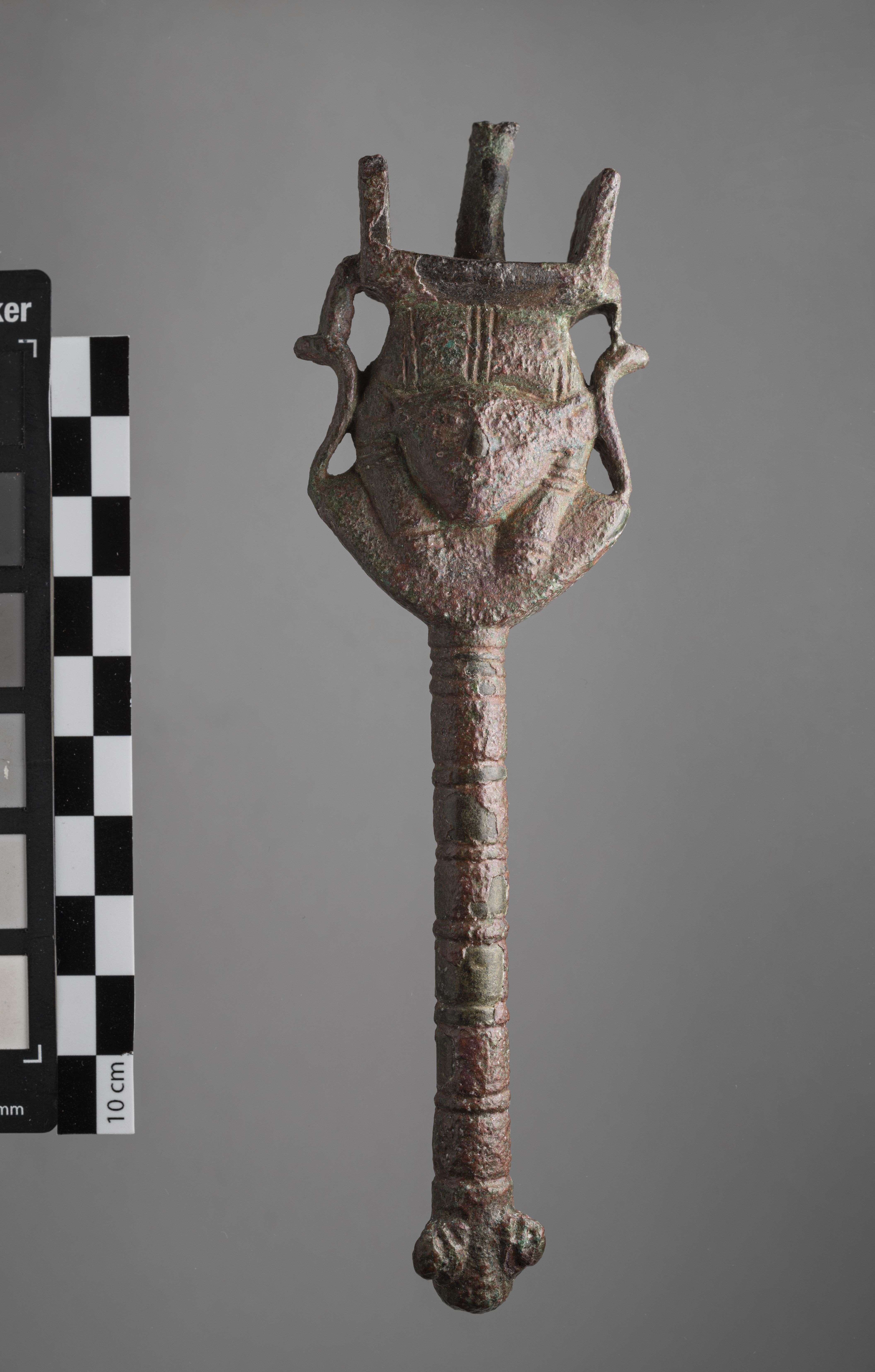 Fragmentary arched sistrum with a Hathoric protome. The arch is missing. The upper part of the object consists of a structure with a base and two vertical elements on the sides, at the centre of which sits a small, stylised cat in an attentive pose. Below this structure is the head of the goddess, who wears a decorated tripartite wig. The bovine ears are positioned on the sides, the face is triangular, the eyes are almond-shaped and outlined by a simple line, and the nose and mouth are slightly discernible. The protome is present on both sides of the object. The goddess' protome features a plain collar. On the sides, the collar, the head, and the upper structure are connected by two uraei; the one on the right side is crowned with a solar disk, while the other has a white crown. The object is completed by a handle with three raised bands below the protome and five additional raised bands. The final part is round with three circular protrusions. The object is made in the lost-wax technique for solid casts.