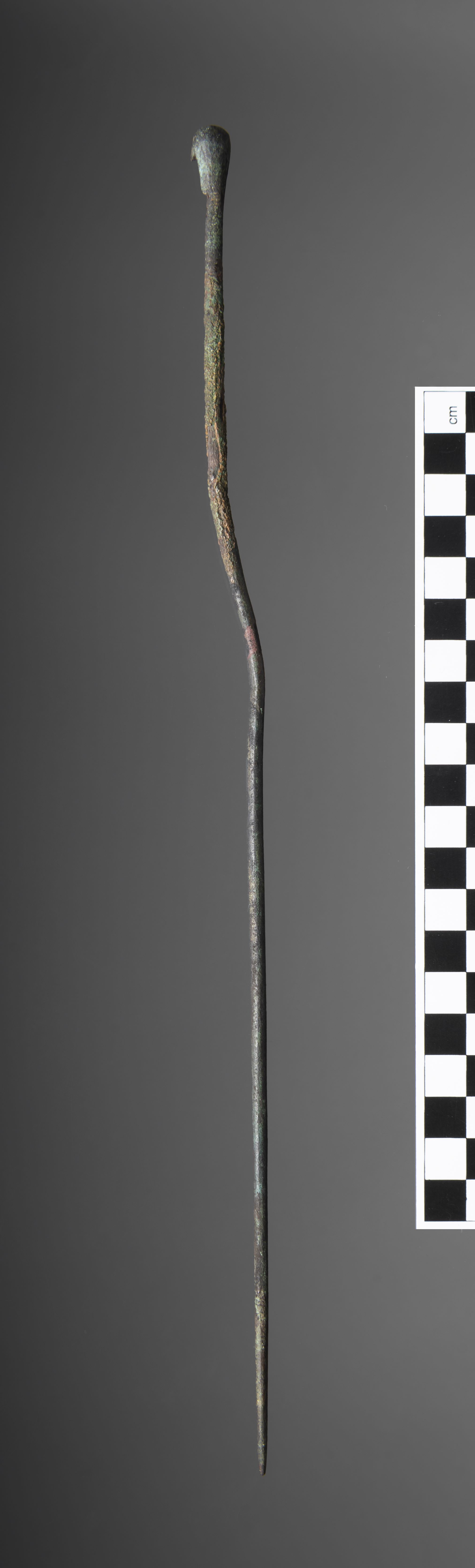 Game piece consisting of a long, thin, and slightly bent stem, surmounted by a stylised falcon head. The object is made in the lost-wax technique for solid casts.