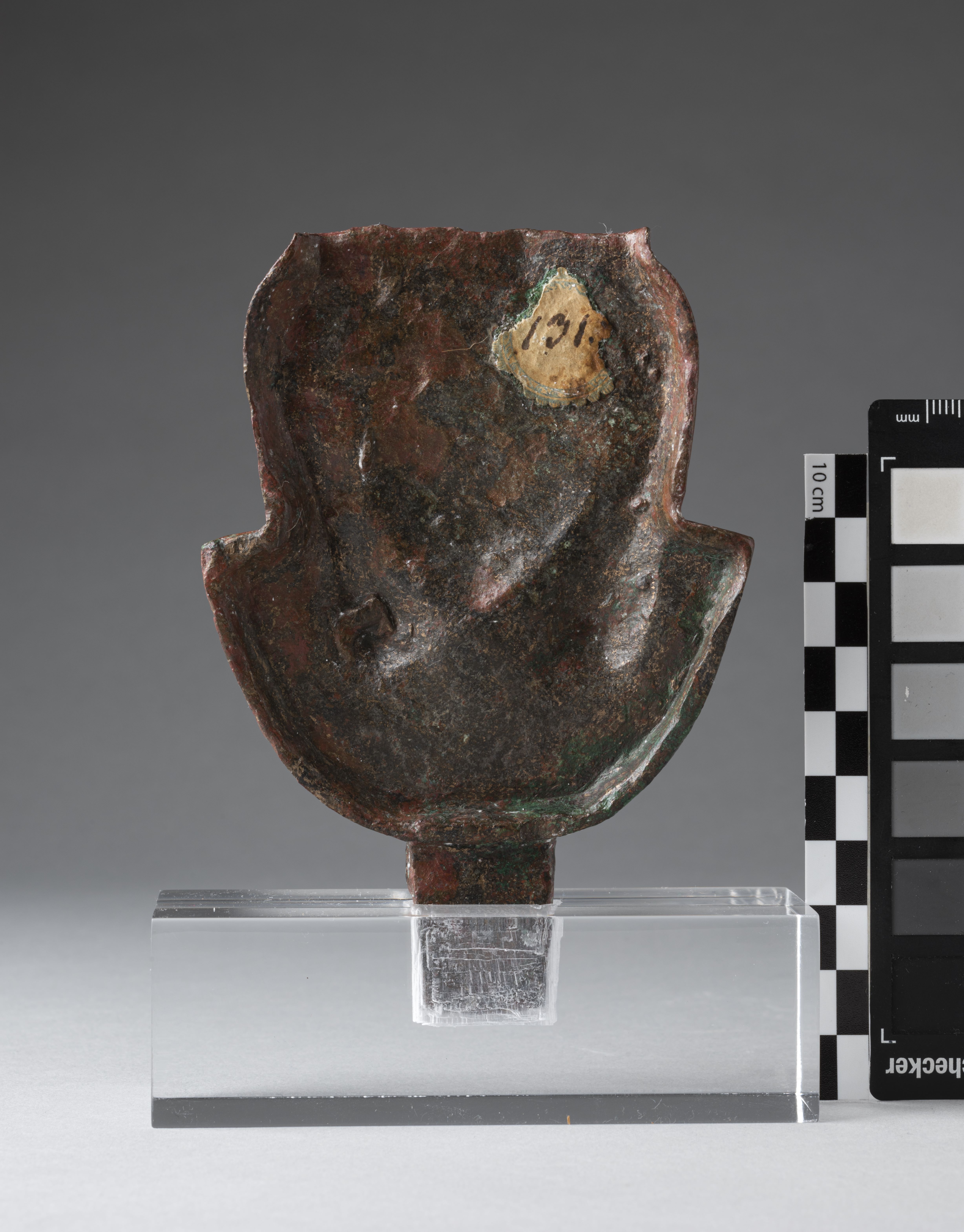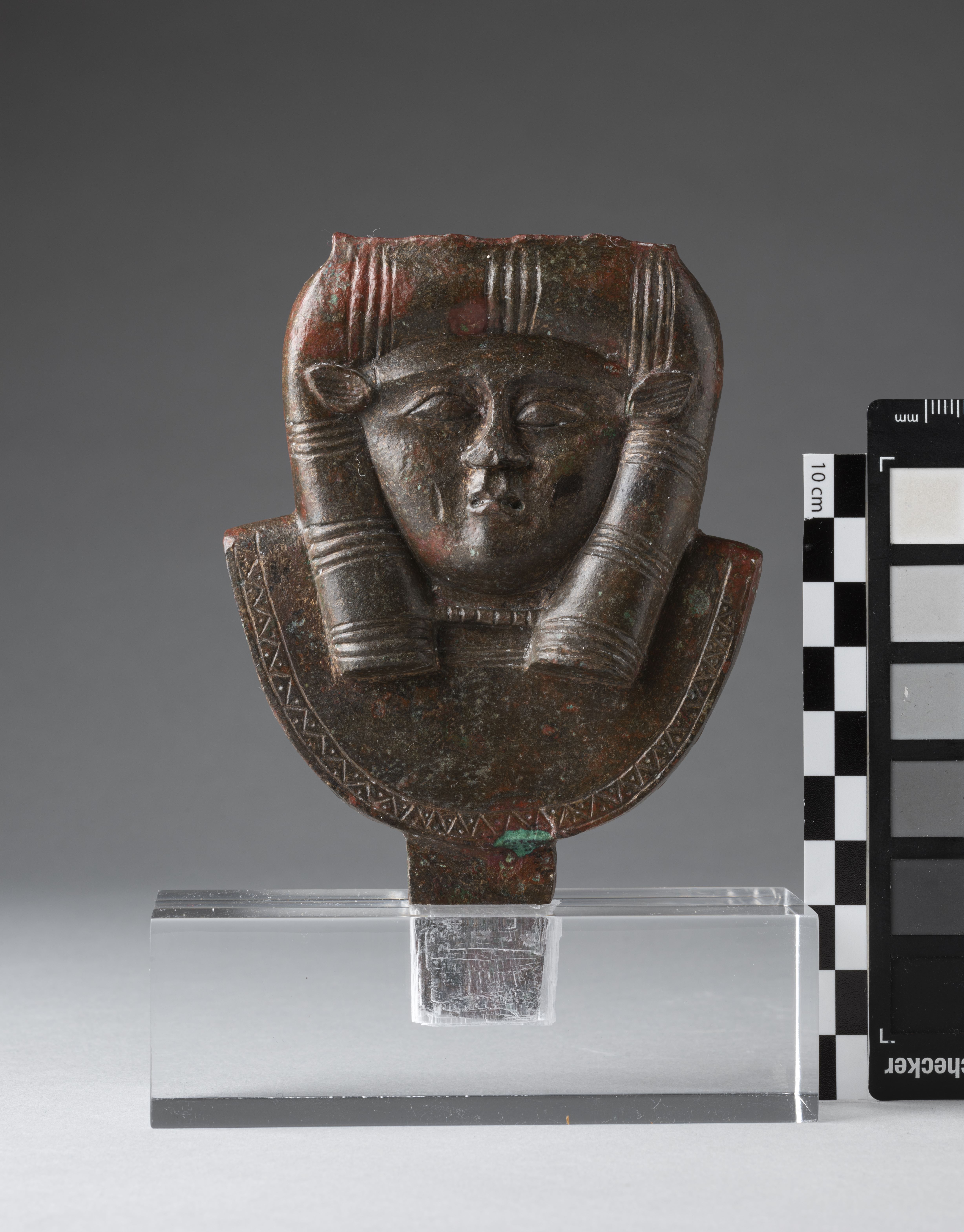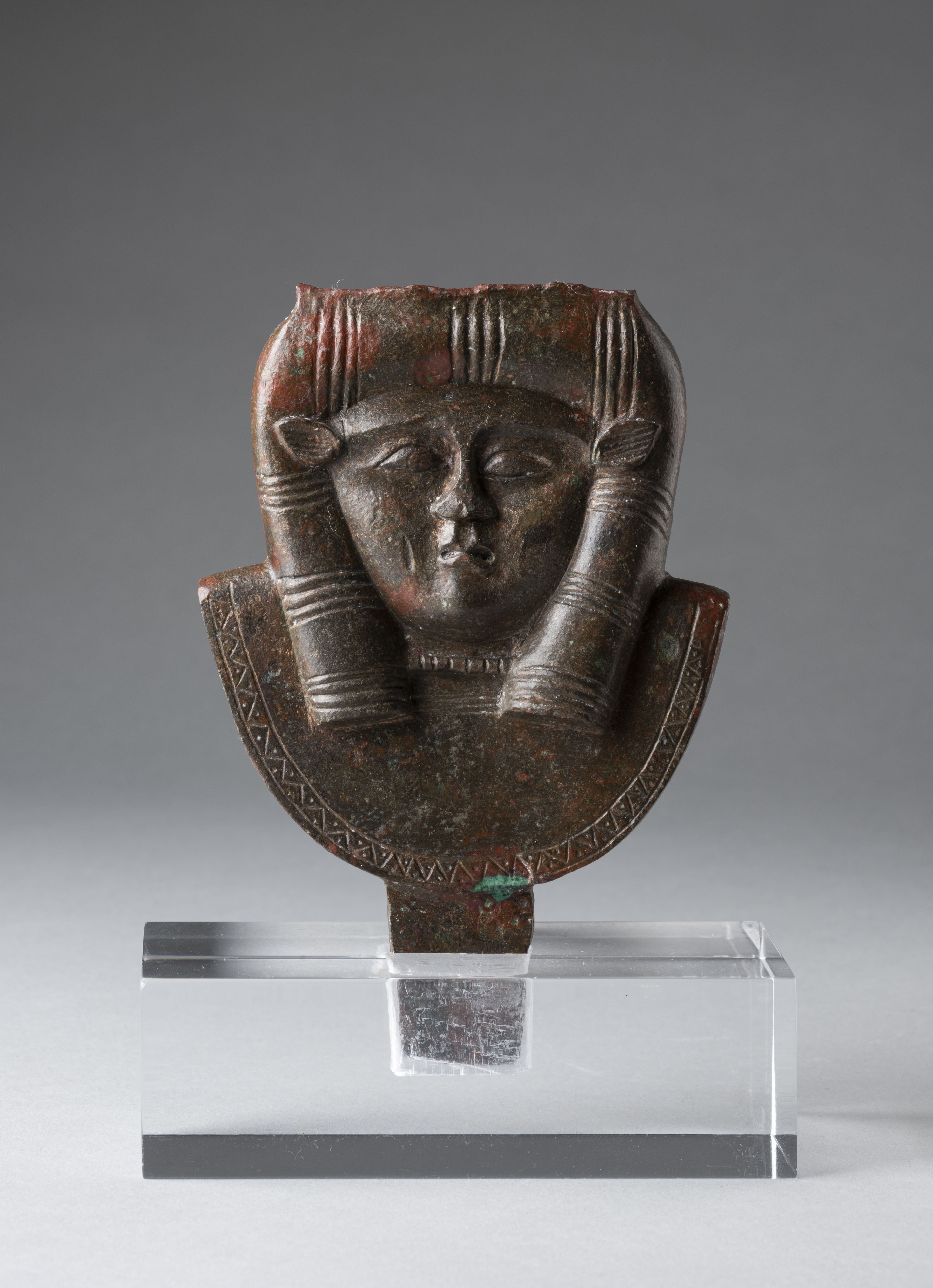 Decorative element consisting of an aegis with hathoric head. The goddess’ headdress is broken. The goddess has a decorated wig. The goddess has bovine ears, the eyes are set in a recess that highlights the eyebrows; the eyes are almond-shaped, elongated at the outer corner, and outlined by a simple line. The nose is wide, the mouth small, and the philtrum columns between the nose and lips are accentuated. The protome of the goddess features a plain wesekh-collar, the lower part has a register decorated with a zigzag pattern and dots. The back of the bronze object is concave, and the edges are raised. The object terminates in a massive rectangular tenon. The presence of a tenon and the decoration only on one side do not support the interpretation of the object as a sistrum; instead, the tenon suggests that the object was designed to be mounted somewhere, and the flat back suggests that the object was supported by a flat surface at the back, possibly serving as a decorative element. The object is made in the lost-wax technique for solid casts.
