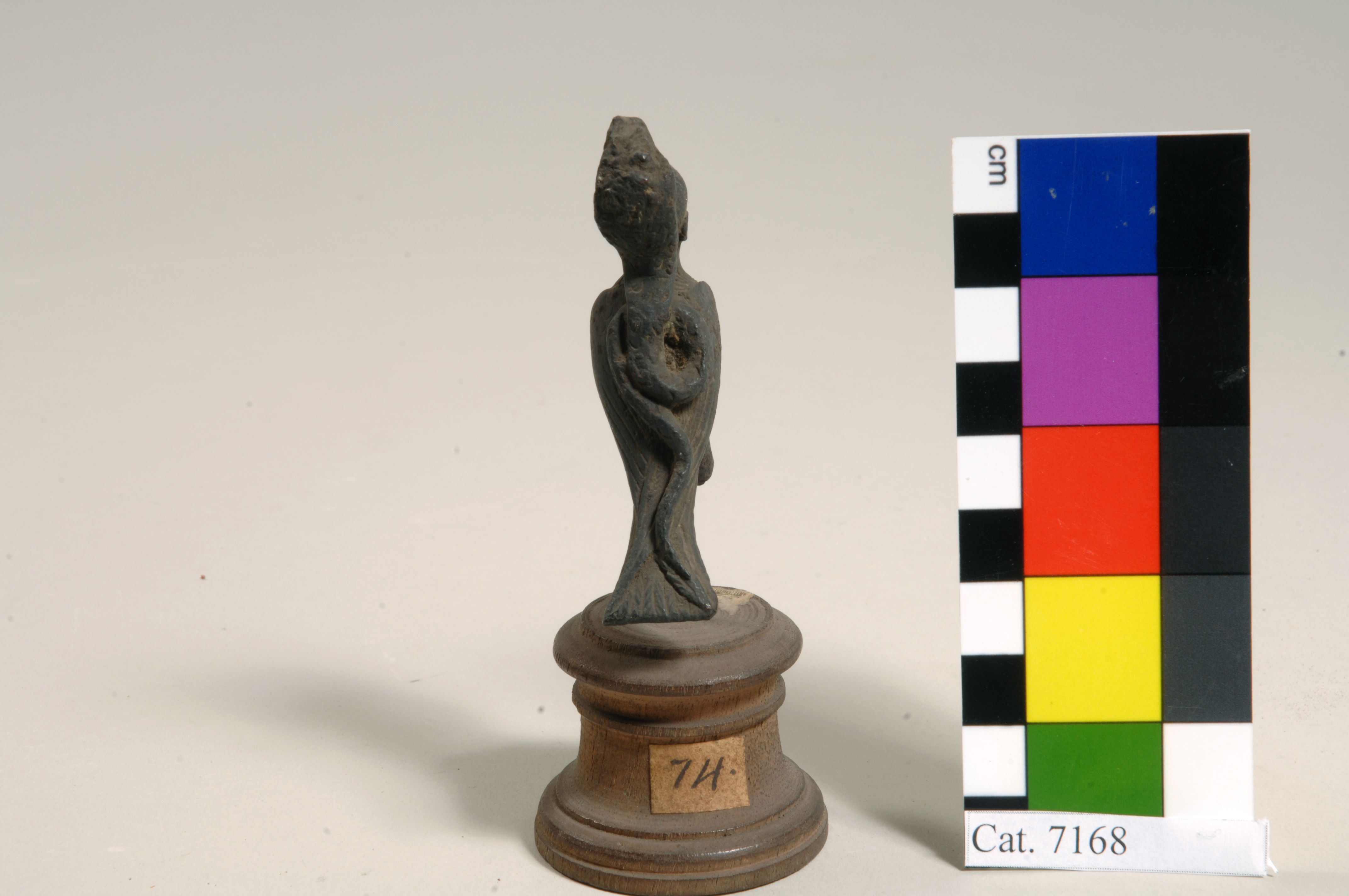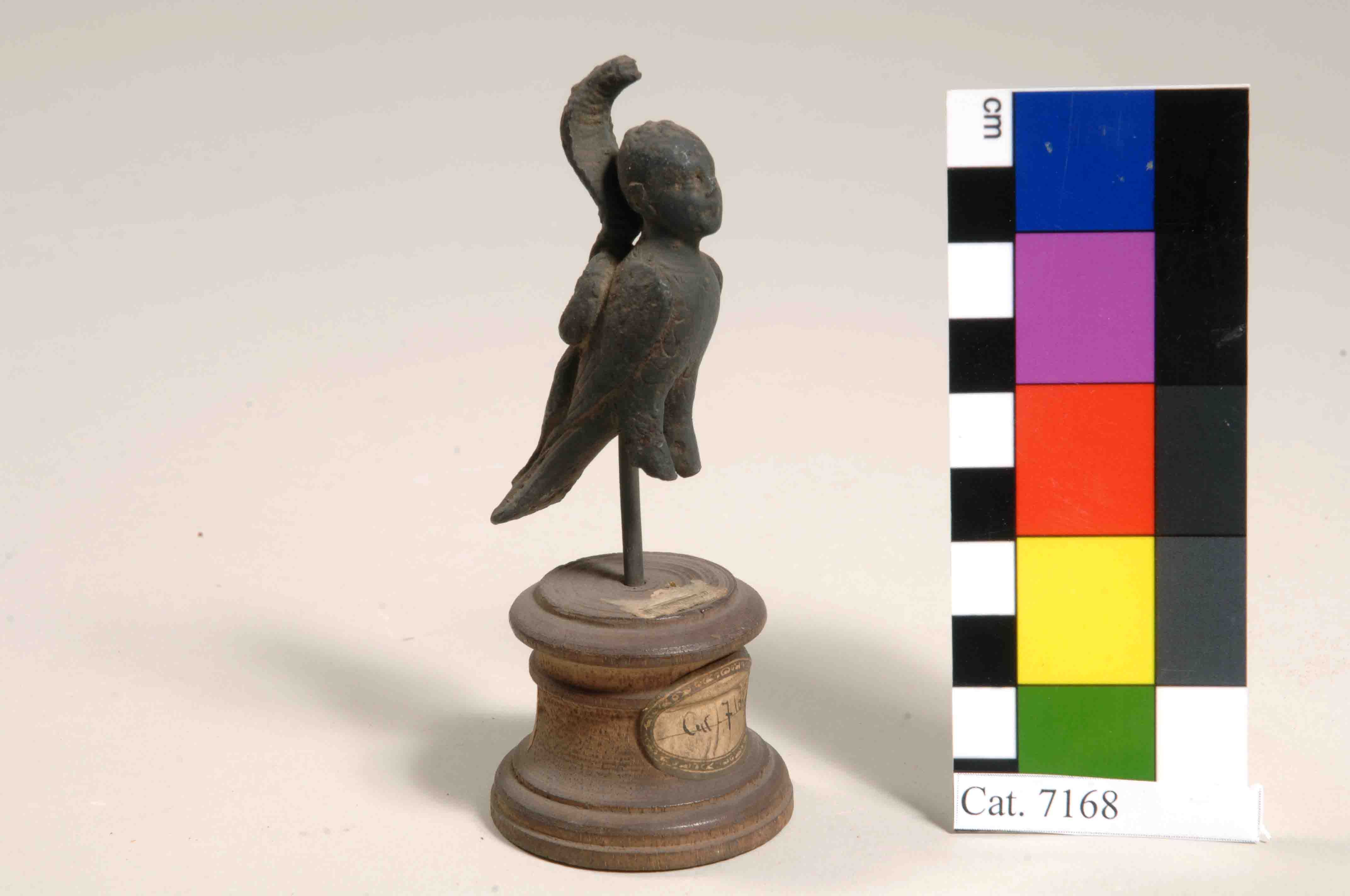 Figure of a Harpy. The figure has a female head with curly hair. The figure has a necklace with a round pendant. The bird-like body is finely detailed. The wings are folded, and the torso and upper part of the wings are decorated with a loop pattern representing the plumage details. The wings cross over the tail. A cobra is present on the back of the figure, its head extending above the human head. The cobra’s tail is coiled and continues sinuously to the end of the bird's tail. The bird’s trousers are indicated, and the legs are broken. A modern metal pin is inserted in the figure, securing the statuette to a wooden base. The object is made in the lost-wax technique for solid casts.