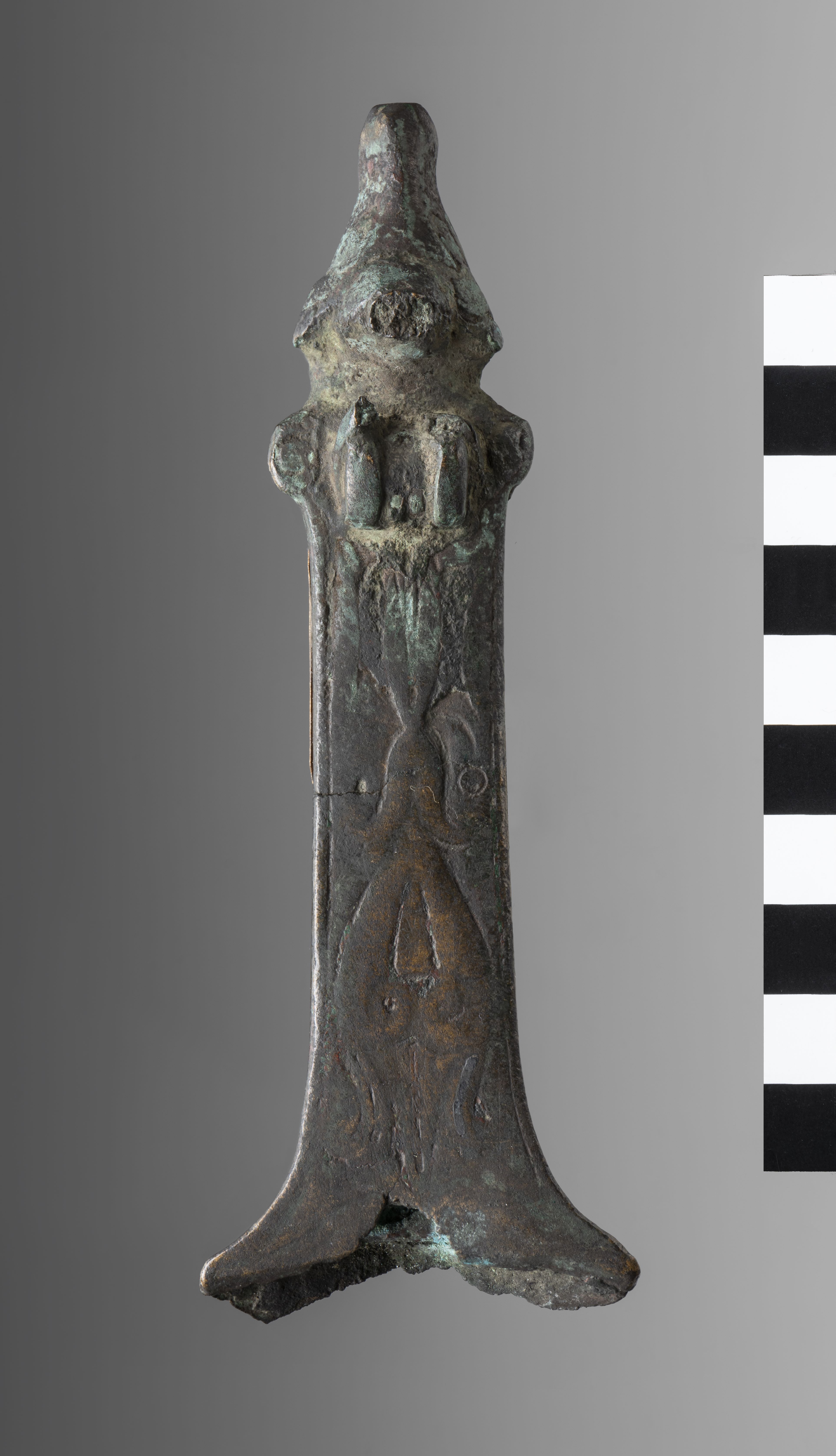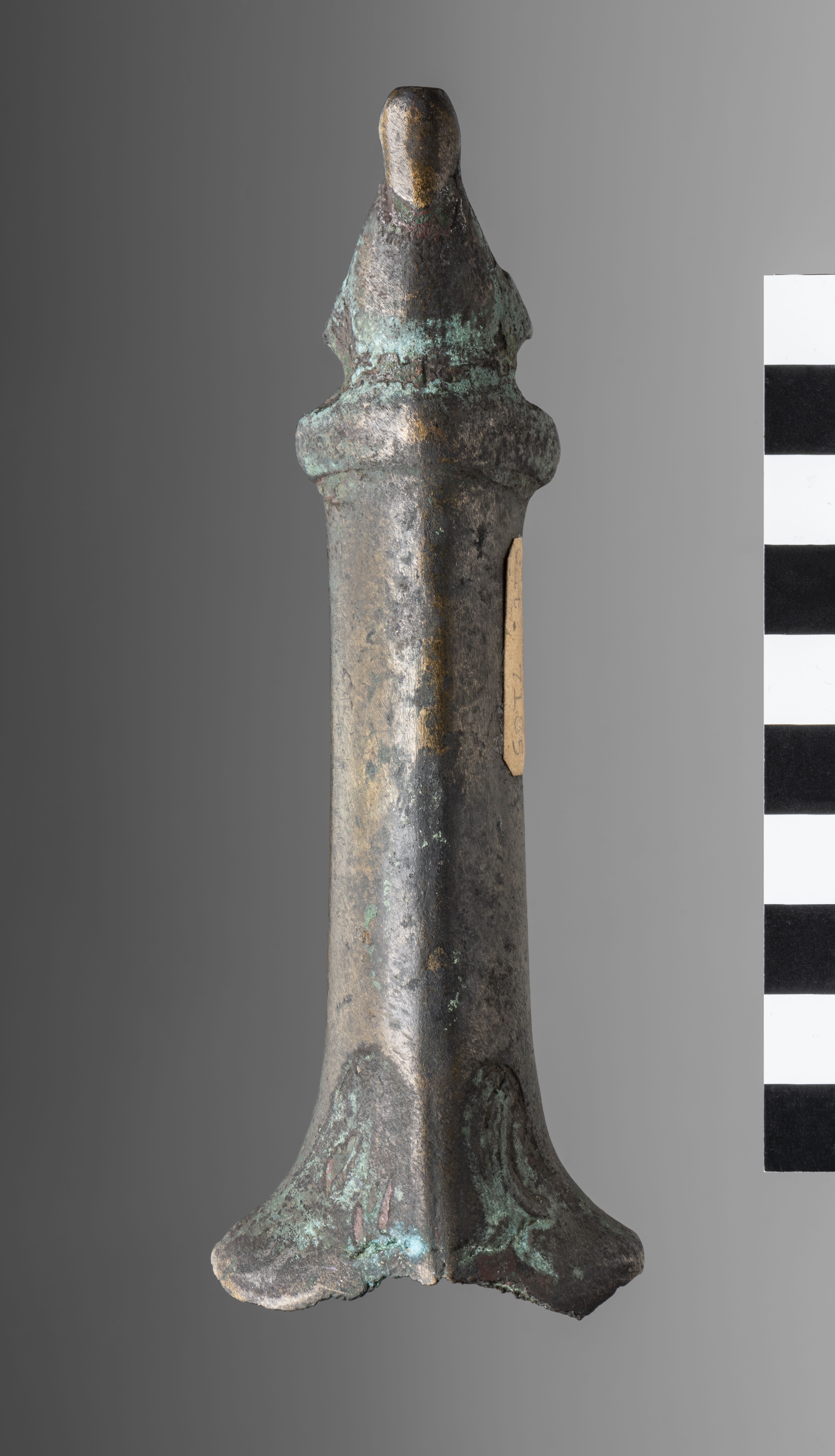 Handle of a patera. The part intended for attachment to the patera is damaged. The end terminates in the head of an animal with horns, probably a ram or a horned quadruped with longer, backward-curving horns, now broken. The elongated, slender muzzle shows prominent nostrils and clearly defined eyes, set laterally. The upper part of the handle is flat, decorated with vegetal motifs preserving traces of inlay, possibly silver. The lower, rounded part is decorated towards the broken end. A typed sticker bearing the inventory number is affixed on one side. The object is made in the lost-wax technique for hollow casts.