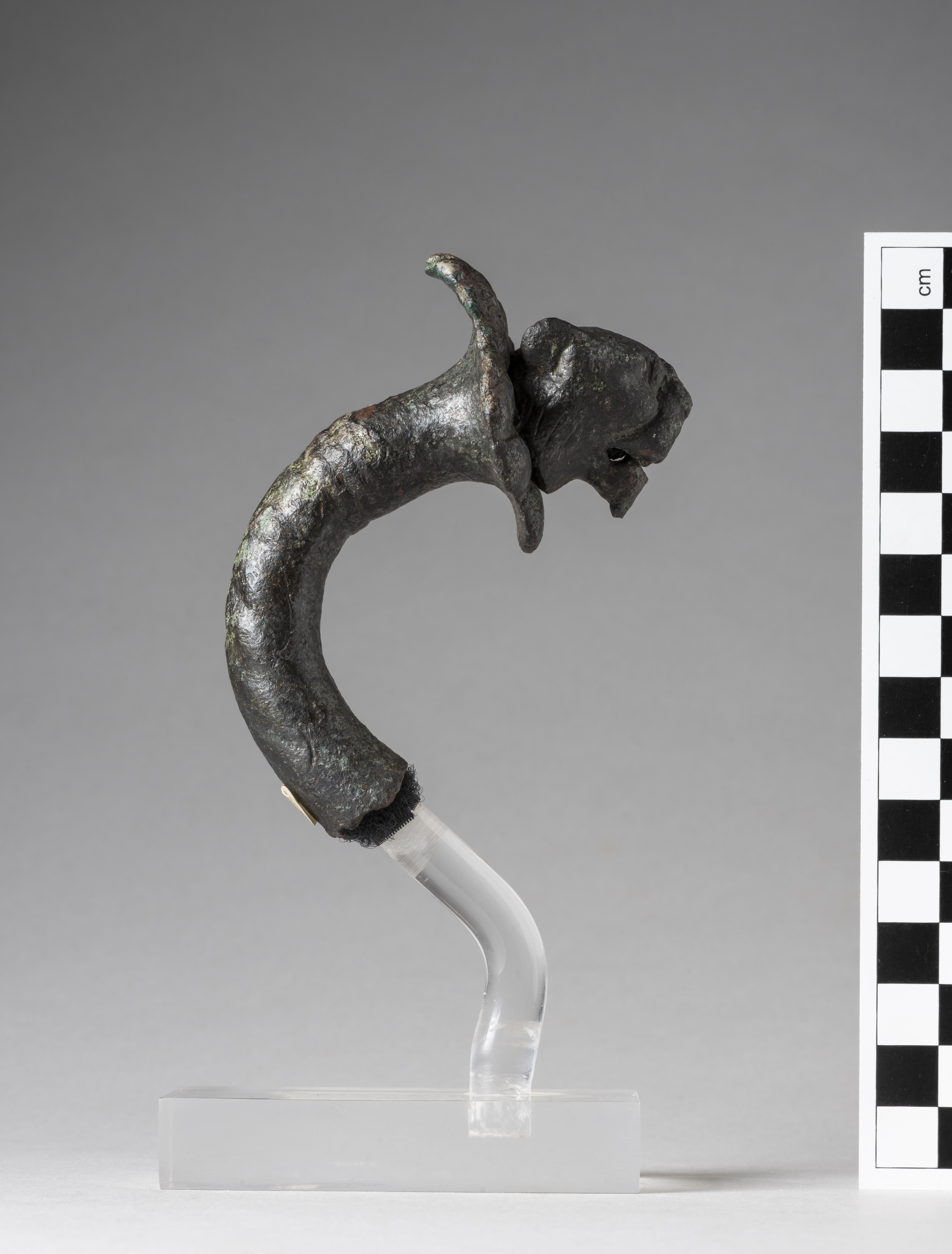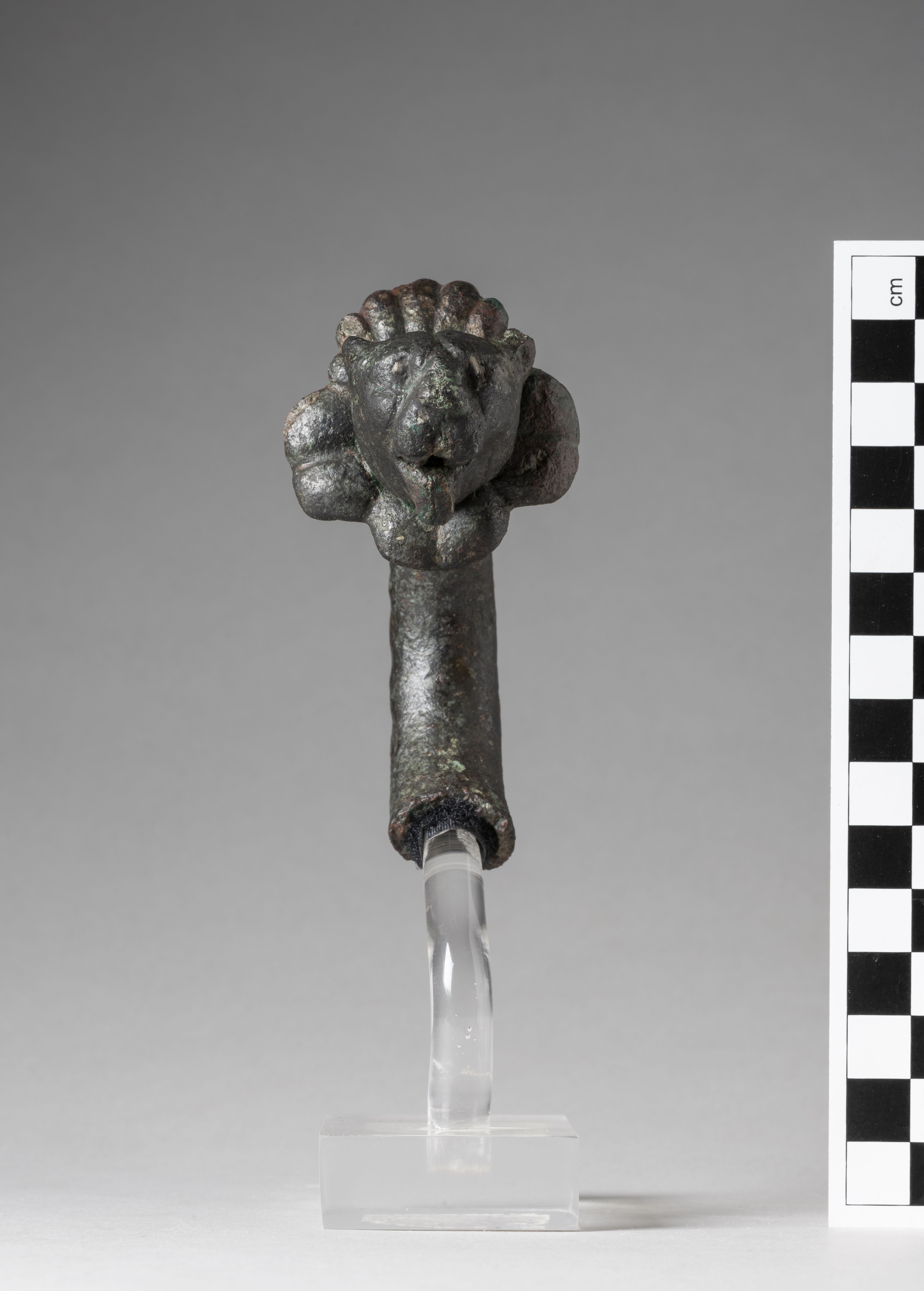 Handle of a lamp terminating in a panther’s head. The head and the handle were cast separately and then assembled post casting. The handle ends in a flower composed of two pairs of petals on the sides and below, and seven petals arranged along the upper edge. The panther’s head is rendered with great detail: the jaws are wide open with the tongue protruding. The handle bears a decoration consisting of a central line running along the upper surface, flanked by a sinuous line on each side. The lower edge is broken. The interior of the handle is filled with the casting core, which is black, with a fine and even grain. The object is made in the lost-wax technique for hollow casts.