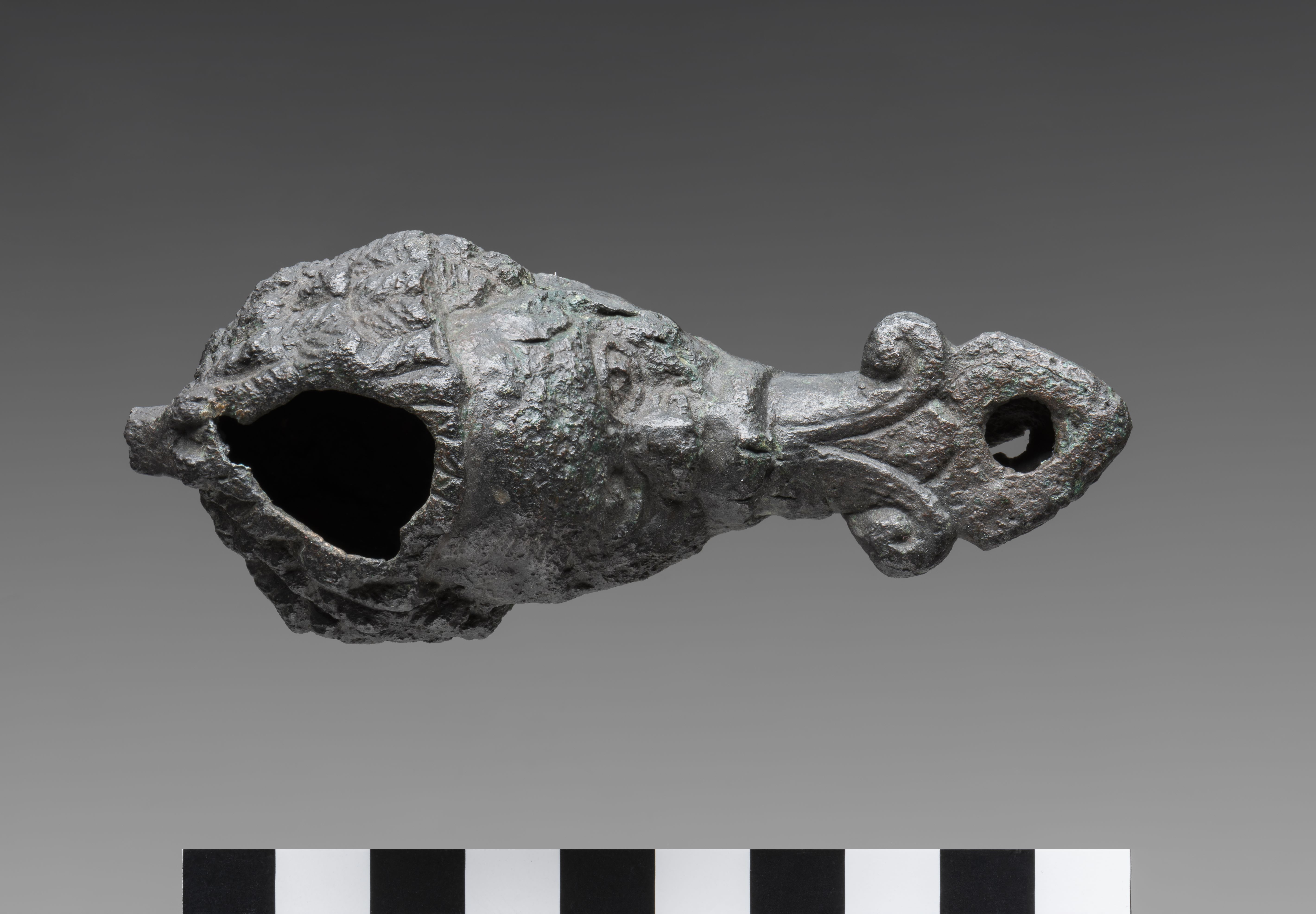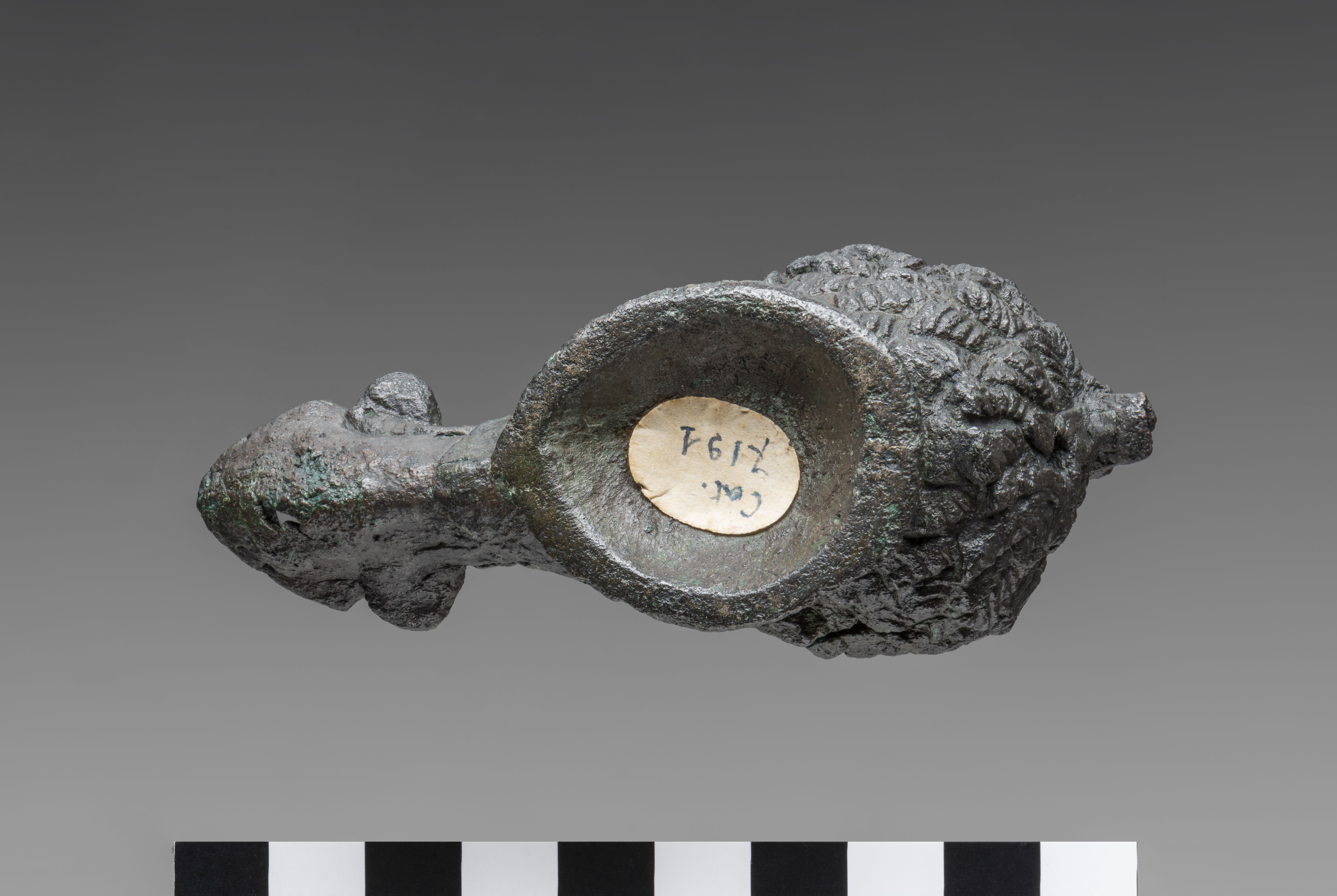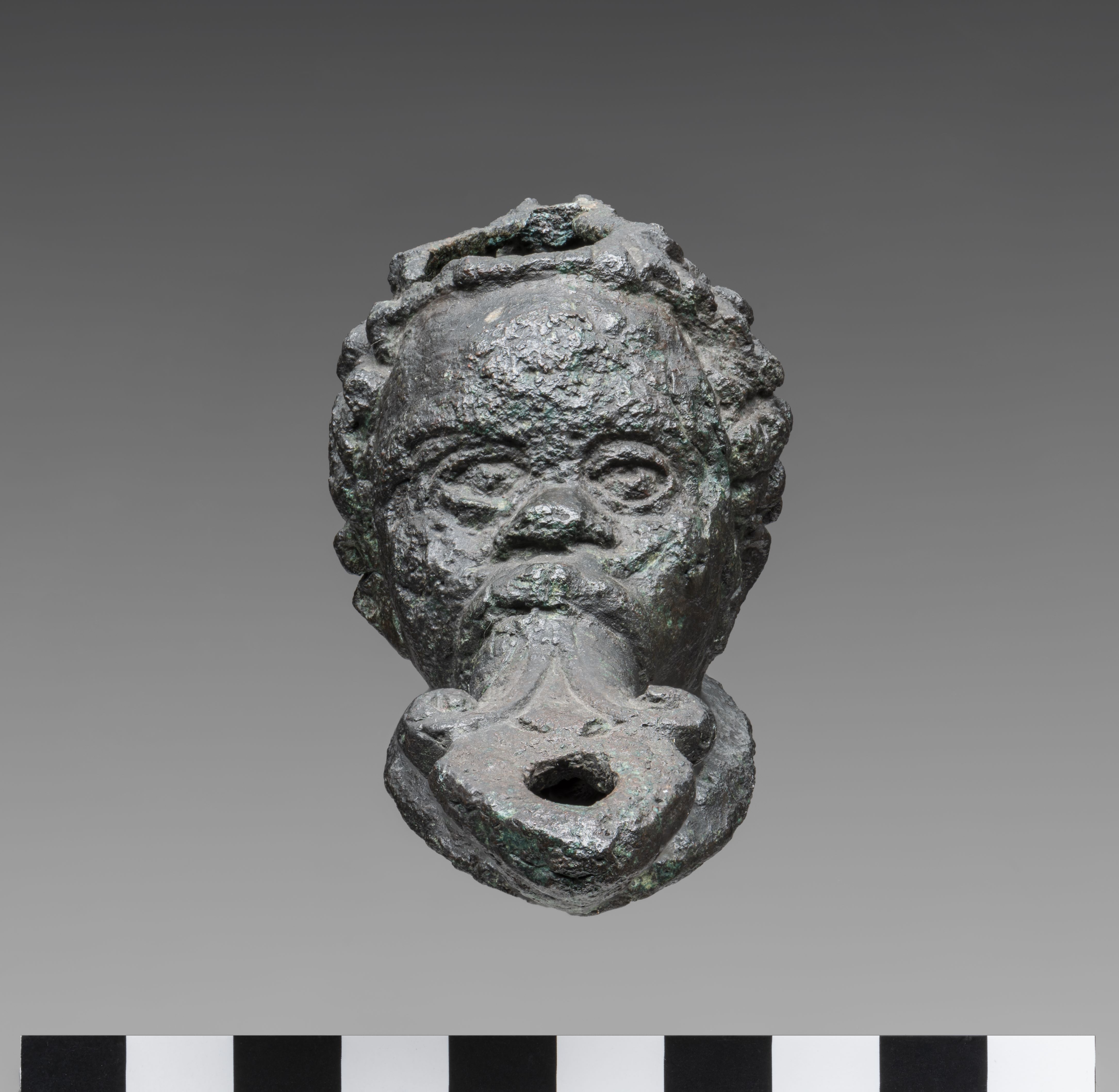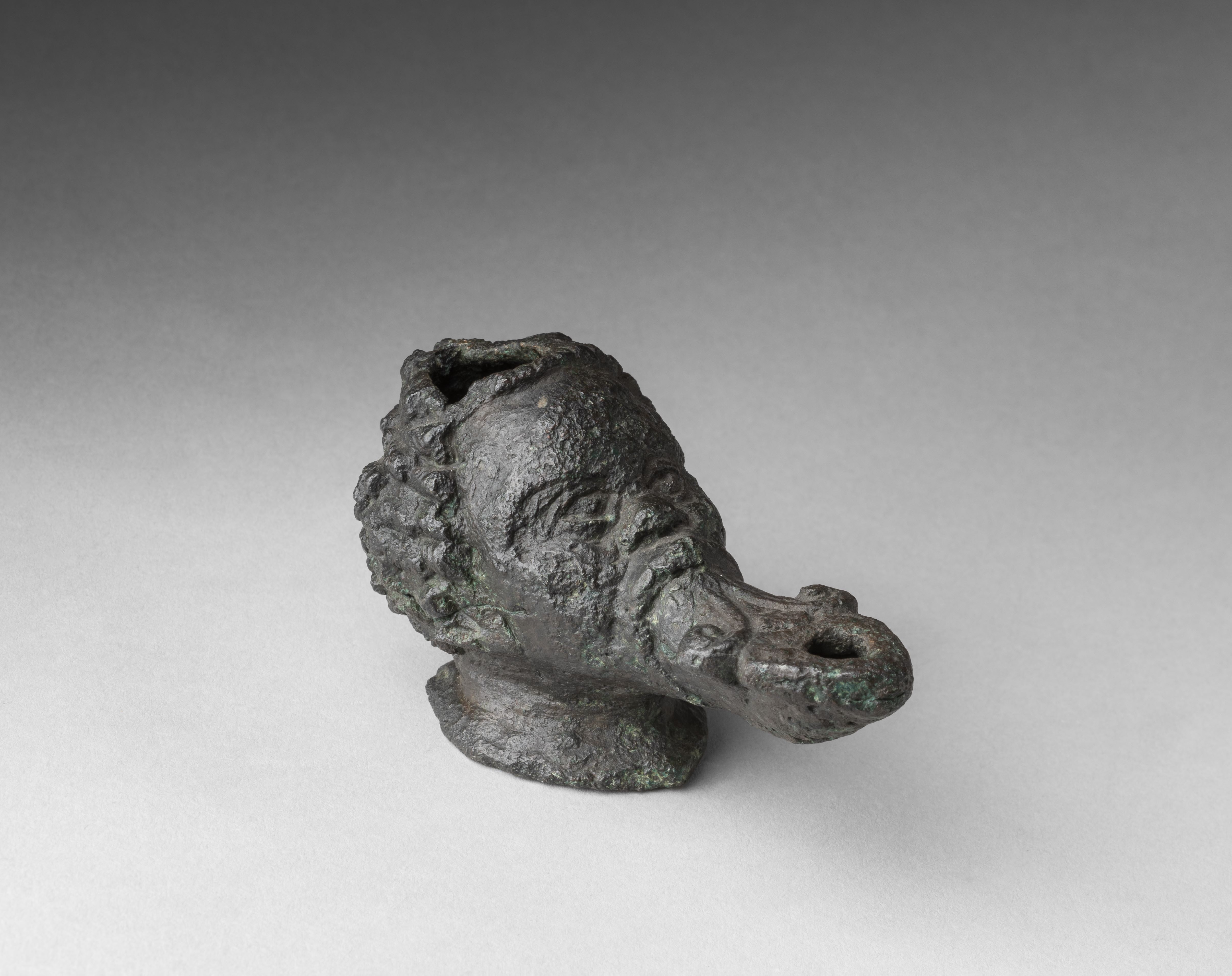 Lamp in the form of a male head. The face of the man displays features consistent with the Egyptian representations of Sub-Saharan African populations. The filling hole opens at the top of the head, its rim being damaged. The handle is broken. The hair, short and tightly curled, is finely detailed. From the mouth, the nozzle emerges, decorated with two volutes and provided with a wick hole. There is a break on the underside of the nozzle. The neck extends into a base, concave on the underside. The object is made in the lost-wax technique for hollow casts.