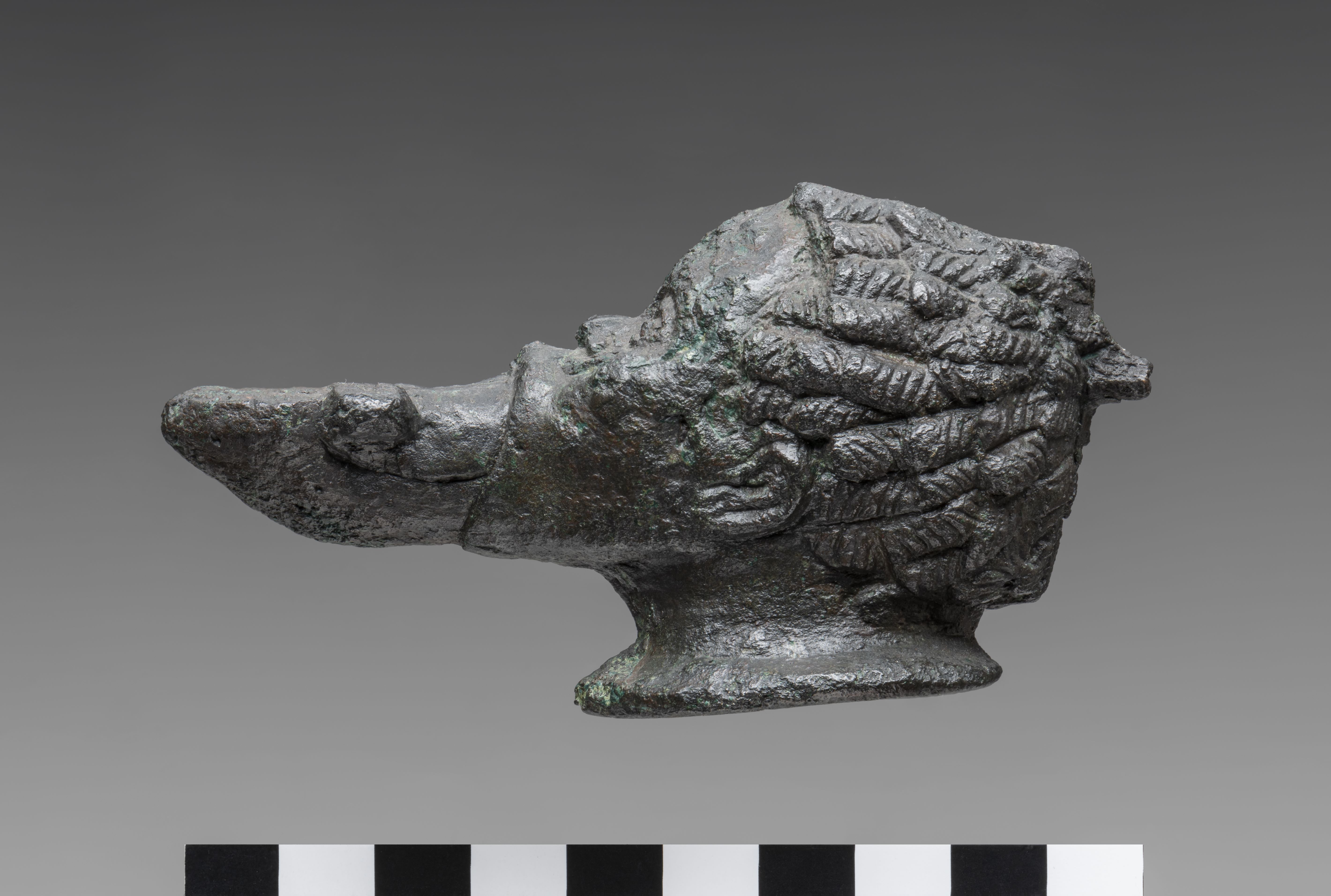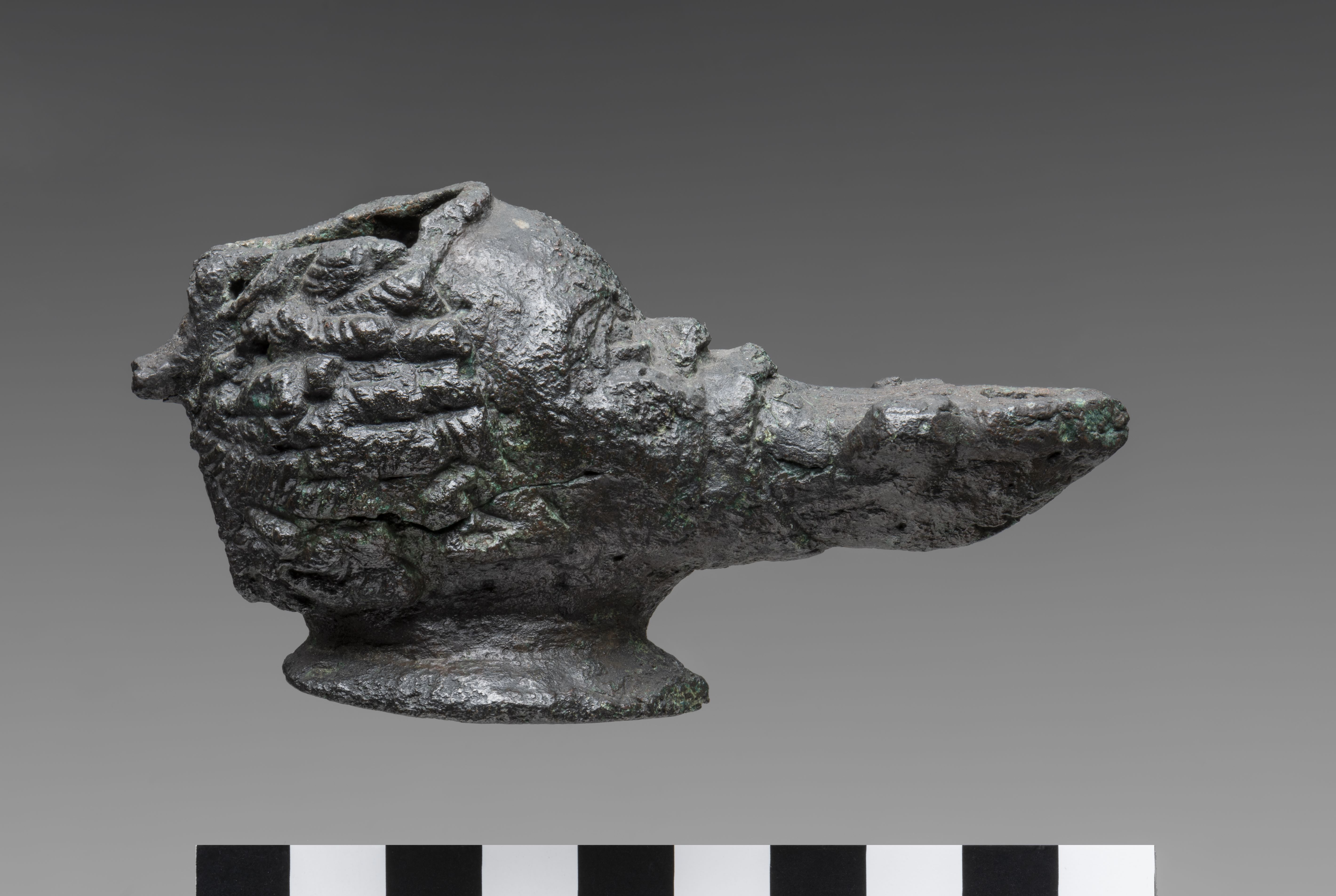 Lamp in the form of a male head. The face of the man displays features consistent with the Egyptian representations of Sub-Saharan African populations. The filling hole opens at the top of the head, its rim being damaged. The handle is broken. The hair, short and tightly curled, is finely detailed. From the mouth, the nozzle emerges, decorated with two volutes and provided with a wick hole. There is a break on the underside of the nozzle. The neck extends into a base, concave on the underside. The object is made in the lost-wax technique for hollow casts.
