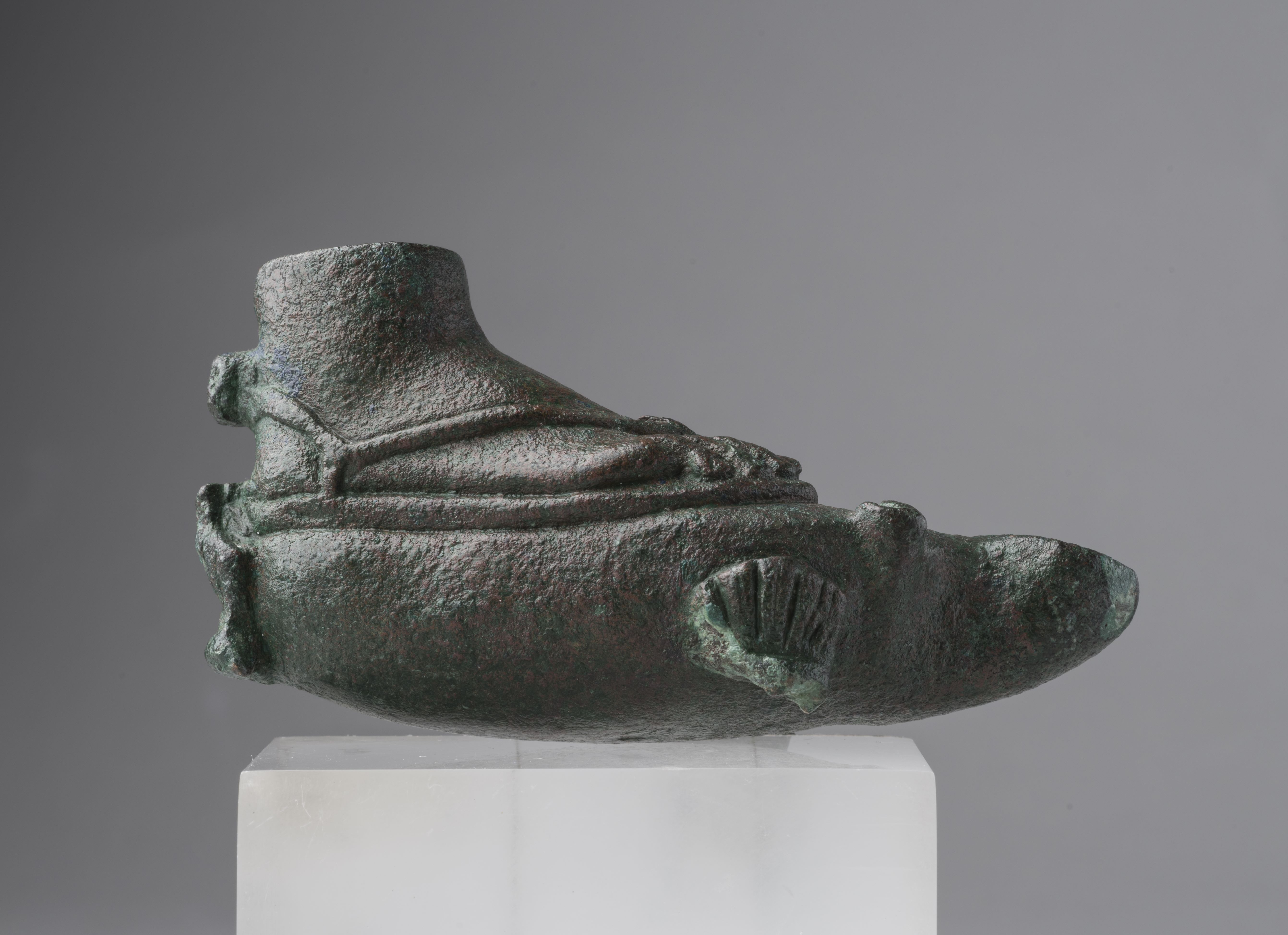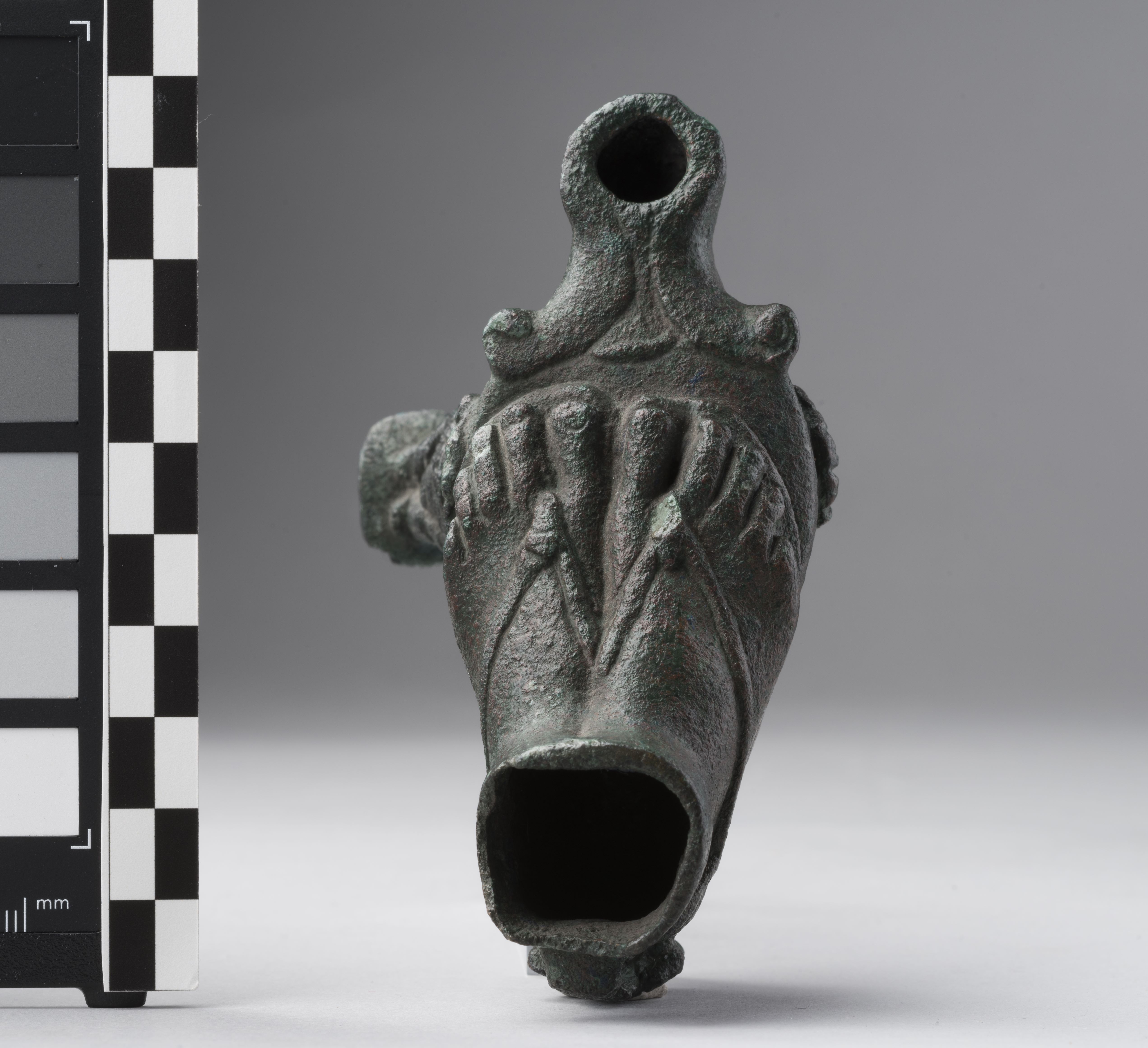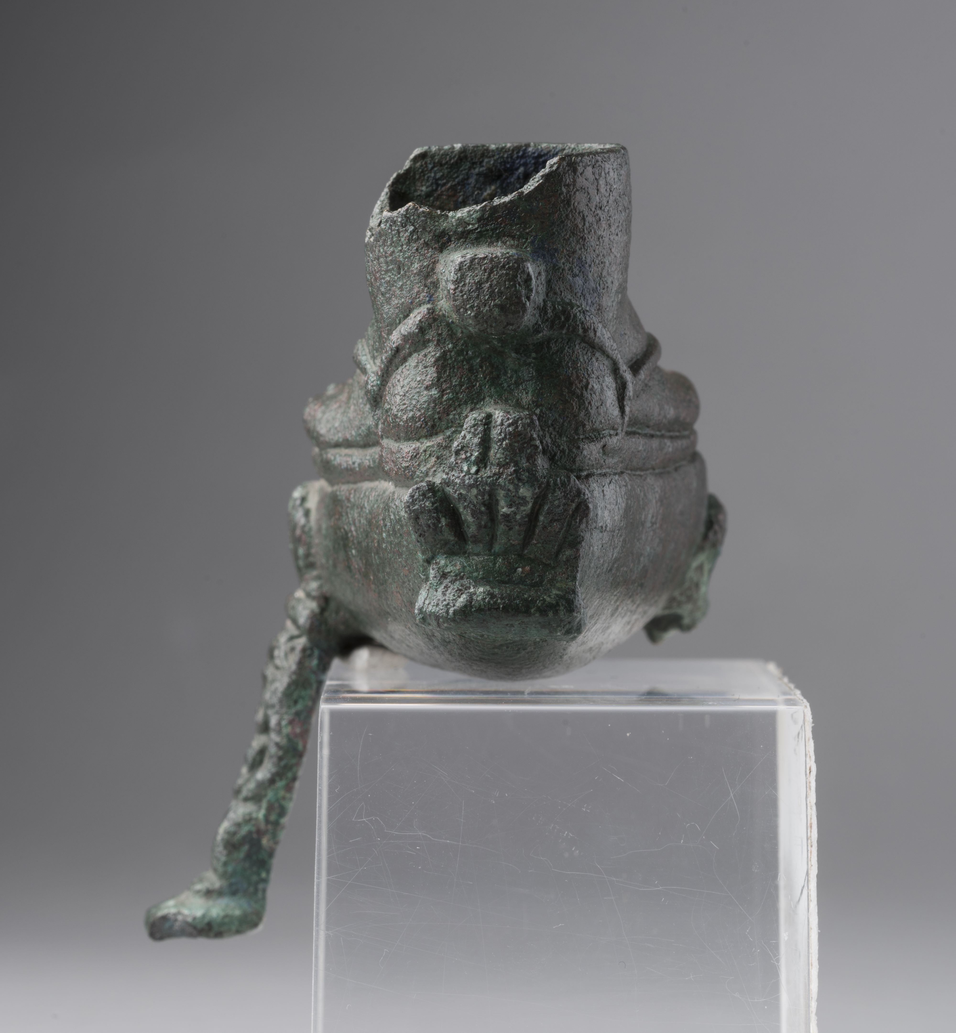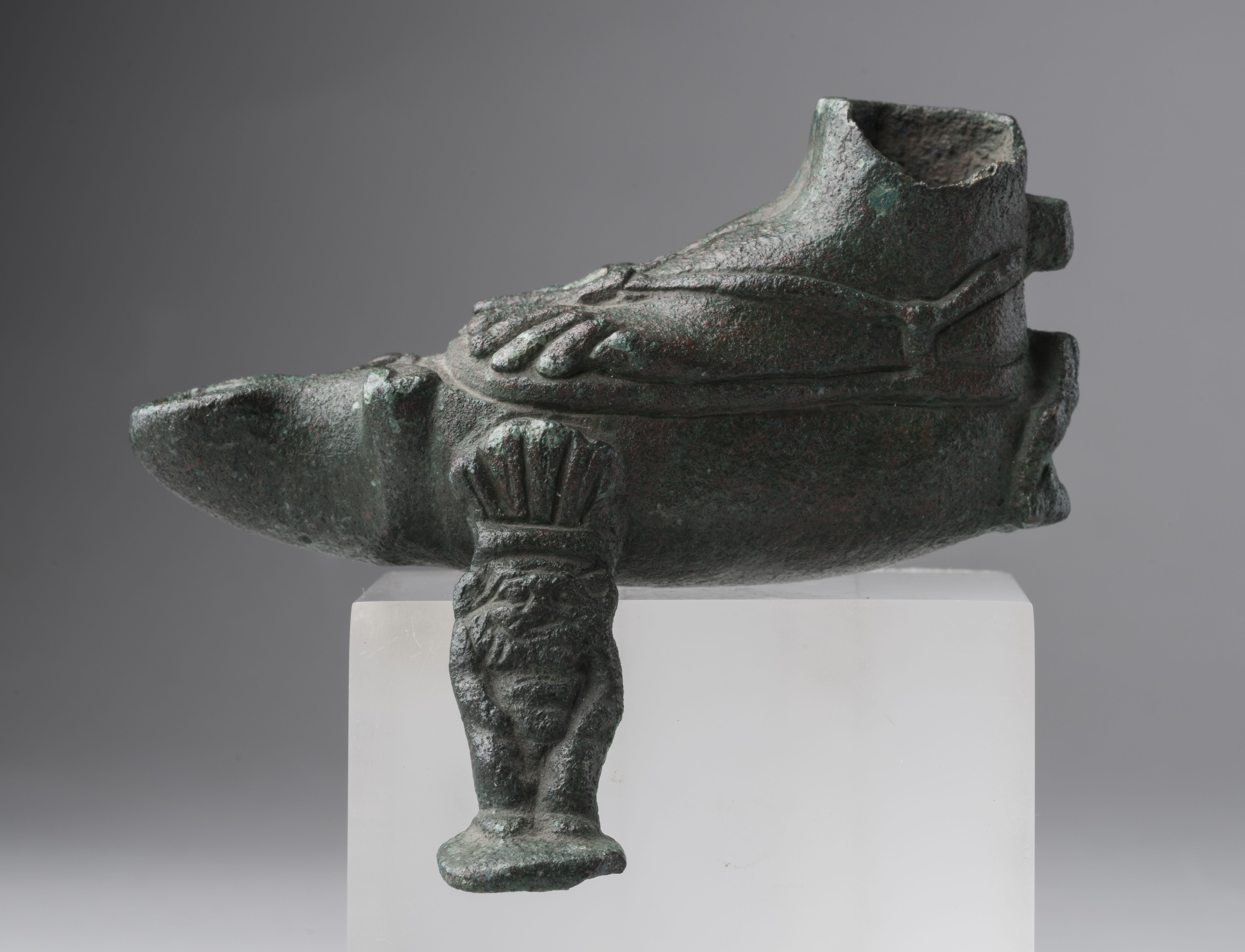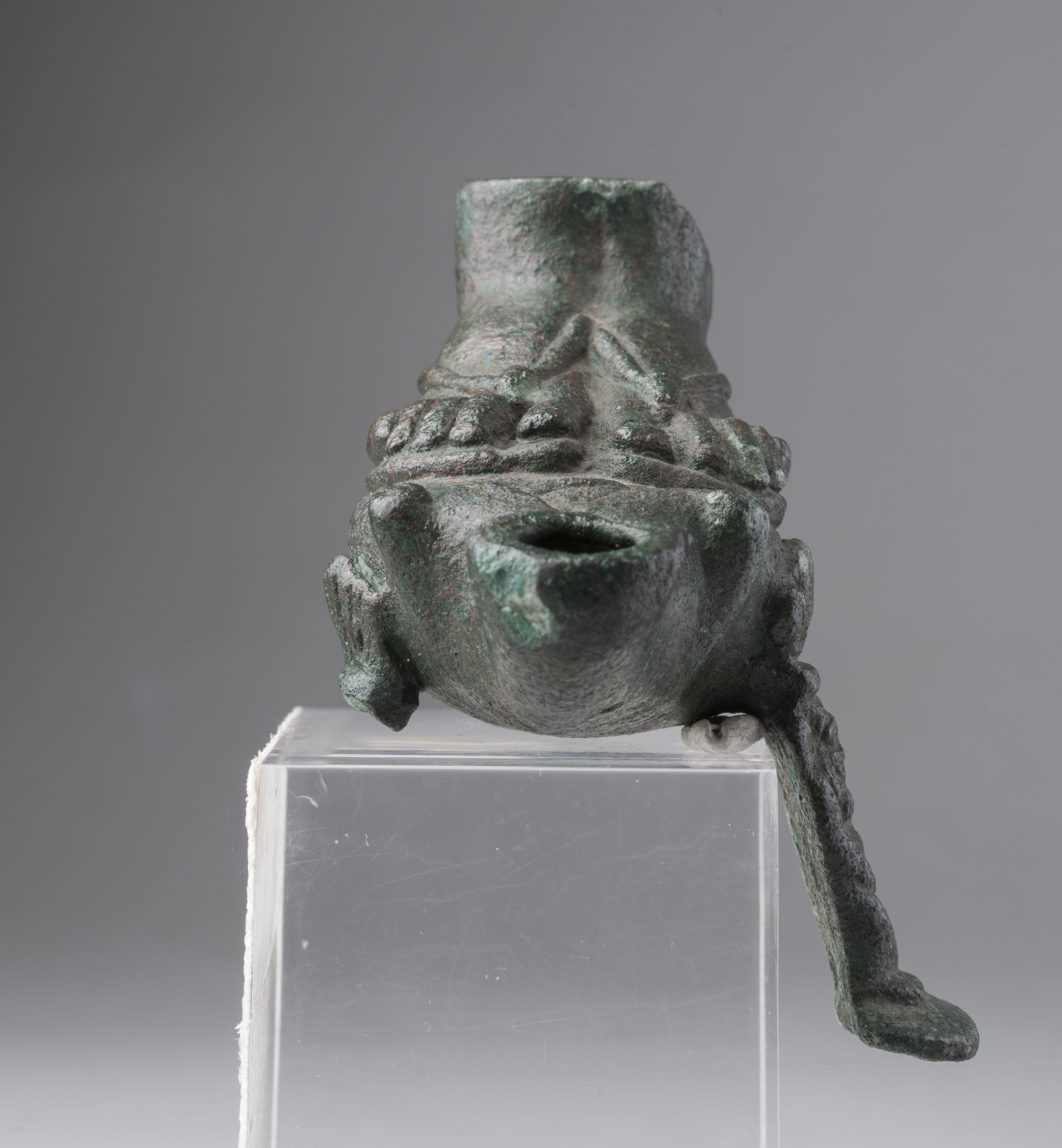 Lamp in the form of two feet with a figure of Bes. The upper edge of the ankles is damaged. The feet wear sandals. Behind the ankles is a square projection, probably the remains of a handle, now broken. The feet rest on the ovoid, domed body of the lamp, which continues into a double-volute nozzle with a rounded tip and a wick-hole. On each side and at the back there was originally a figure of Bes, but only the one on the right side is preserved; of the others, only the feathers of the headdress remain. Bes wears a feathered headdress; the face has feral features with a snub nose, leonine ears, and a beard. The god is depicted naked, squatting, with his hands resting on his joined legs, and standing on a small rectangular base. The object is made in the lost-wax technique for hollow casts.