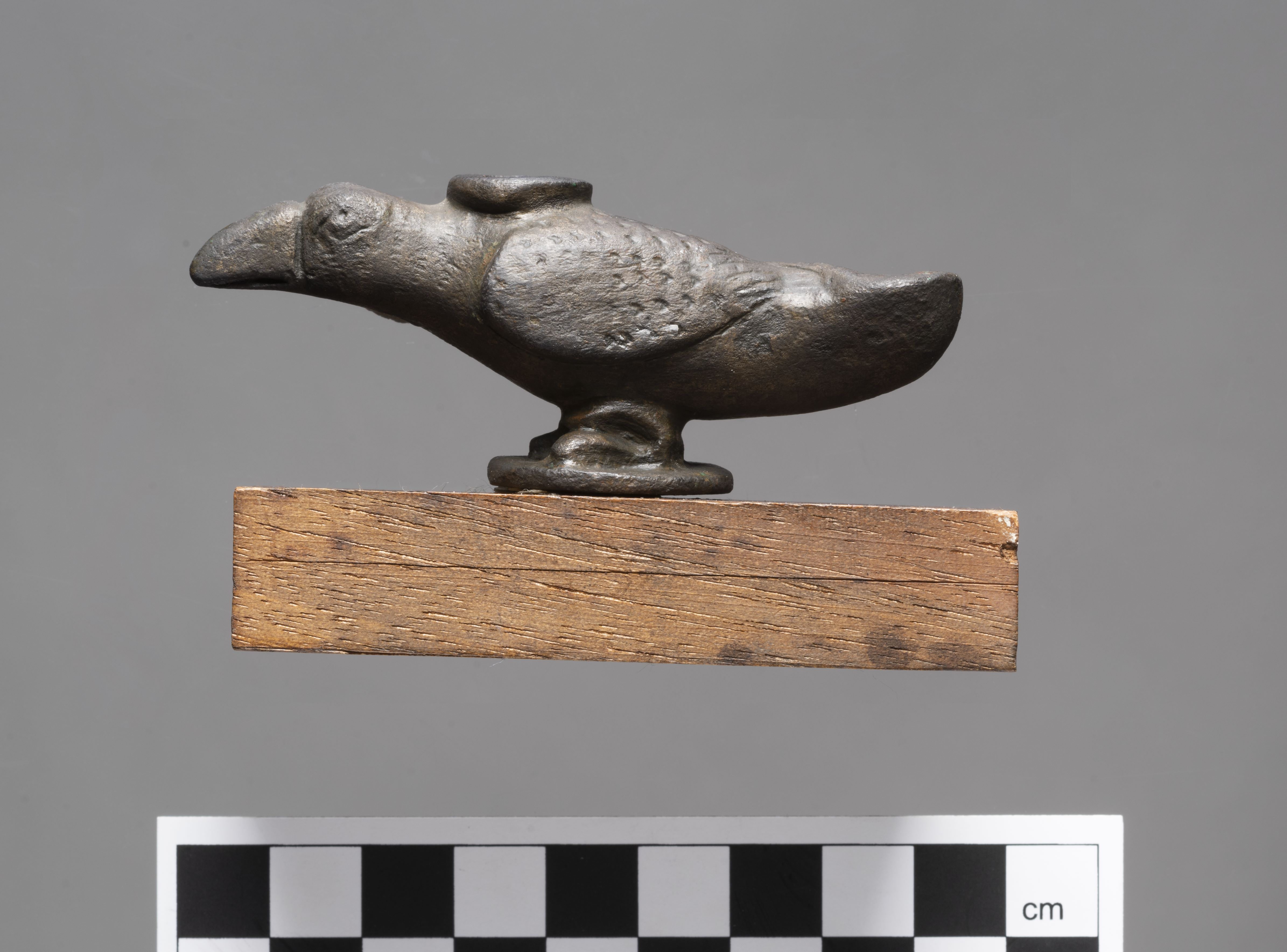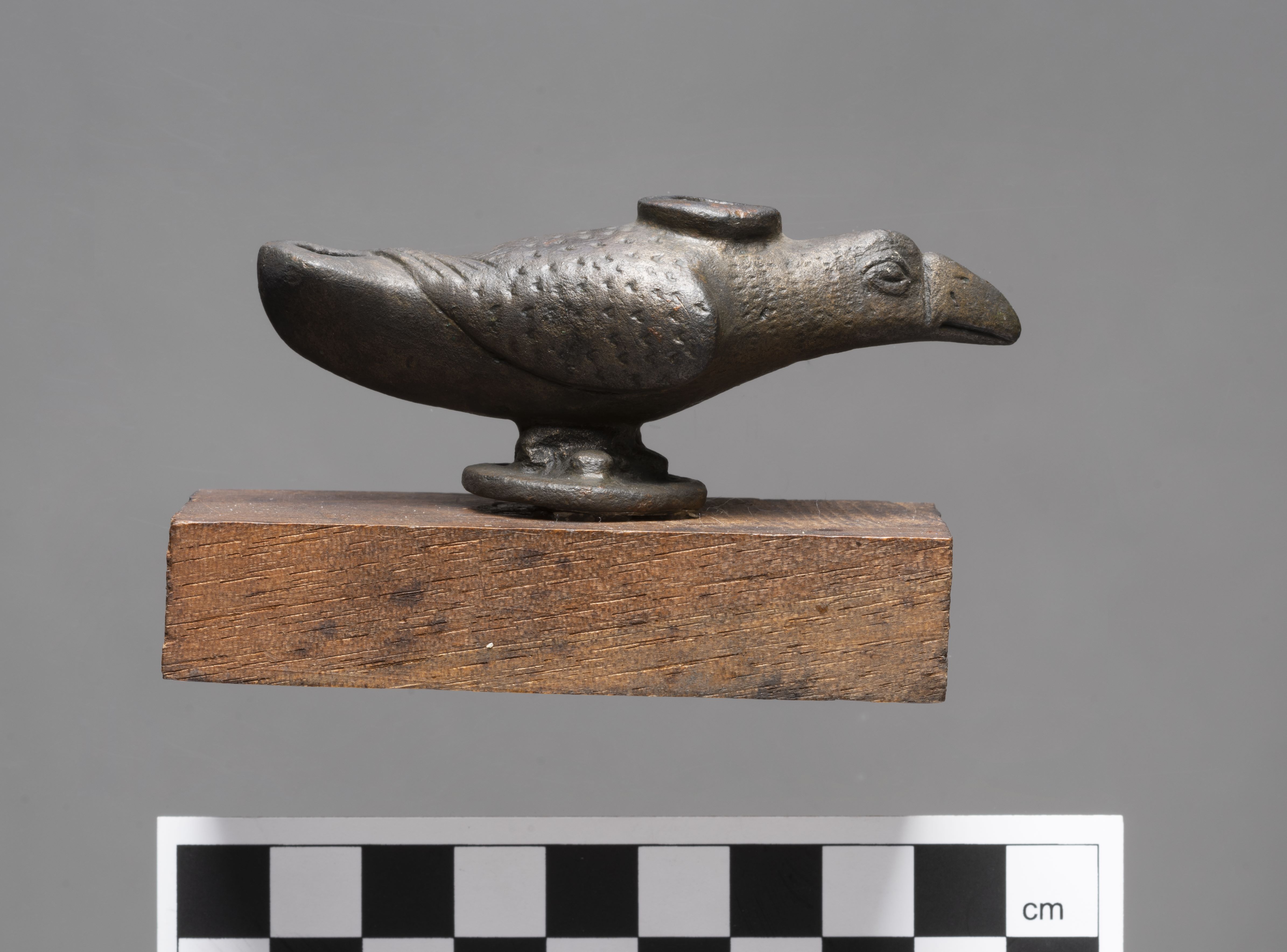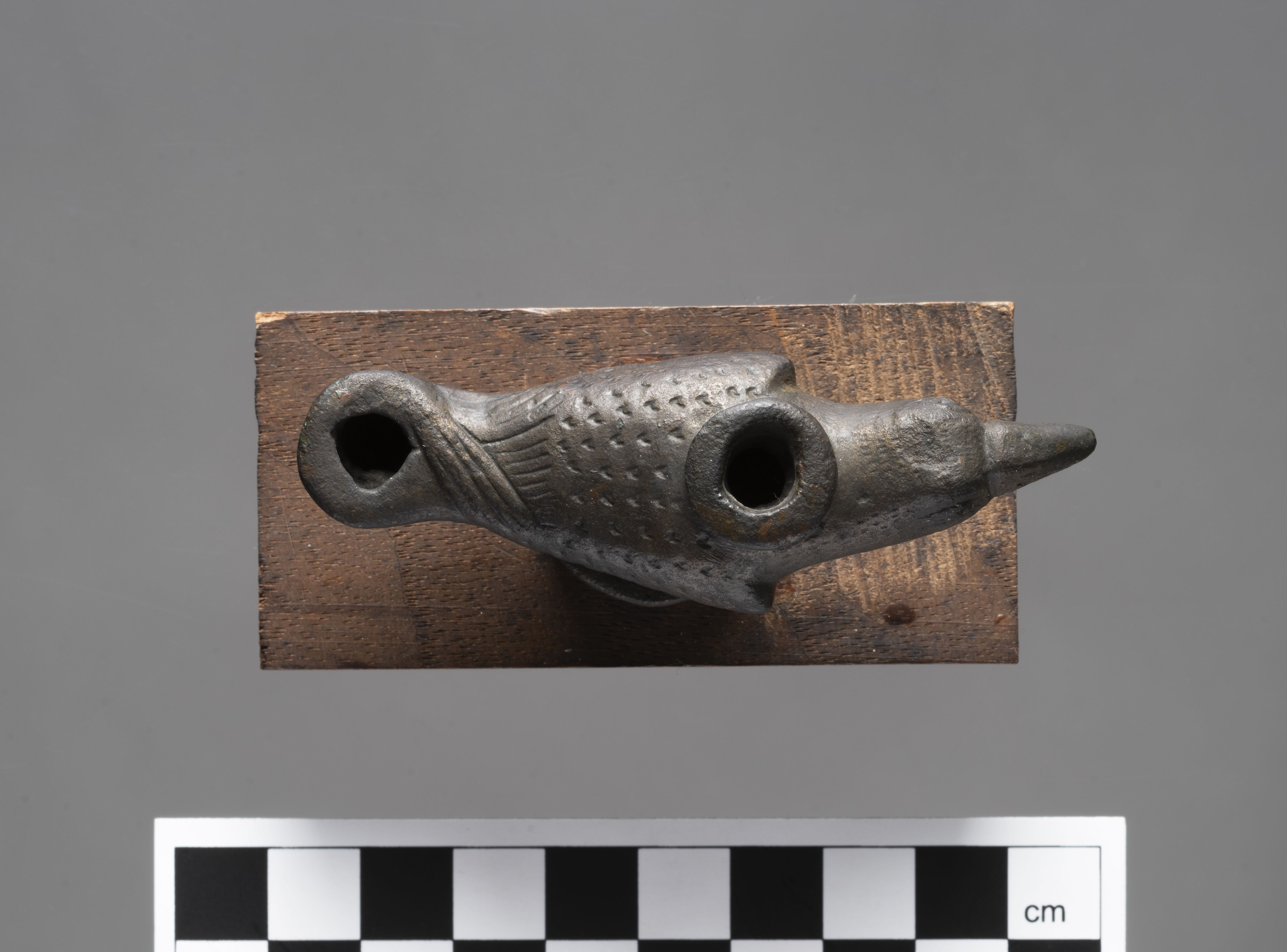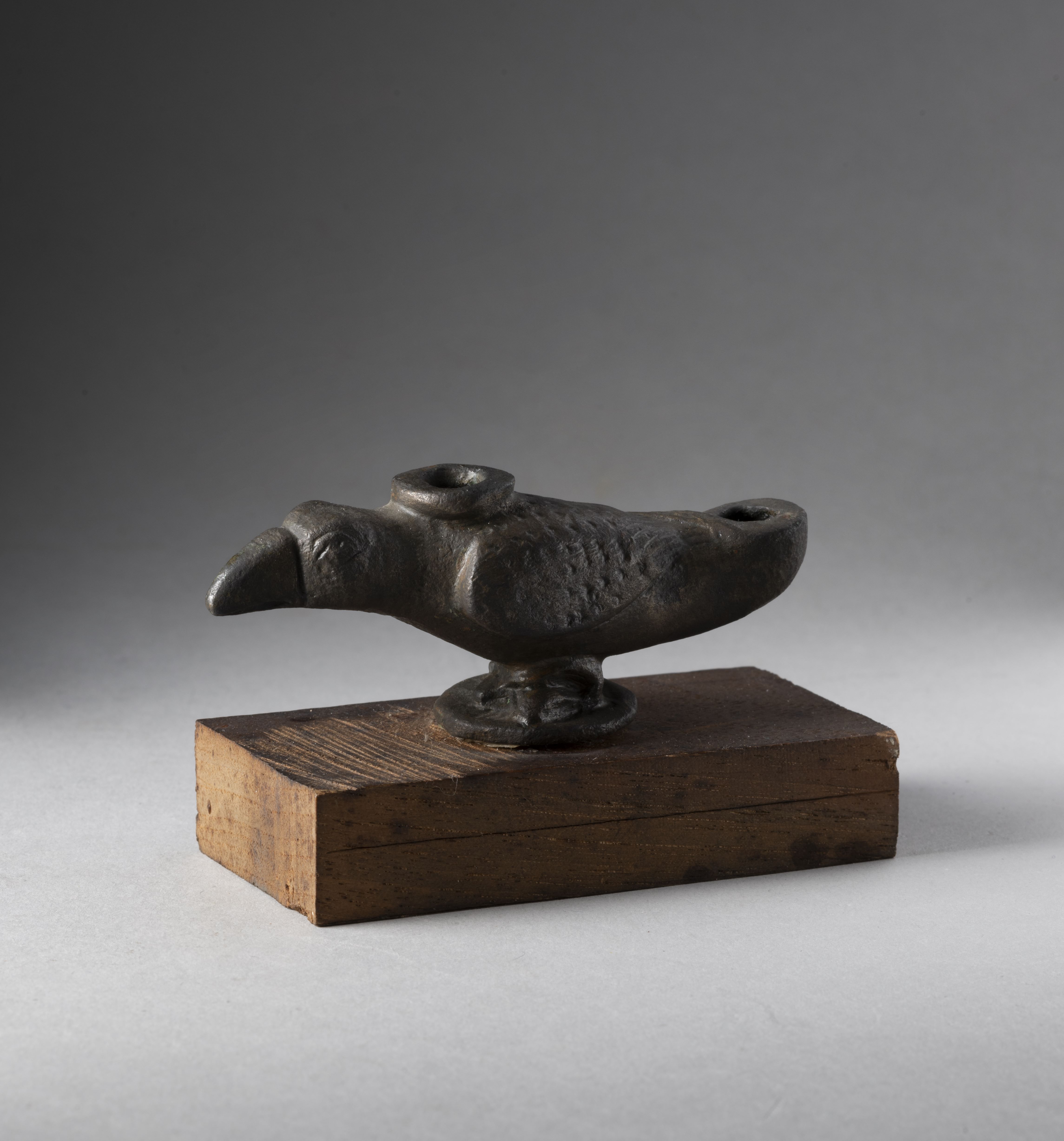 Lamp in the form of a bird. The beak is large, the head is turned slightly to the left and the neck is straight. Two openings are present on the upper surface: the central filling hole, with a raised rim, and the wick hole at the tip of the tail. The wings are decorated and cross over the tail near the wick hole. The bird stands on a circular base, from which a circular-section tenon projects down. The lamp is mounted on a modern wooden stand. The object is made in the lost-wax technique for hollow casts.