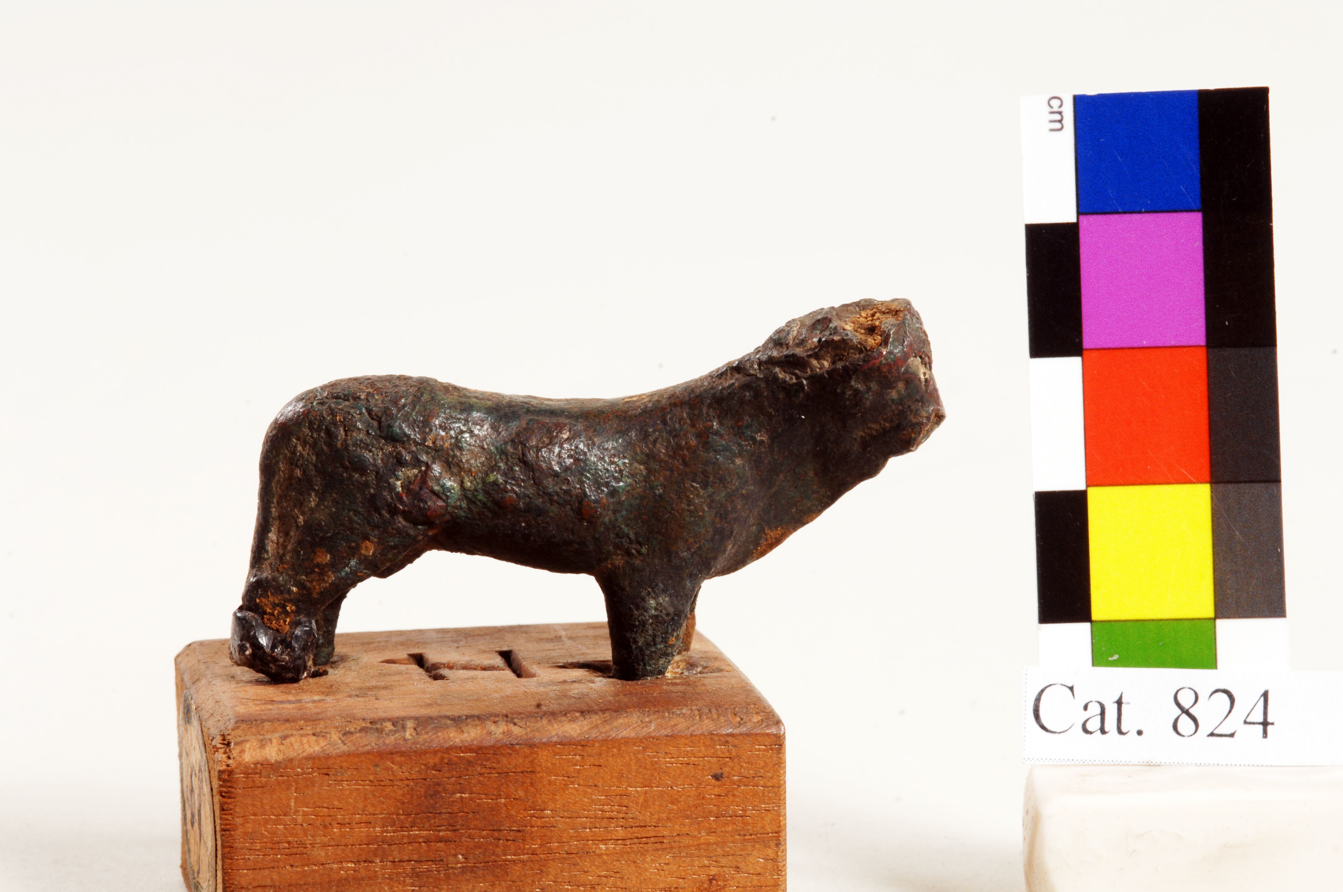 Figure of a bull, striding with left legs forward. The top of the head is broken. The head is slightly tilted to the right. All four legs are broken, the tail runs along the right hind leg. The object is made in the lost-wax technique for solid casts.