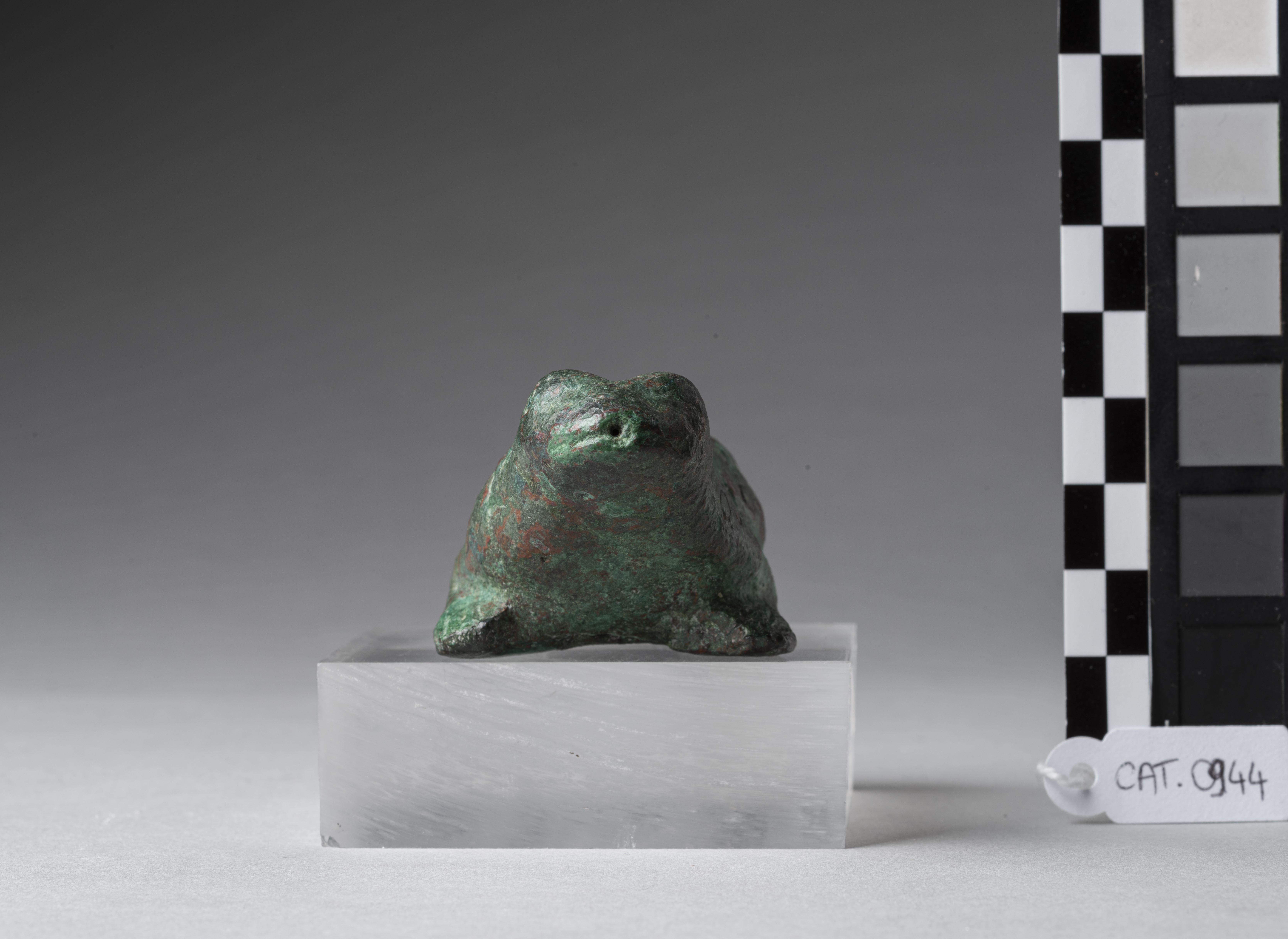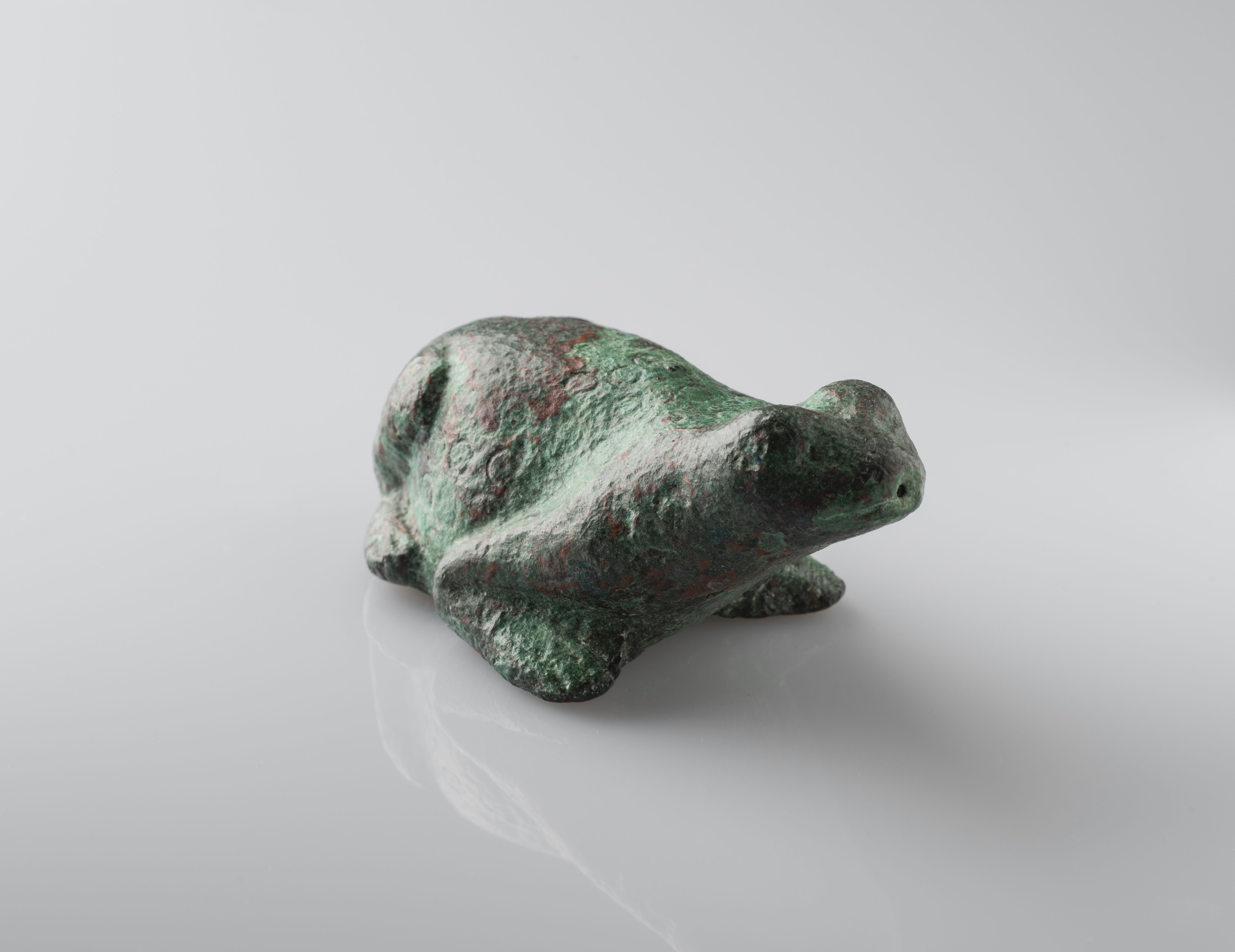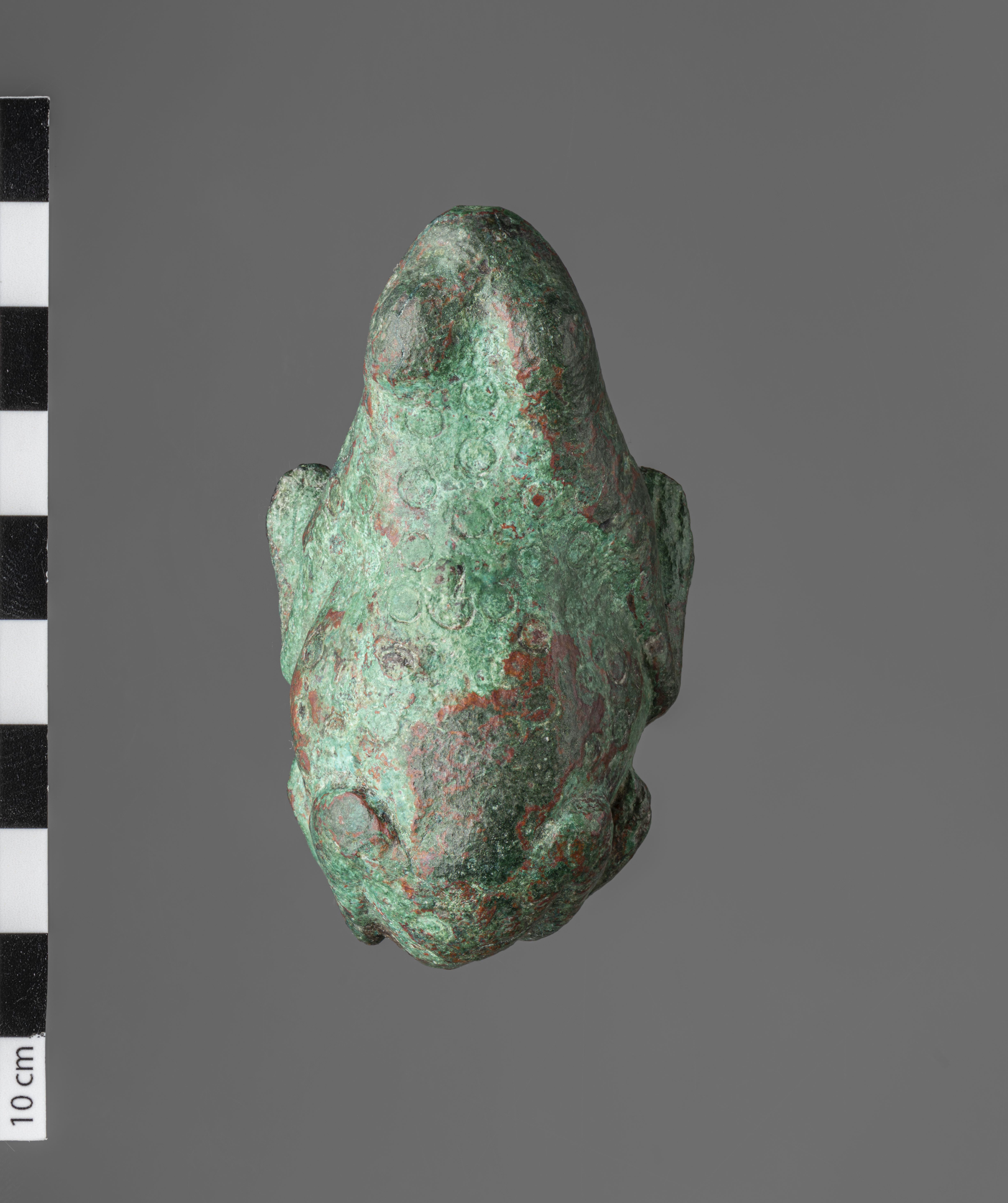 Figure of a frog. The head is tilted upwards, there are two protuberances where the eyes should be, the mouth is rendered with an incised line and has a small hole in the centre. The frog's skin is decorated with small circles with a dot in the centre. The front legs are bent, the toes are indicated with incised lines. The hind legs are bent at the sides of the body. Perhaps it was part of a fountain. The object is made in the lost-wax technique for hollow casts.