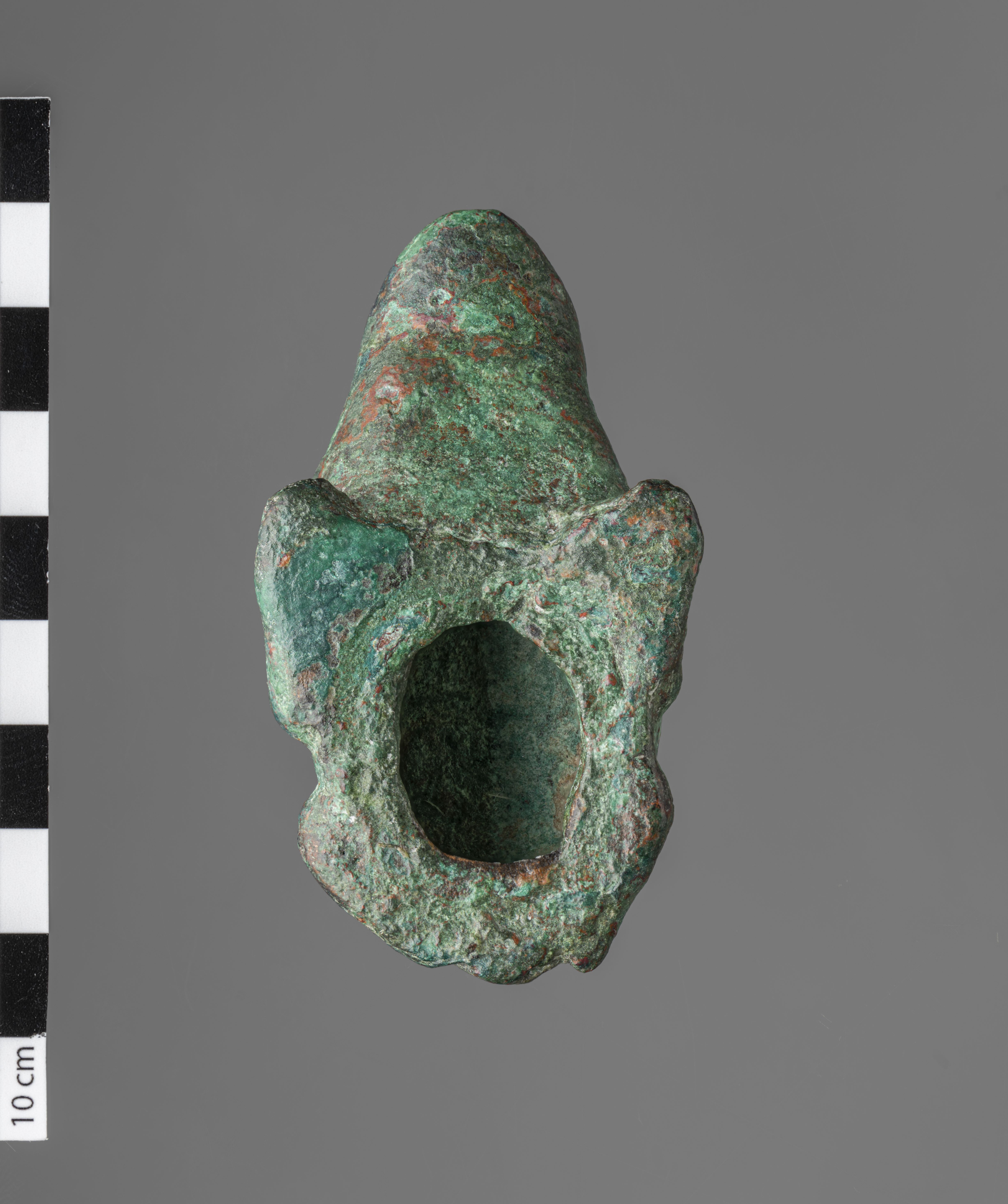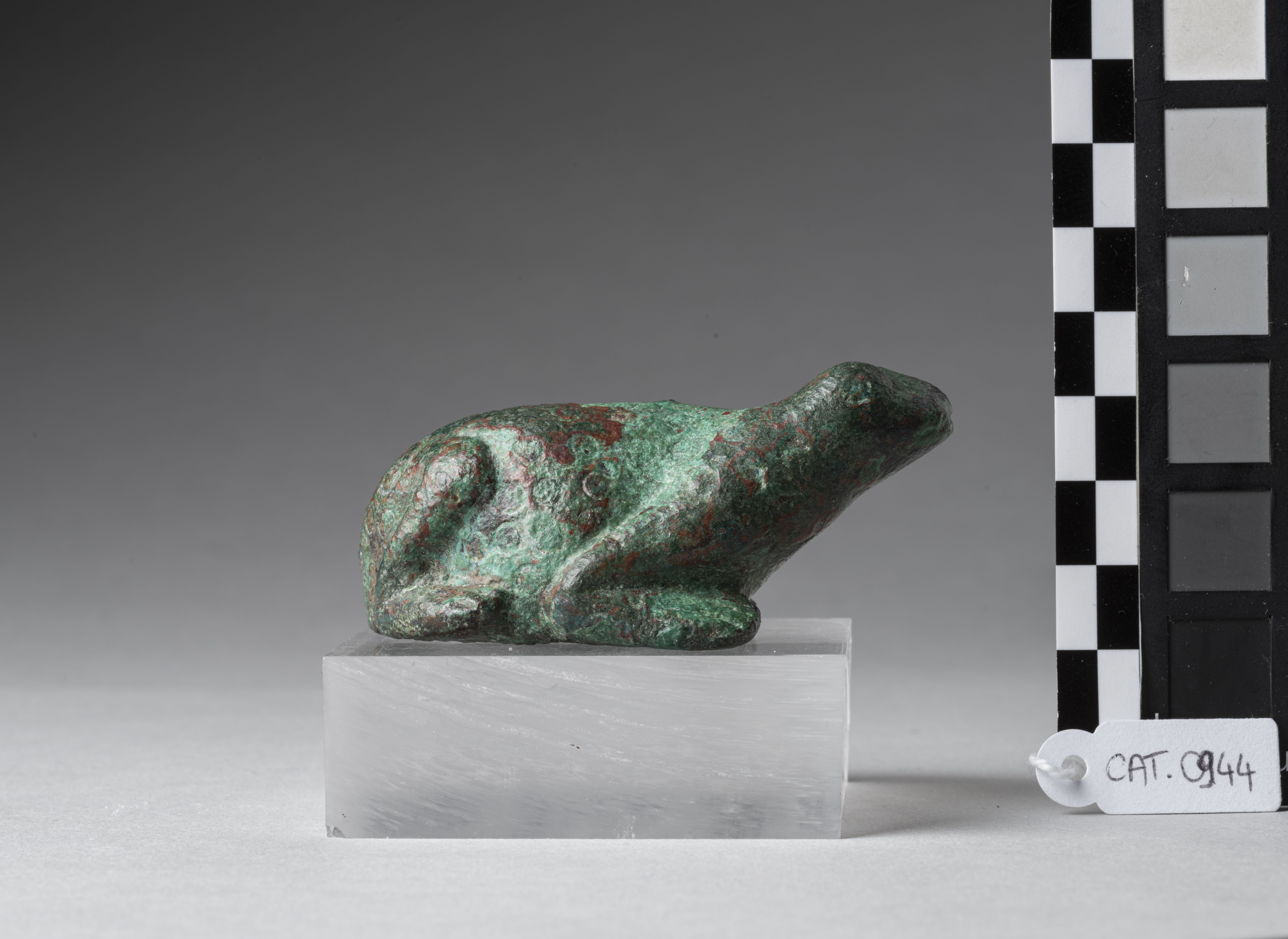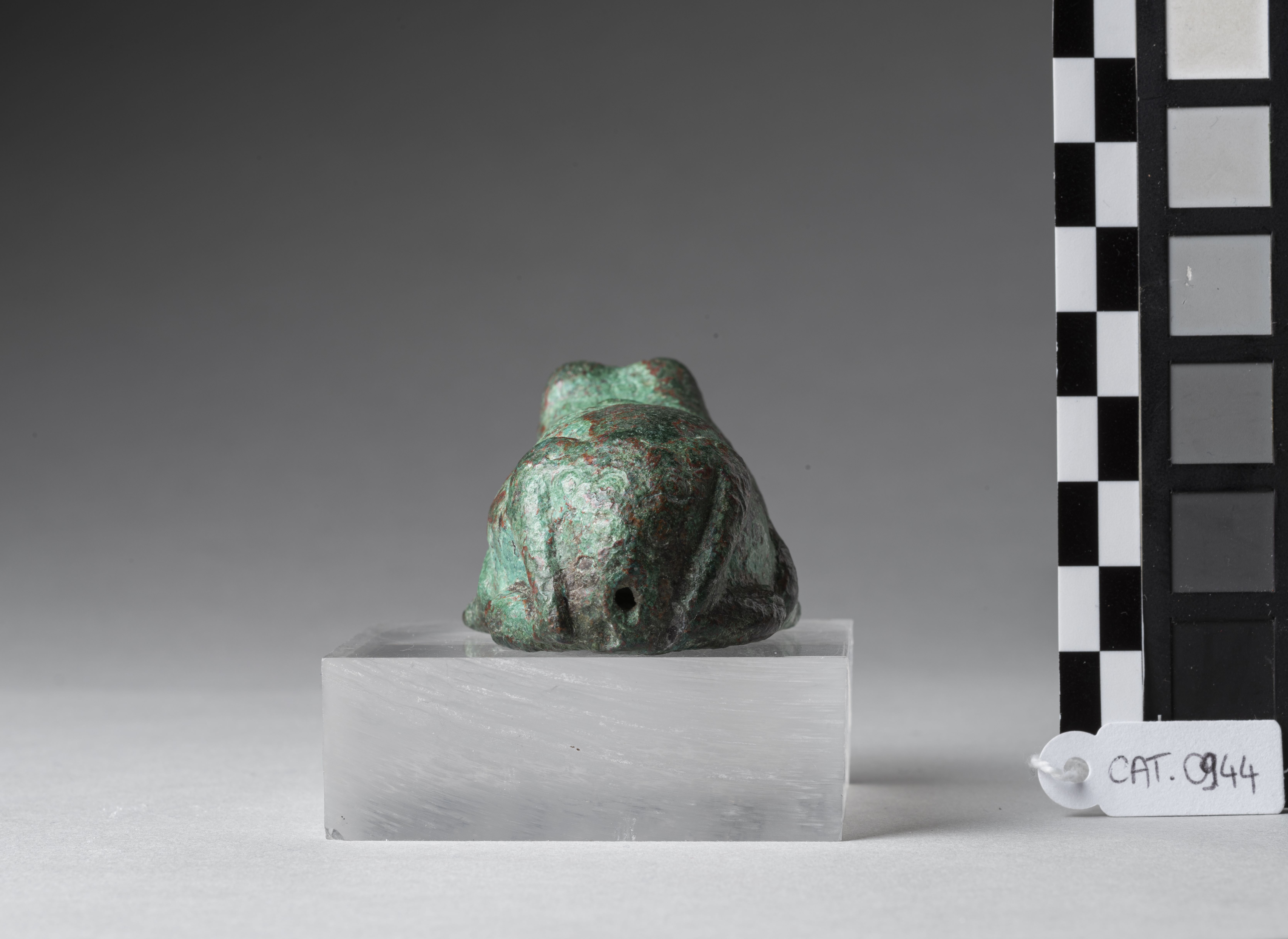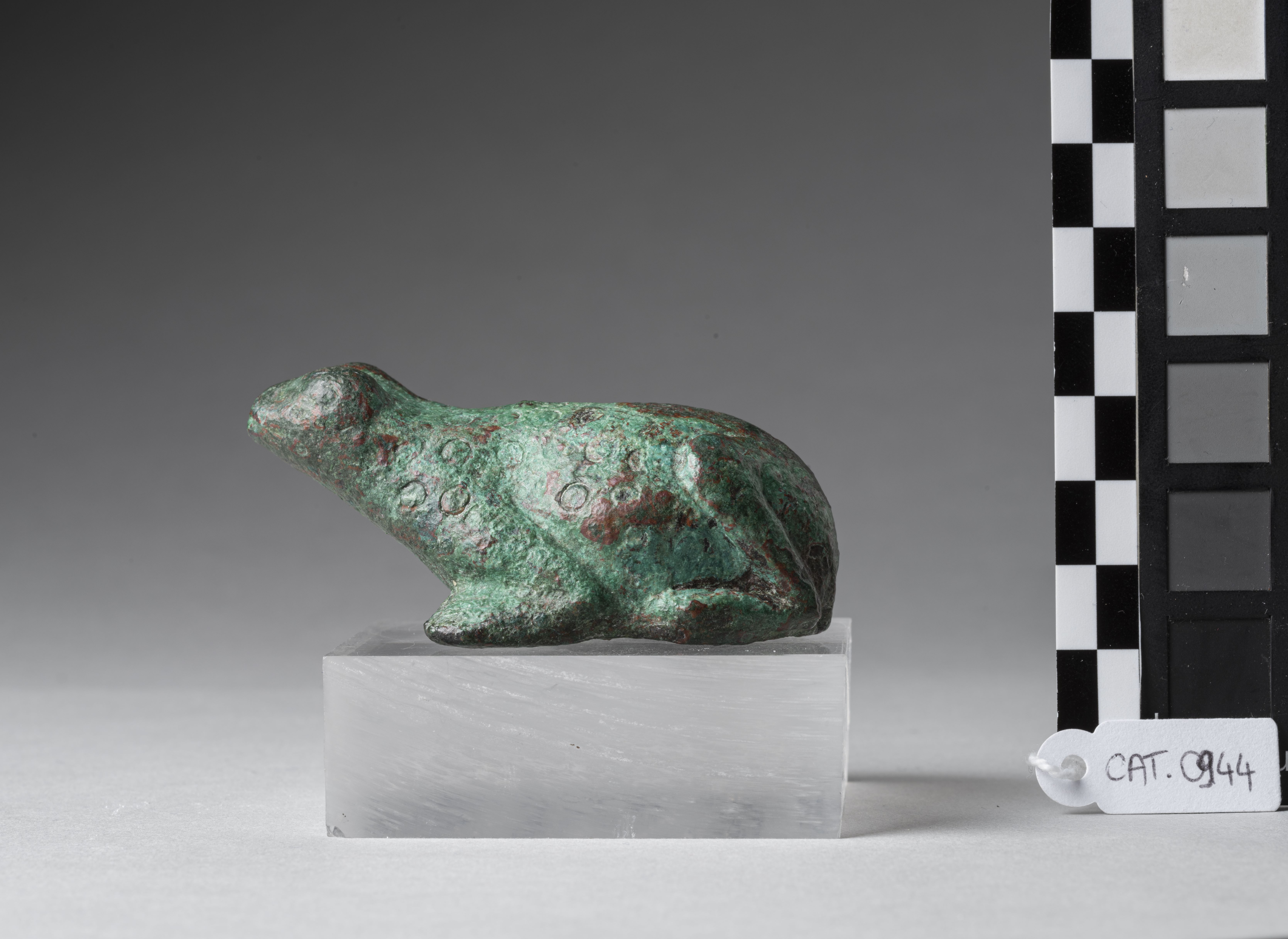 Figure of a frog. The head is tilted upwards, there are two protuberances where the eyes should be, the mouth is rendered with an incised line and has a small hole in the centre. The frog's skin is decorated with small circles with a dot in the centre. The front legs are bent, the toes are indicated with incised lines. The hind legs are bent at the sides of the body. Perhaps it was part of a fountain. The object is made in the lost-wax technique for hollow casts.