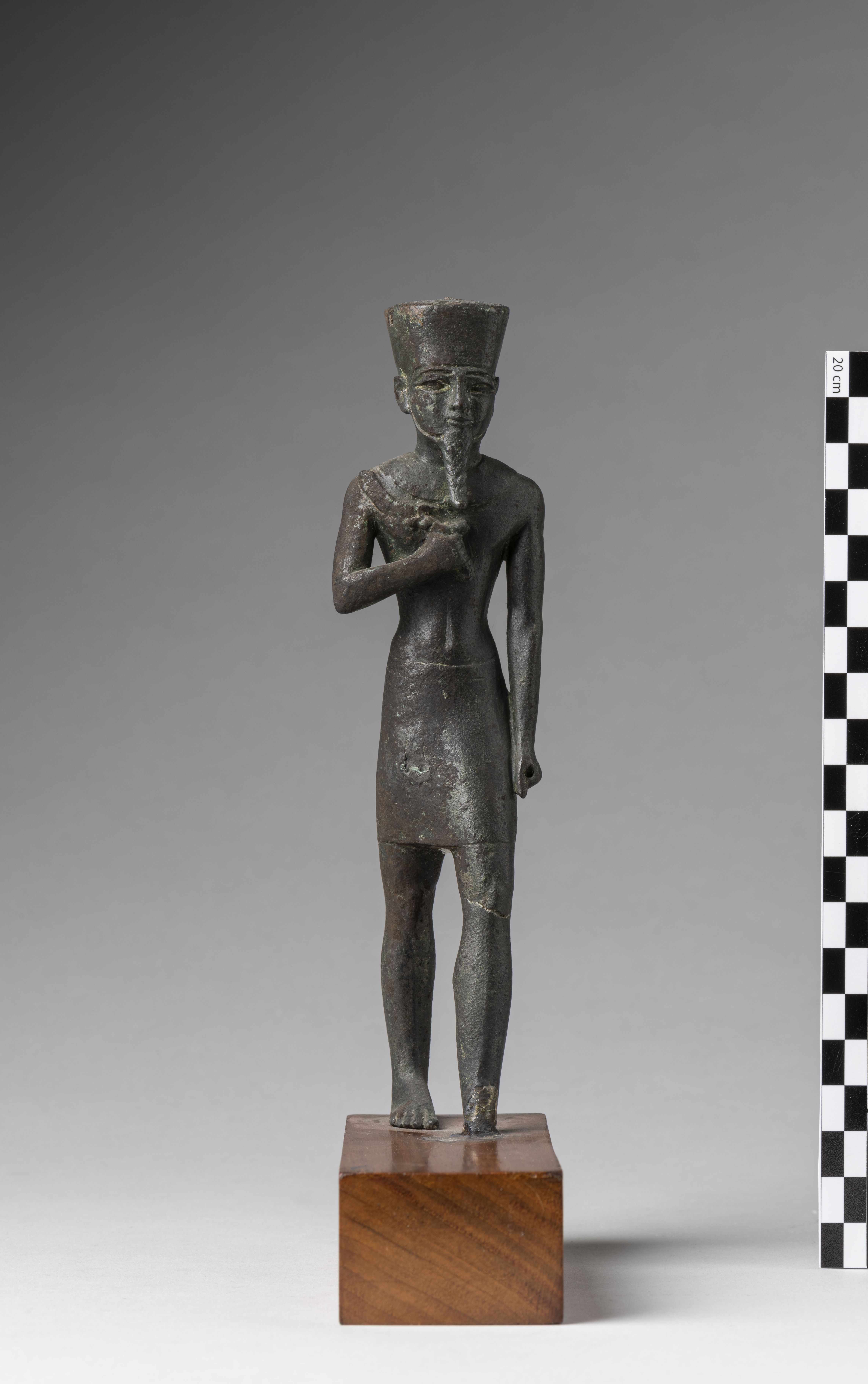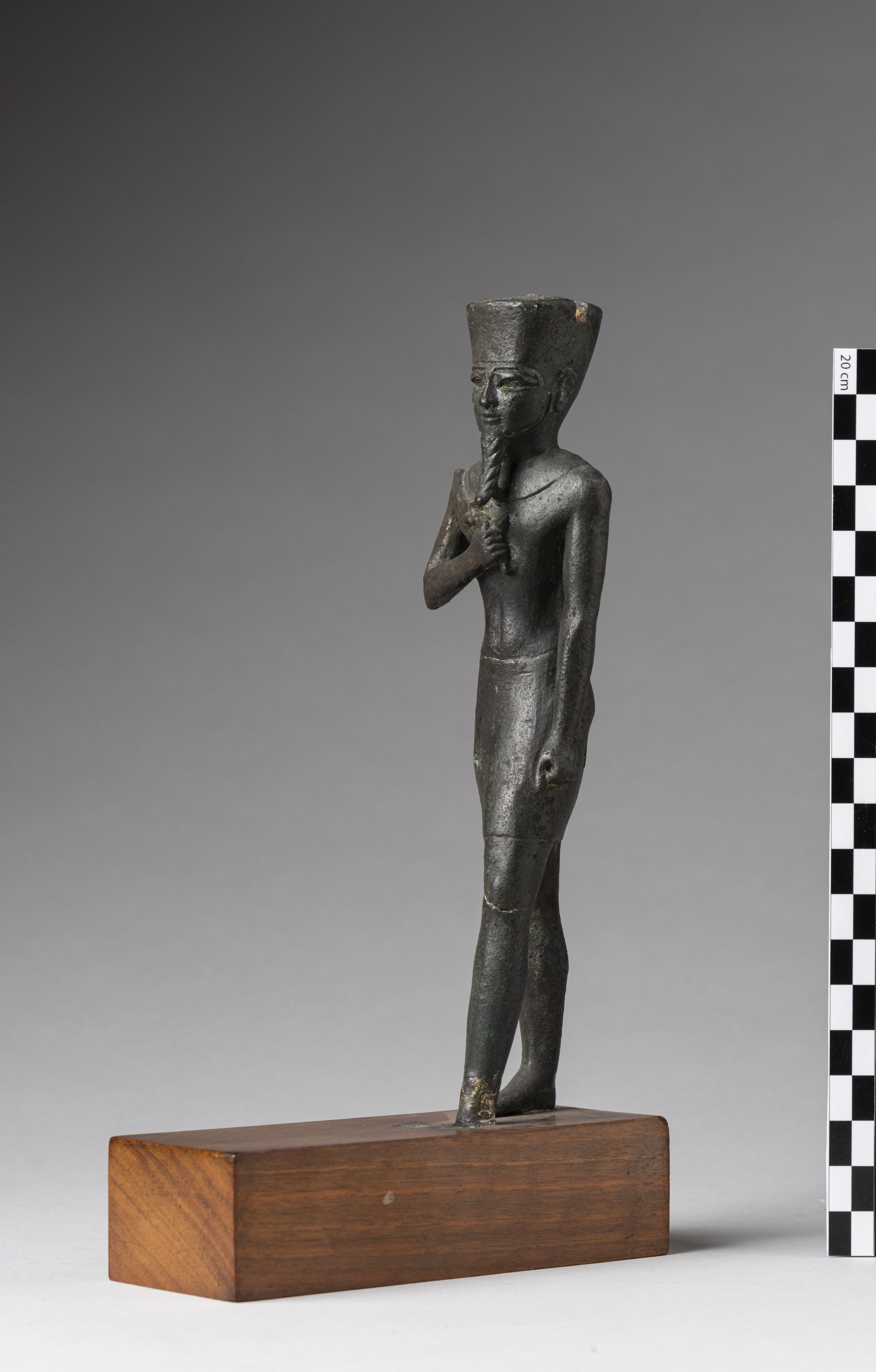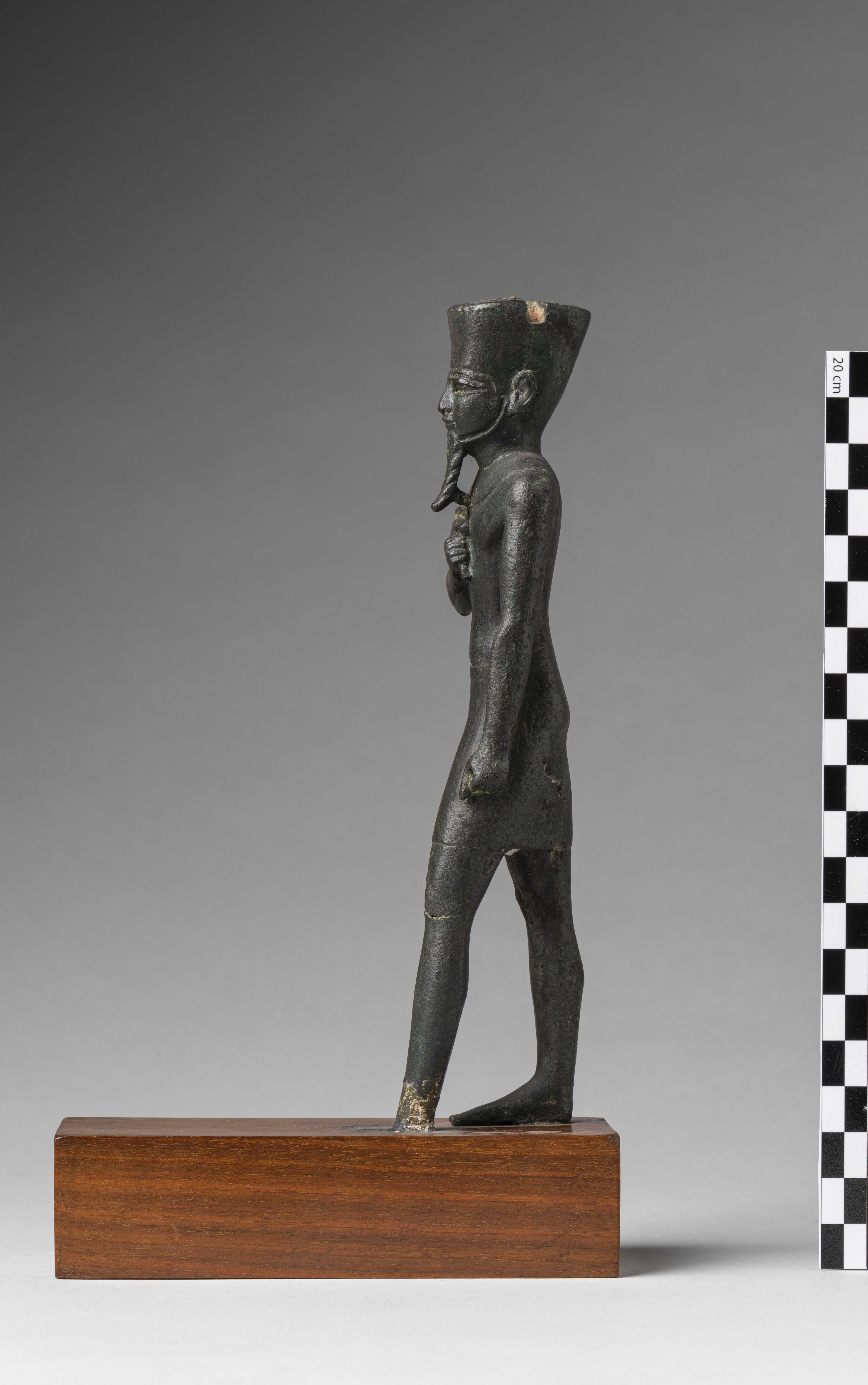 Standing figure of Amun, striding with left leg forward. The god is wearing a crown composed of a flat top headdress, similar to the base of the red crown, with a deep indentation on the top, probably to insert the now missing feathers. Amun has a false beard, decorated with a plaited pattern and connected to the upper chest through a bronze bar, with its tip bent outwards. The god is wearing a plain broad collar. Amun has his left arm at side with the hand clenched in a fist and with a hole, probably to hold a sceptre, which is now missing. The right arm is bent, and the hand on his chest is holding a scimitar. Amun is wearing a short plain apron type of skirt with a belt. The left foot is missing. The statuette is mounted on a modern wooden base. The object is made in the lost-wax technique for solid casts.