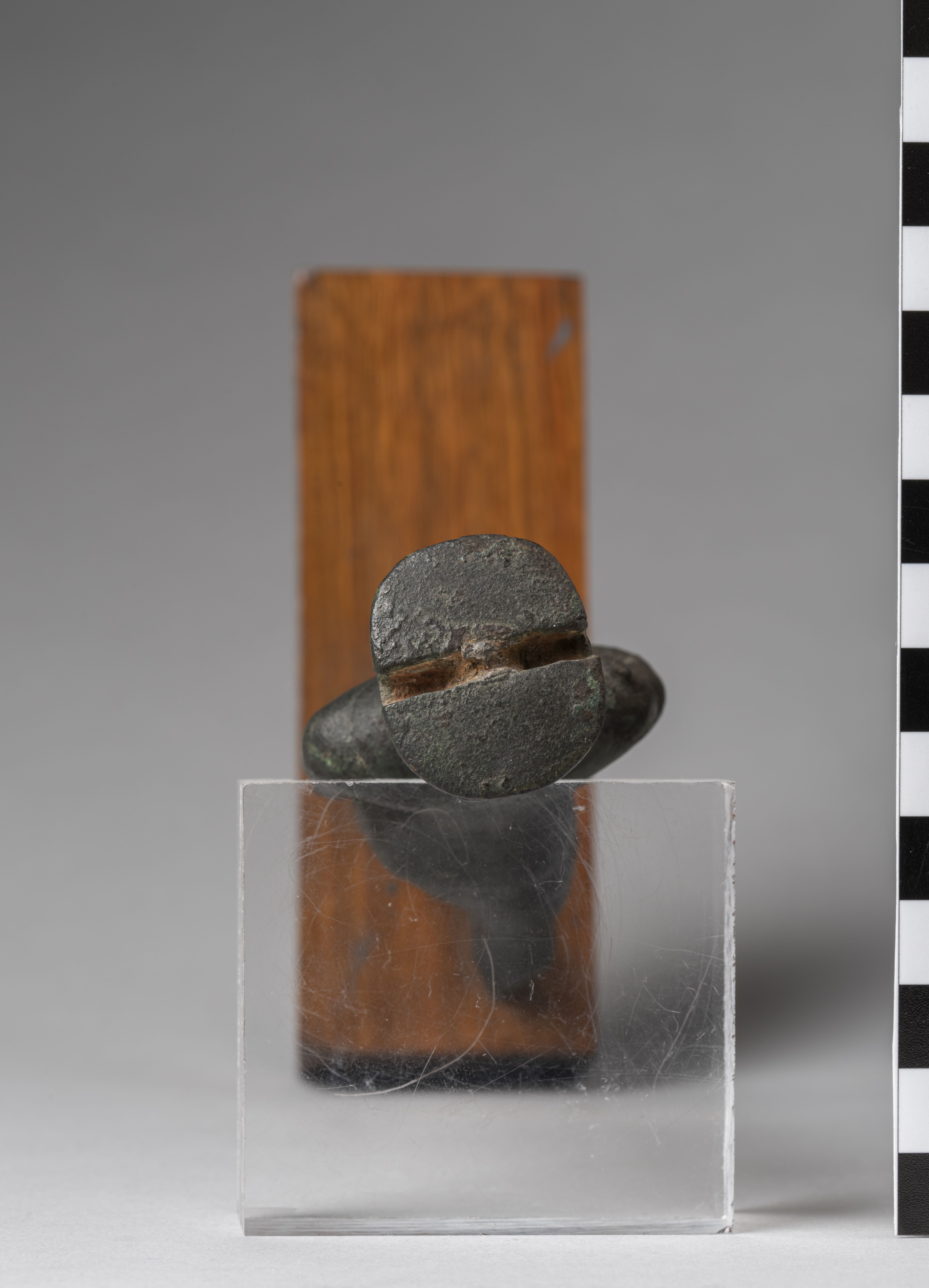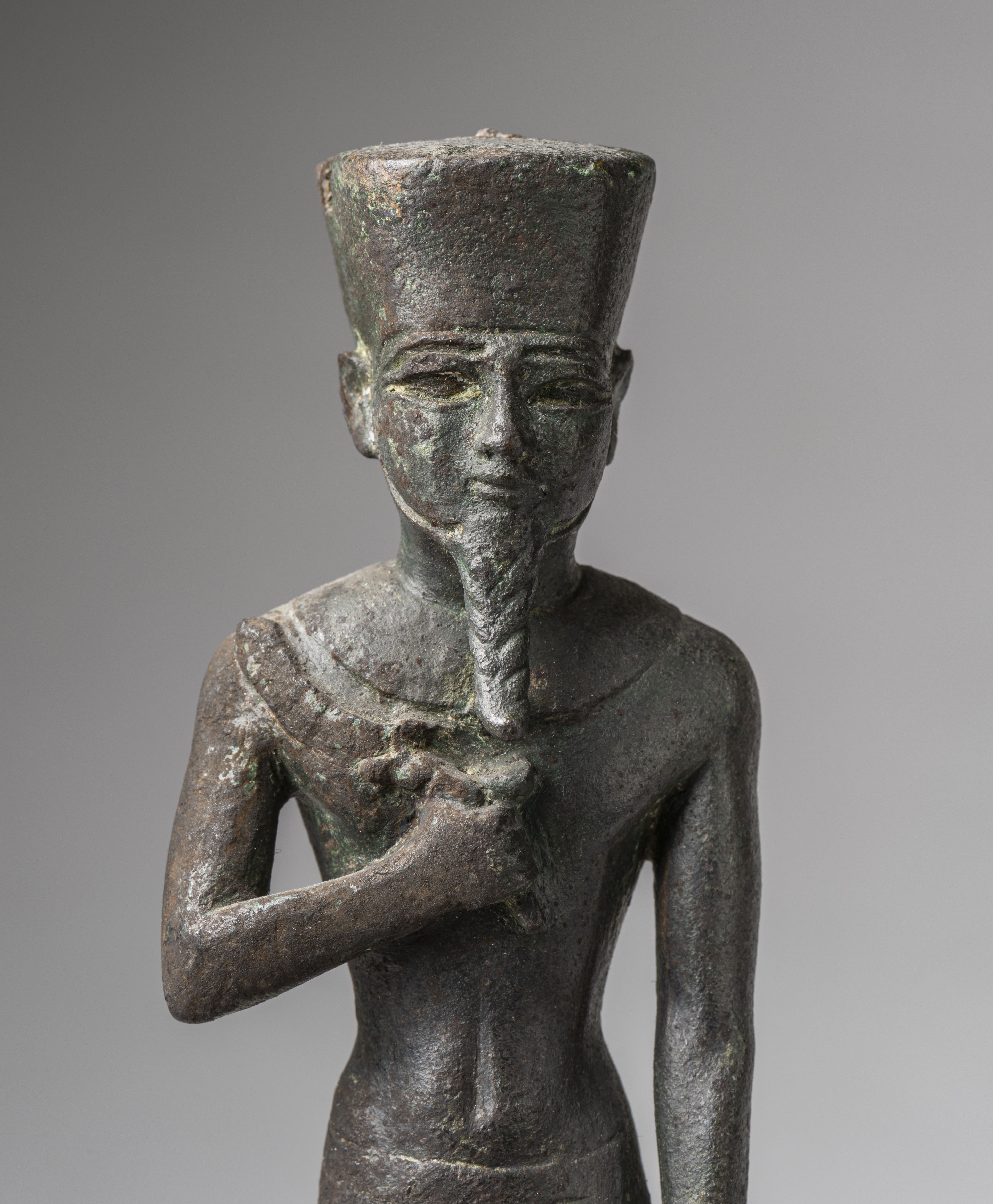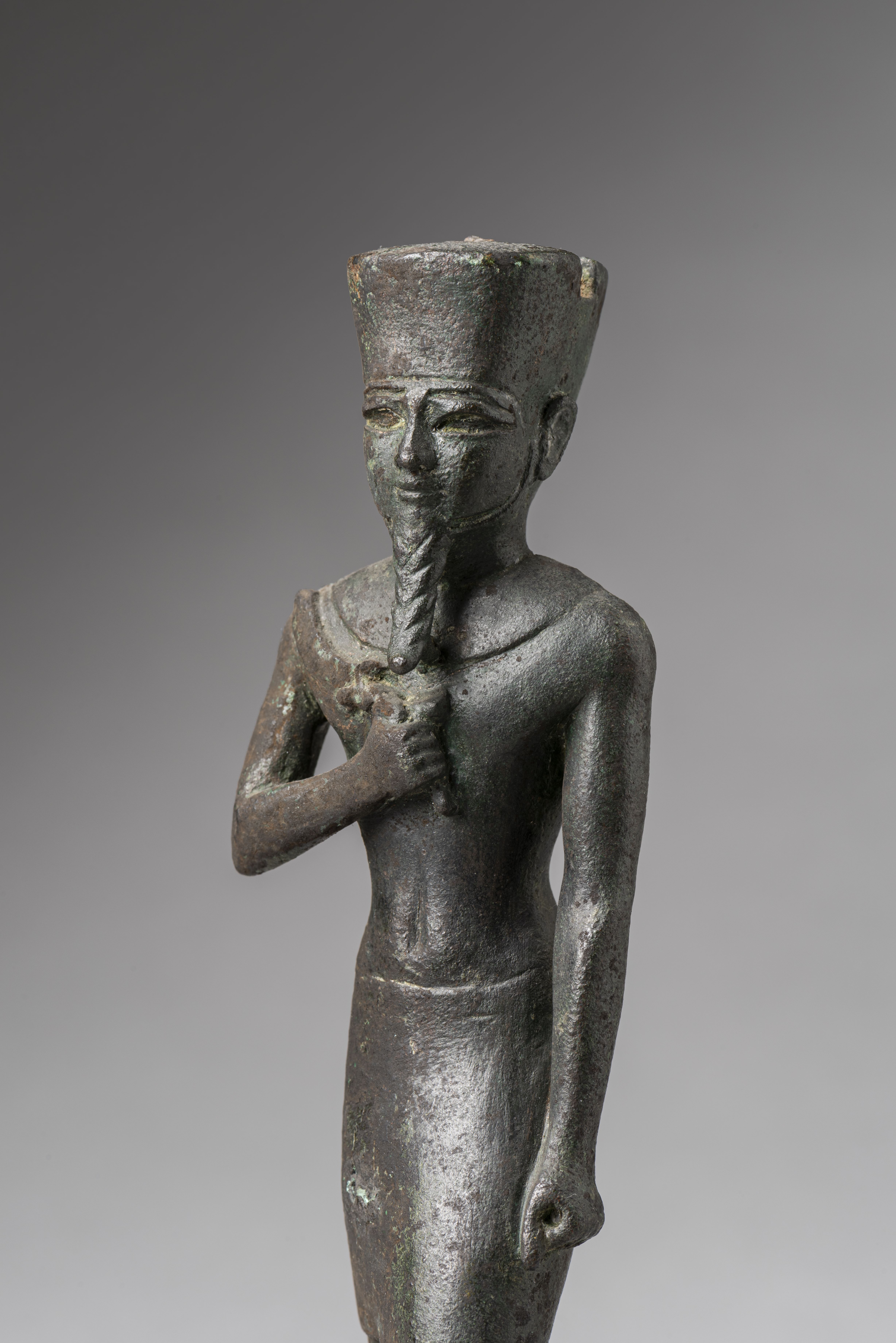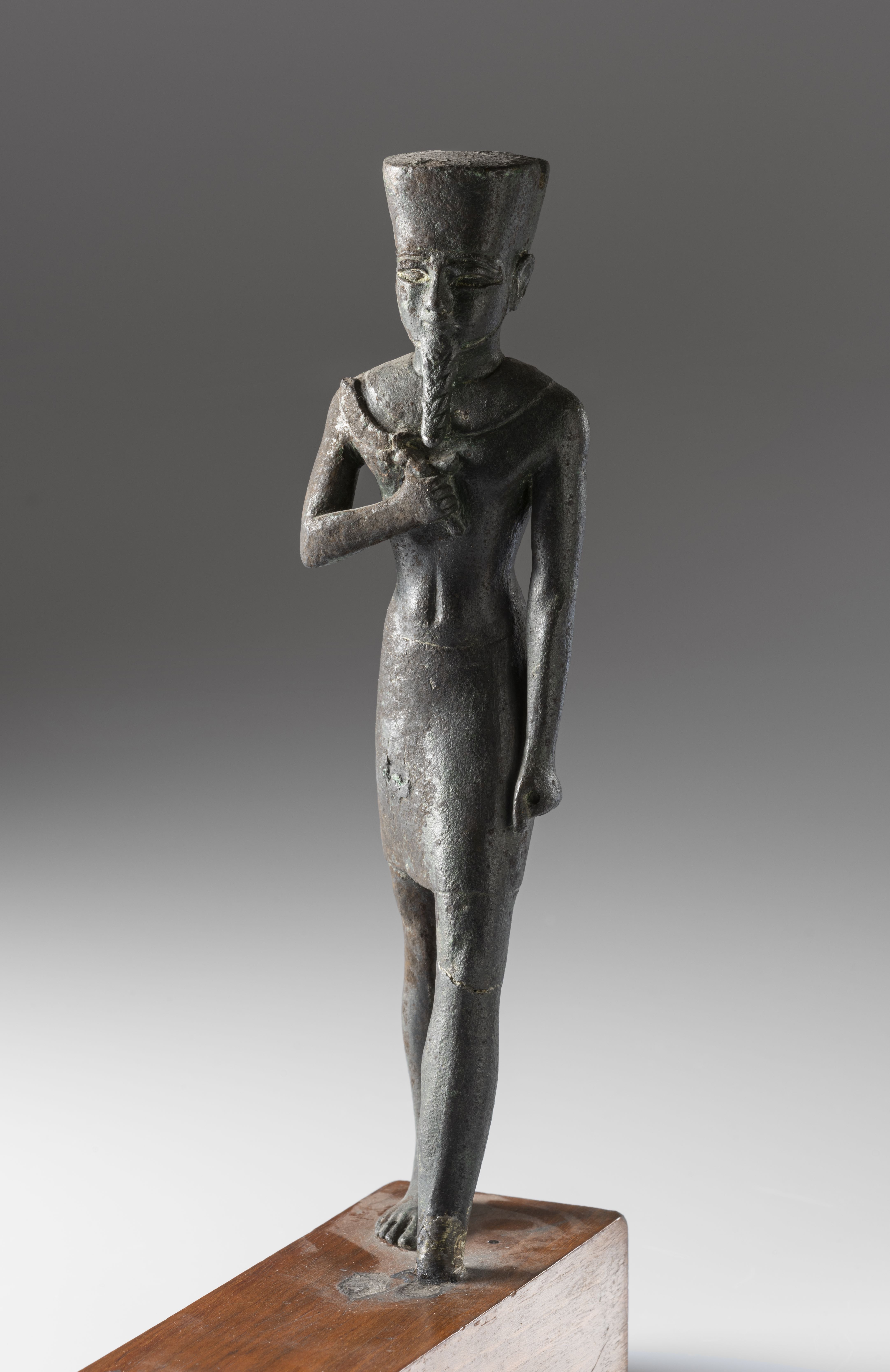 Standing figure of Amun, striding with left leg forward. The god is wearing a crown composed of a flat top headdress, similar to the base of the red crown, with a deep indentation on the top, probably to insert the now missing feathers. Amun has a false beard, decorated with a plaited pattern and connected to the upper chest through a bronze bar, with its tip bent outwards. The god is wearing a plain broad collar. Amun has his left arm at side with the hand clenched in a fist and with a hole, probably to hold a sceptre, which is now missing. The right arm is bent, and the hand on his chest is holding a scimitar. Amun is wearing a short plain apron type of skirt with a belt. The left foot is missing. The statuette is mounted on a modern wooden base. The object is made in the lost-wax technique for solid casts.