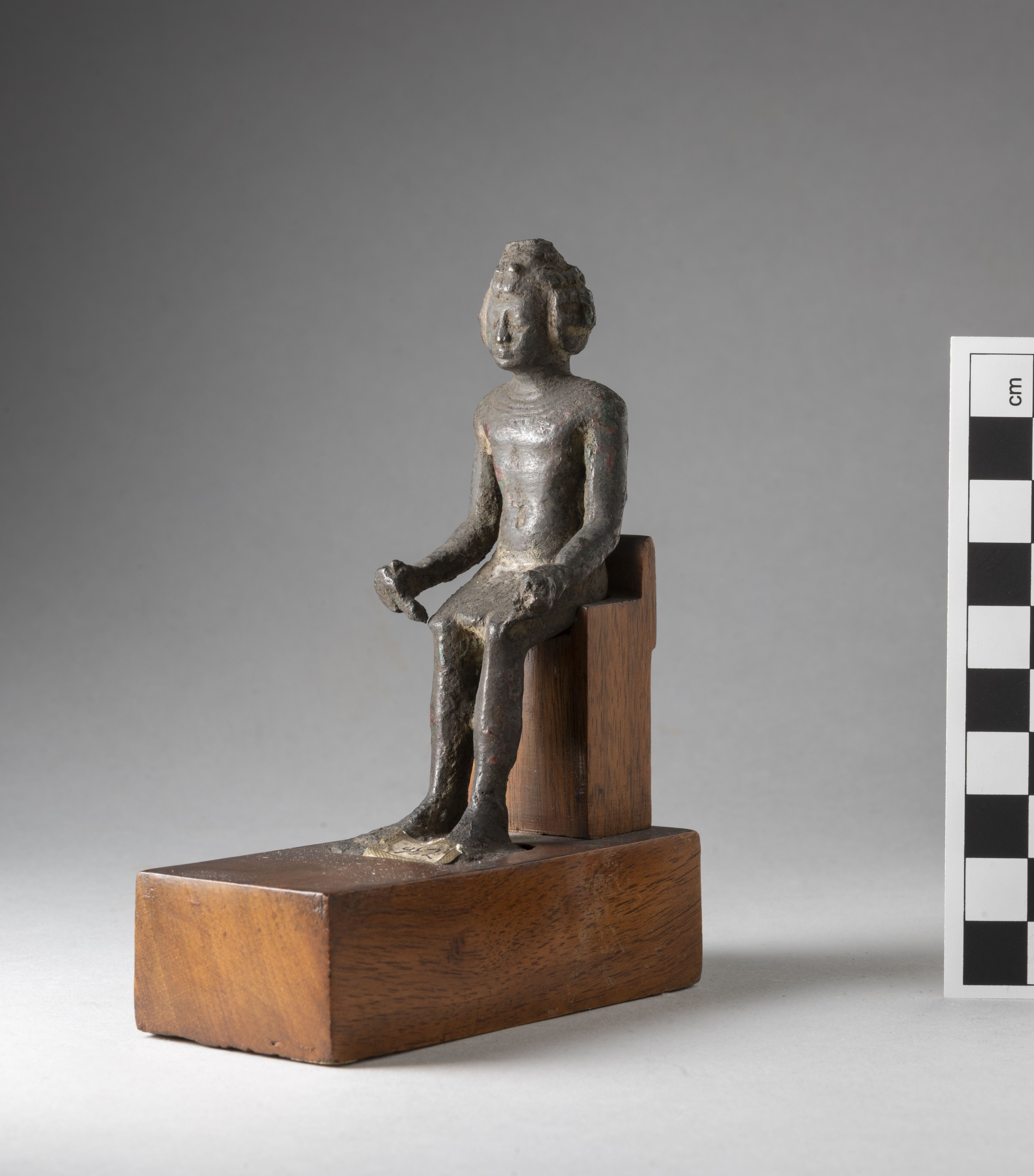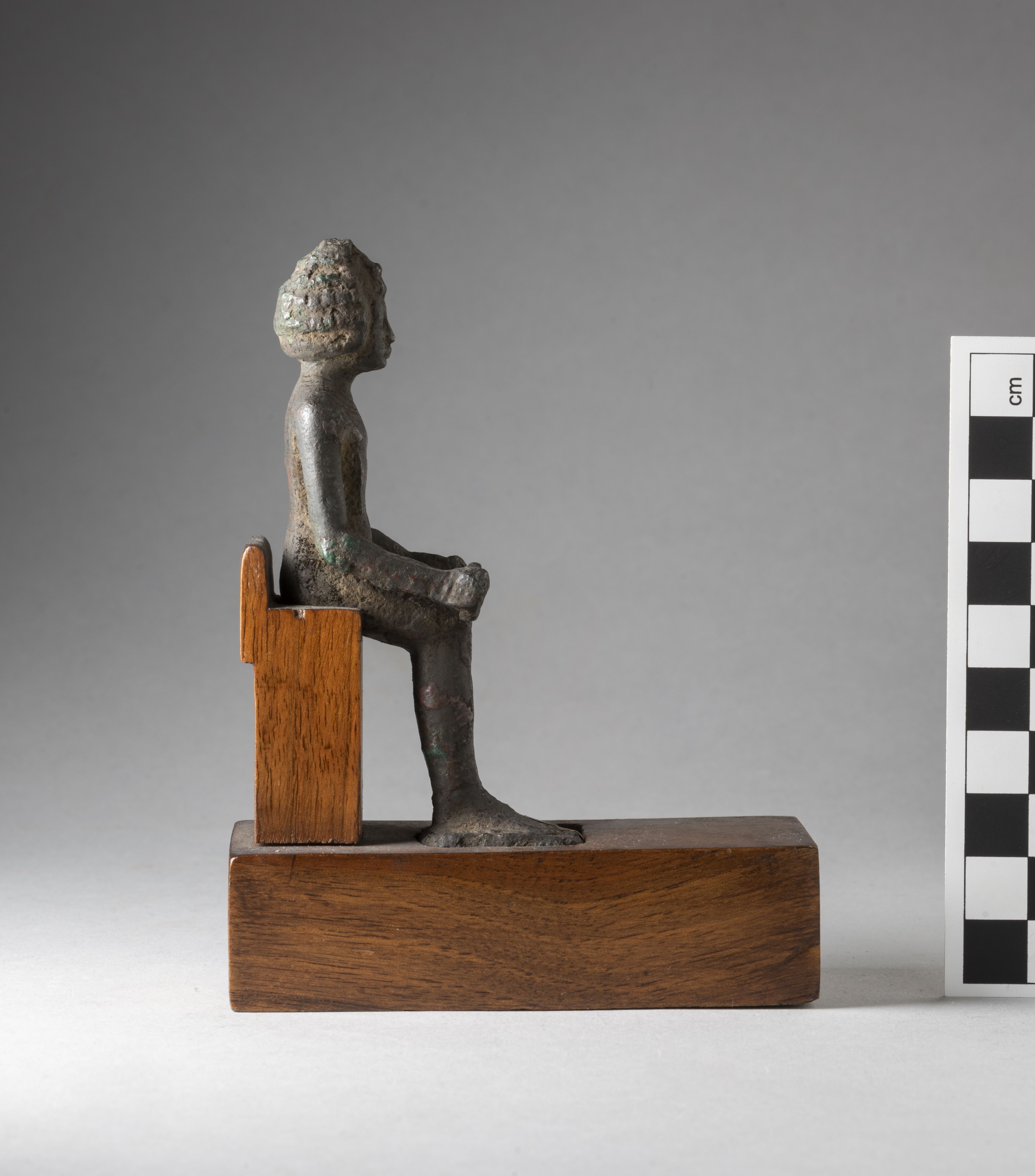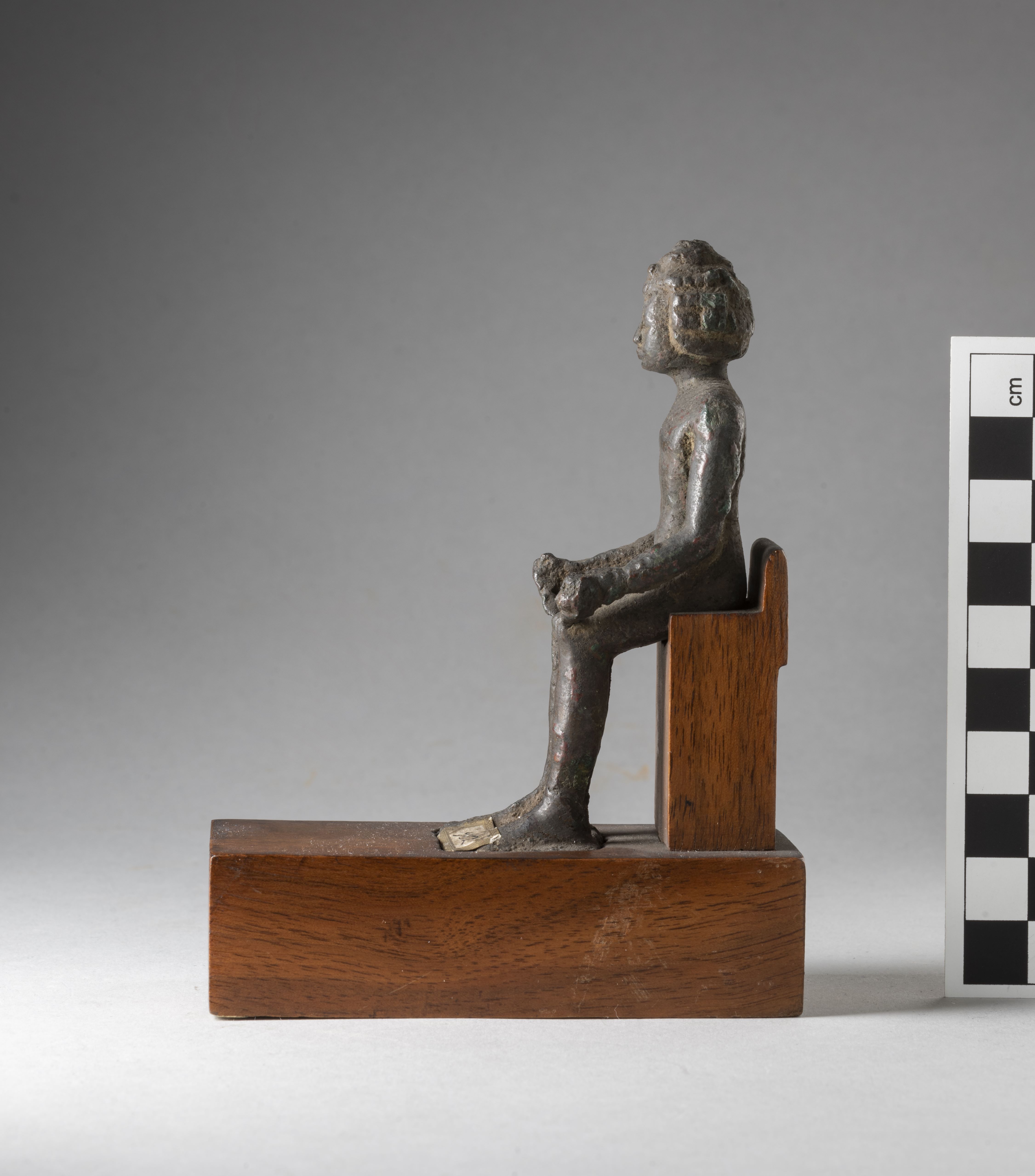 Figure of a seated Kushite king. The king had a headdress, now broken, and is wearing a curled wig consisting of 4 rows of curls and decorated with the typical two uraei. The face is rather square, the facial features are stylised, the mouth is straight and in relief. The king has his arms bent forward and detached from his body, his hands clenched into fists, the hands are connected to the legs by two bronze elements, the right one not connecting completely to the knee. The king wears a collar consisting of three plain registers and pendants in the form of dots. The king wears a kilt, a belt, and a decoration with vertical streaks is visible at its back. The feet rest on a square base. The statuette is mounted on a modern wooden base. The object is made in the lost-wax technique for solid casts.