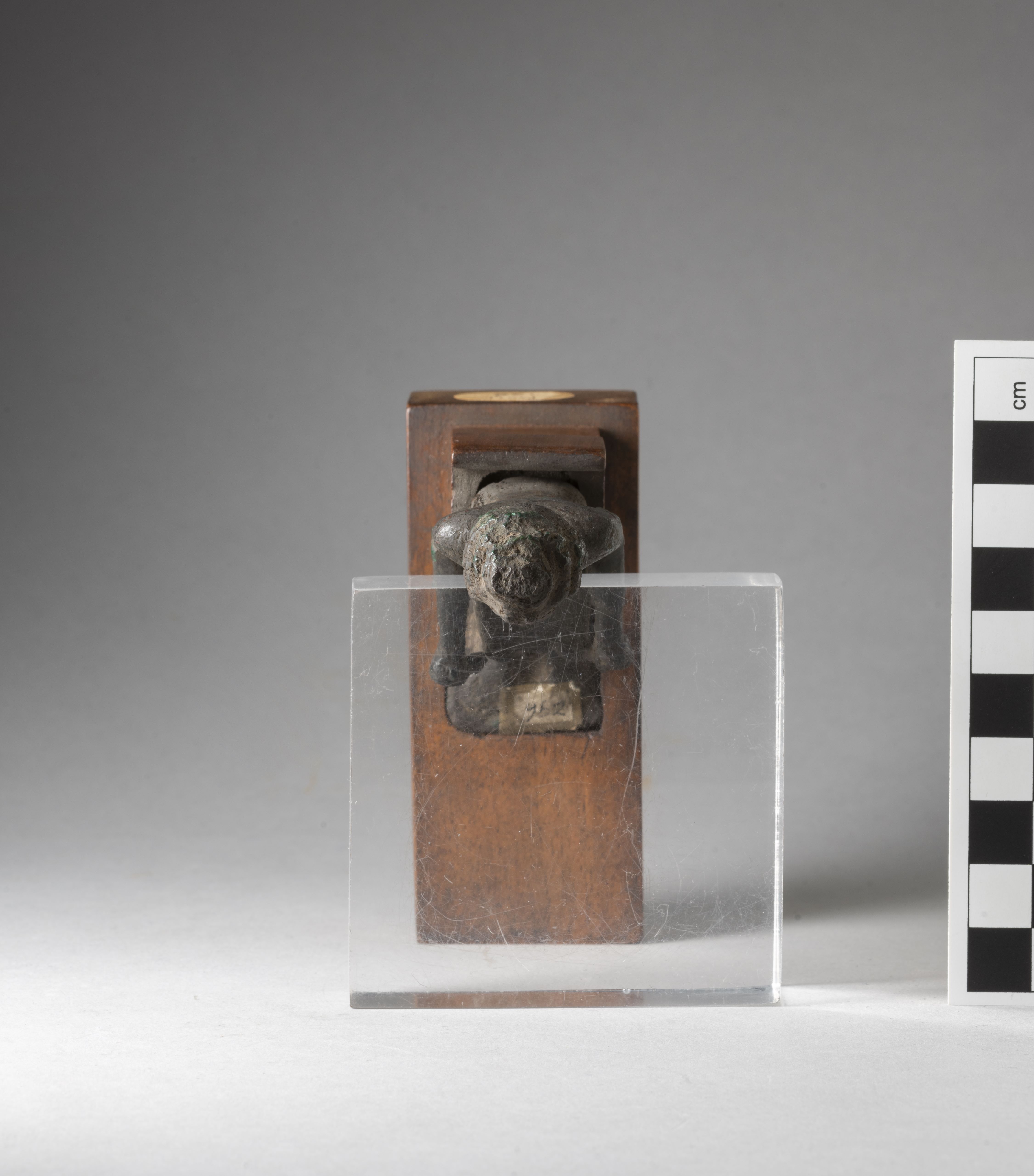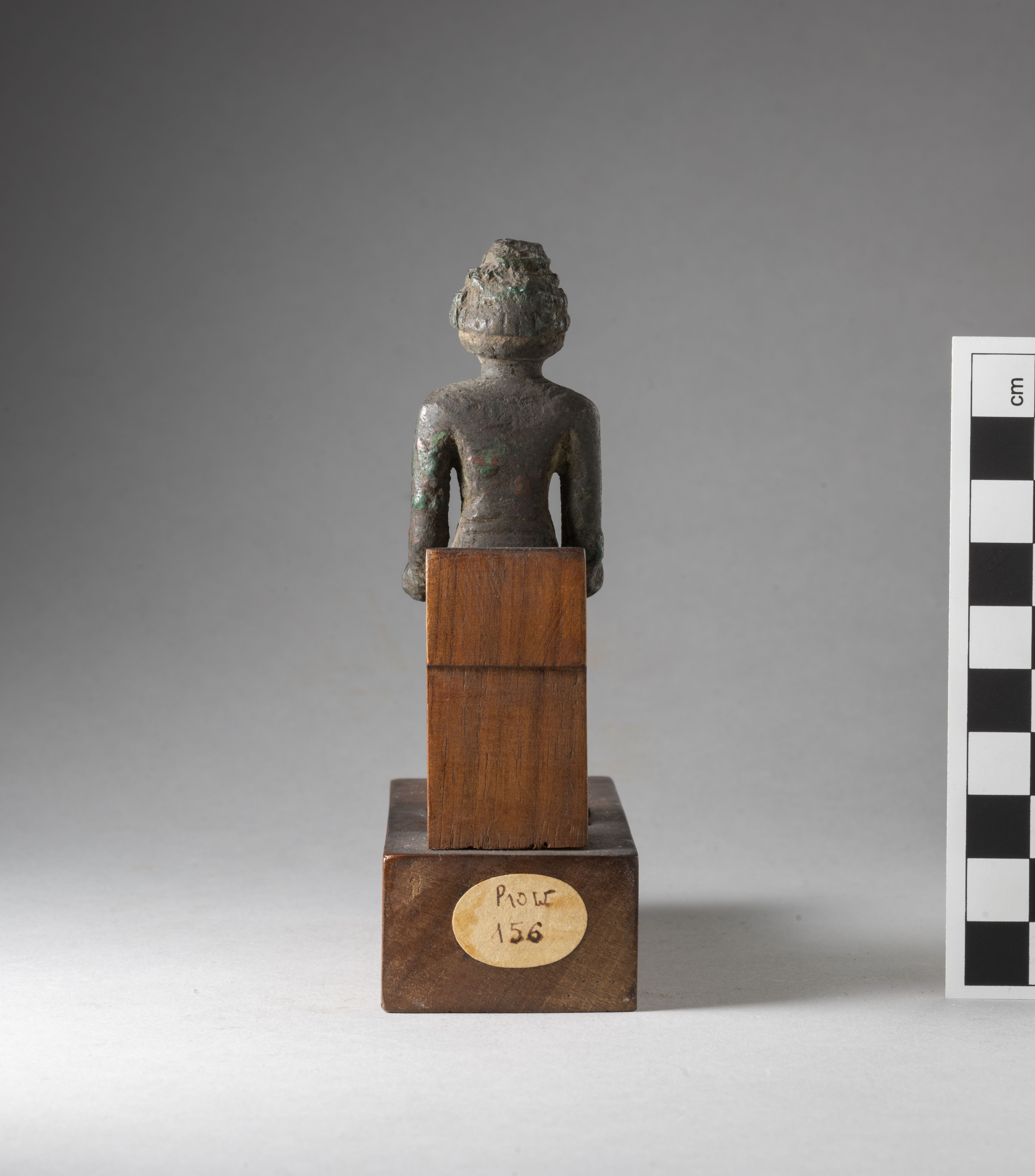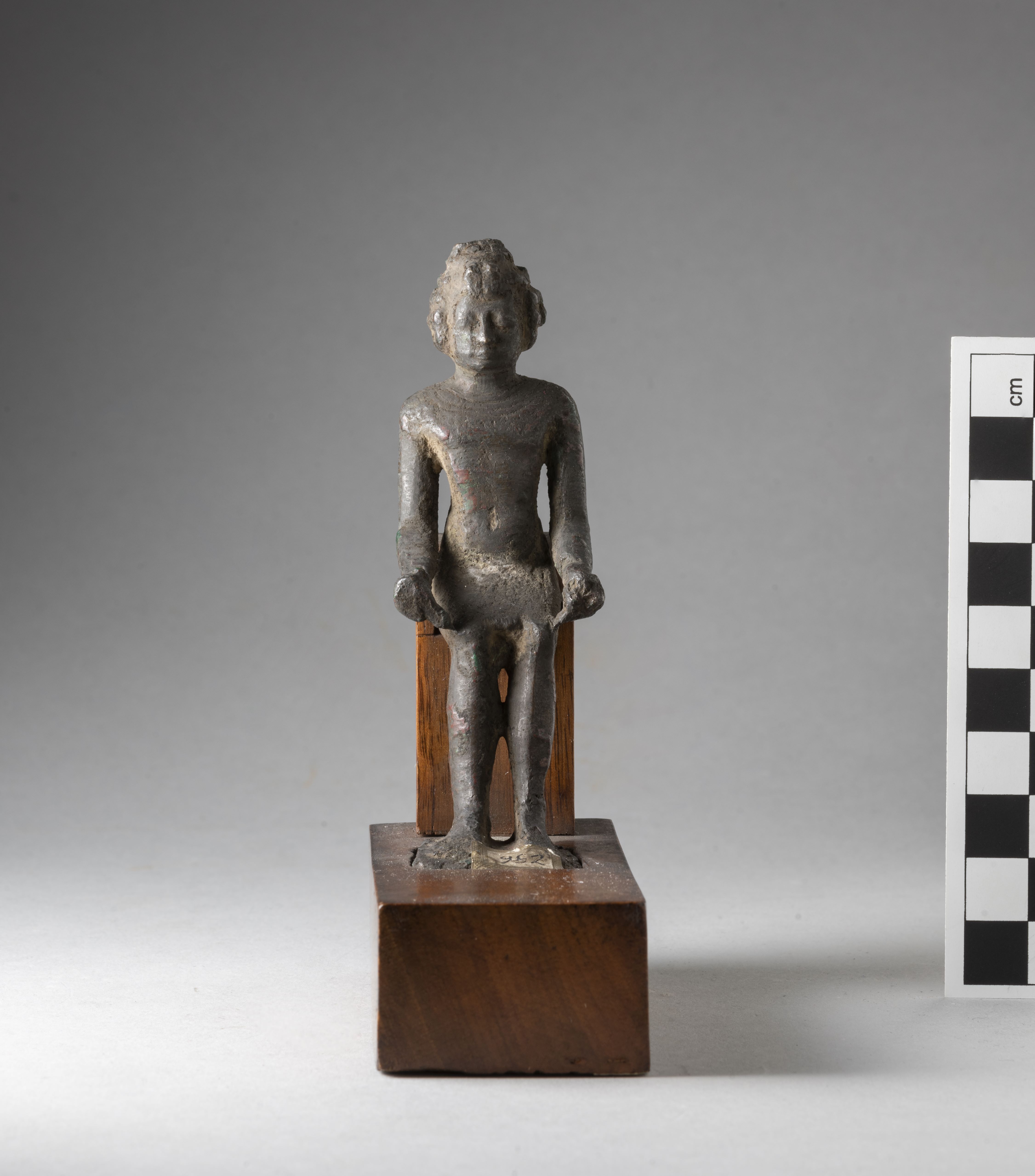 Figure of a seated Kushite king. The king had a headdress, now broken, and is wearing a curled wig consisting of 4 rows of curls and decorated with the typical two uraei. The face is rather square, the facial features are stylised, the mouth is straight and in relief. The king has his arms bent forward and detached from his body, his hands clenched into fists, the hands are connected to the legs by two bronze elements, the right one not connecting completely to the knee. The king wears a collar consisting of three plain registers and pendants in the form of dots. The king wears a kilt, a belt, and a decoration with vertical streaks is visible at its back. The feet rest on a square base. The statuette is mounted on a modern wooden base. The object is made in the lost-wax technique for solid casts.