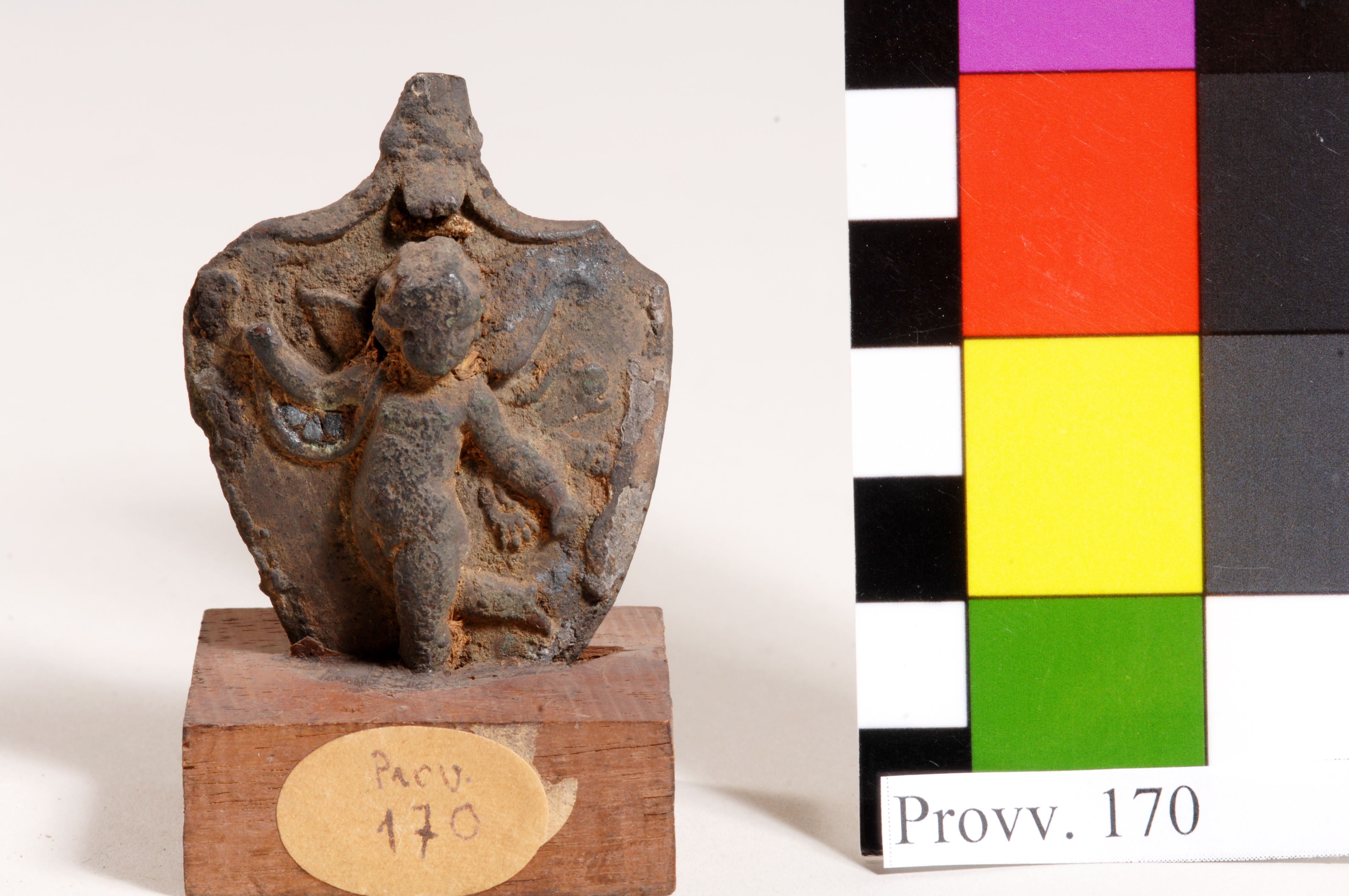 Decorative plaque with a depiction of a winged child. The plaque has an apex and is shield-shaped. A winged, naked child is depicted in the centre, he has curled hair, small wings protrude from his shoulders, his arms are open, the right one stretching upwards and the left downwards. A festoon is woven around the arms. The figure slightly tends to the right, the right leg is bent behind the left. The plaque is mounted on a modern wooden base. The object is made in the lost-wax technique for solid casts.