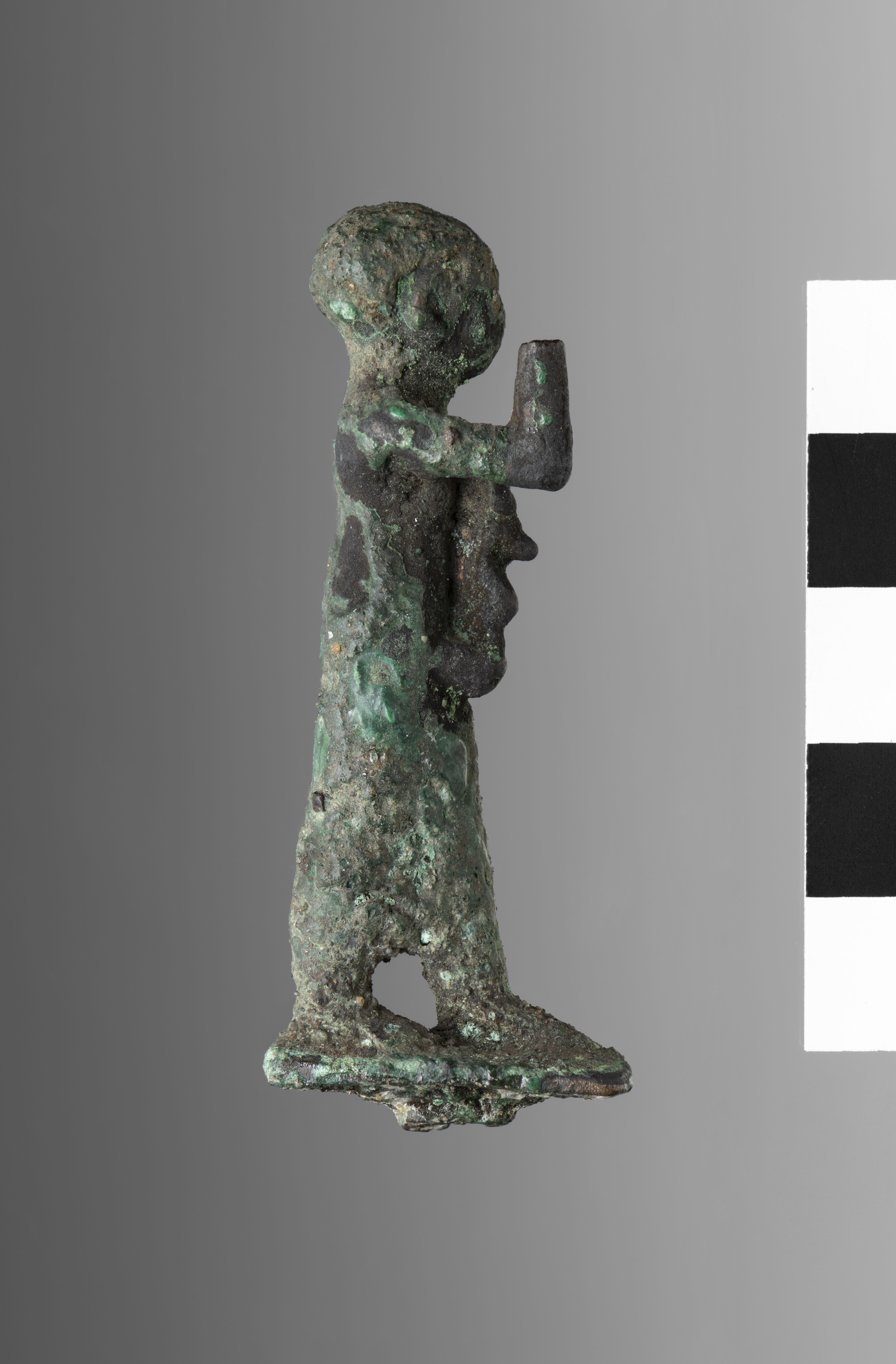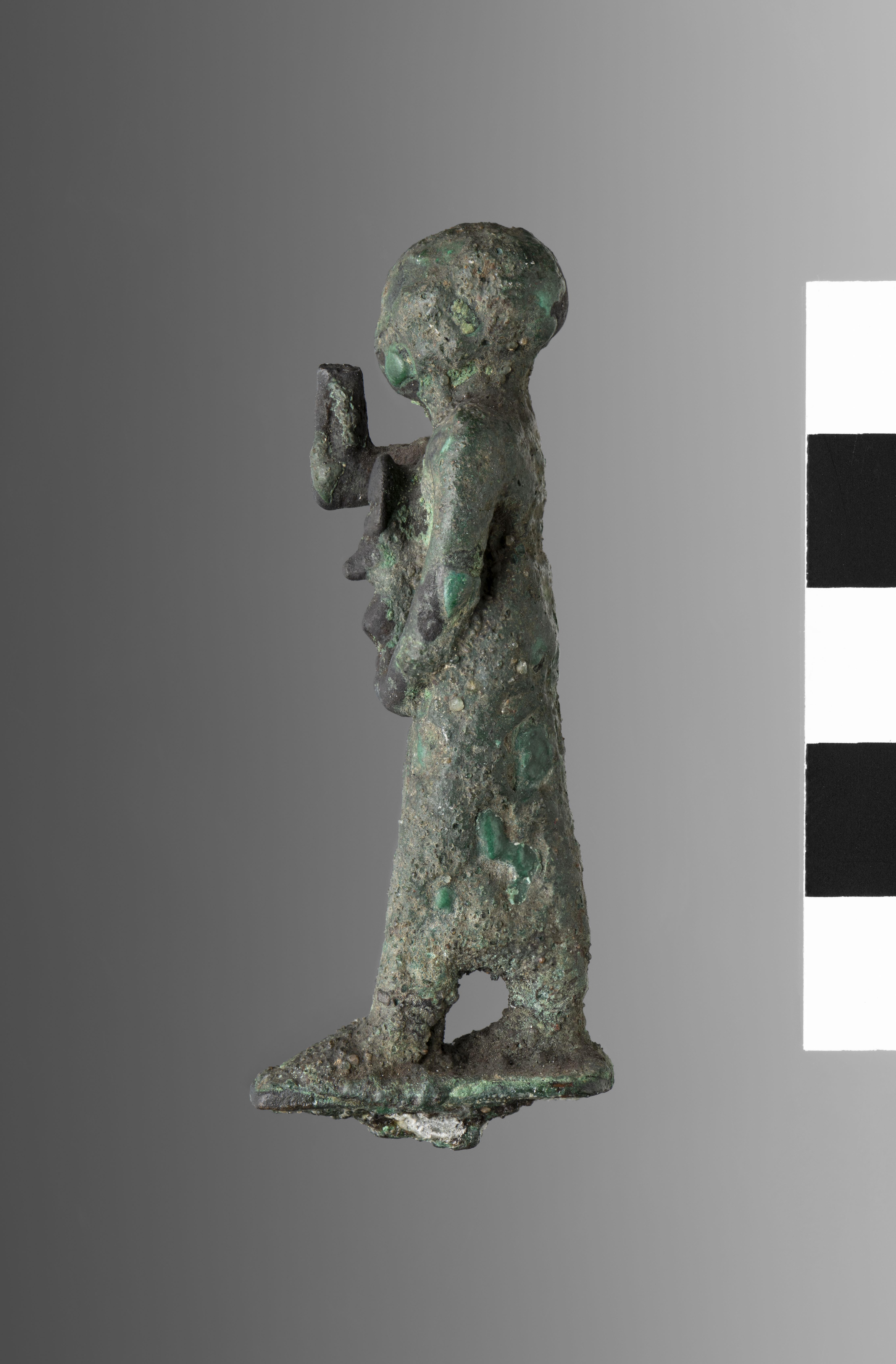 Standing figure of a priest, striding with left leg forward and holding a baboon figure. The priest’s head is shaven, the facial features are not visible because of corrosion. The right arm is raised and bent, forming a straight angle, the hand is missing. The left arm is along the body and the hand is holding the figure of a squatting baboon, crowned with a moon disk resting on the crescent moon. The priest is wearing an ankle-length garment. The feet rest on a rectangular base, from which a broken square tenon projects down. The object is made in the lost-wax technique for solid casts.