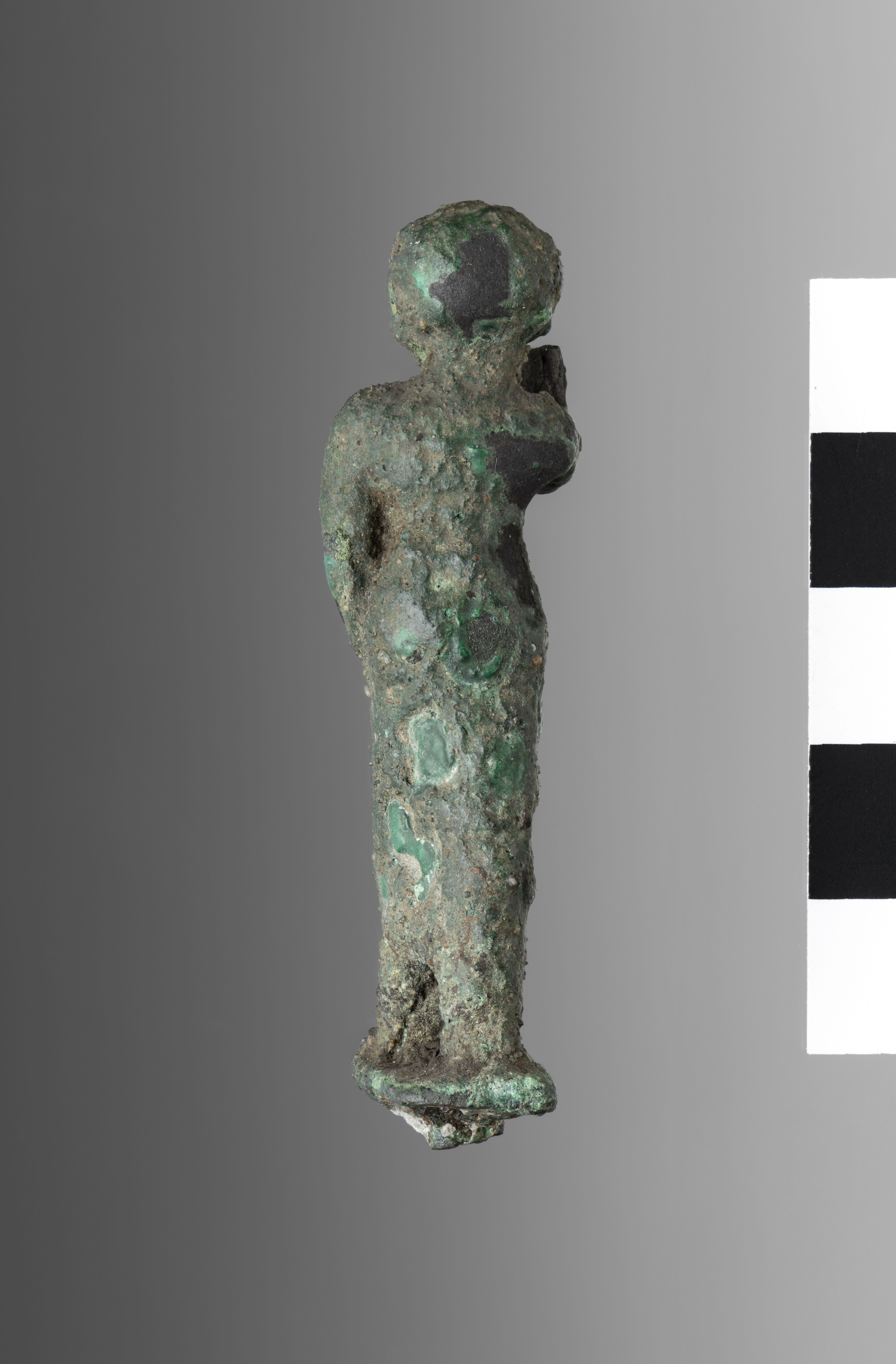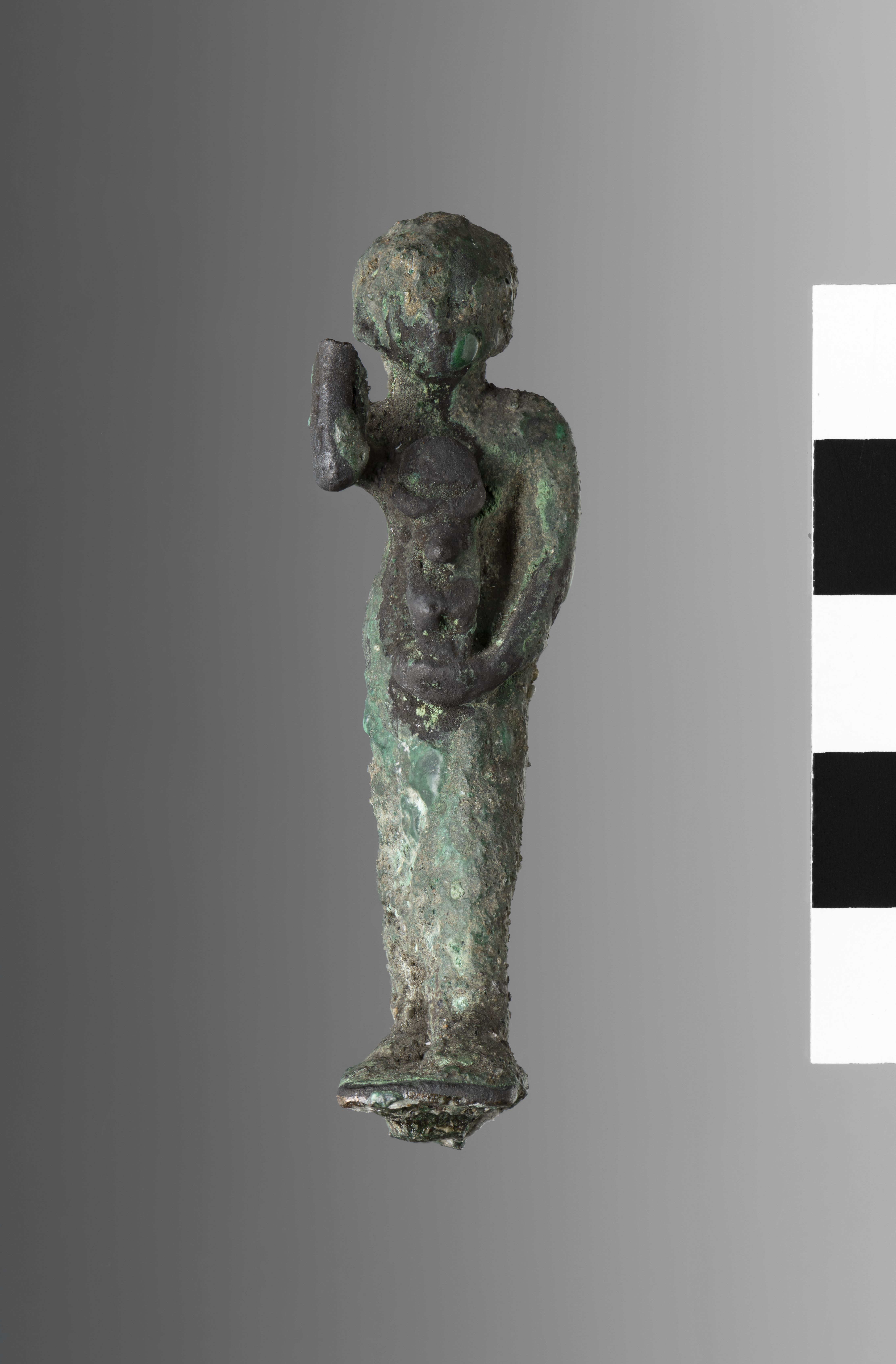 Standing figure of a priest, striding with left leg forward and holding a baboon figure. The priest’s head is shaven, the facial features are not visible because of corrosion. The right arm is raised and bent, forming a straight angle, the hand is missing. The left arm is along the body and the hand is holding the figure of a squatting baboon, crowned with a moon disk resting on the crescent moon. The priest is wearing an ankle-length garment. The feet rest on a rectangular base, from which a broken square tenon projects down. The object is made in the lost-wax technique for solid casts.