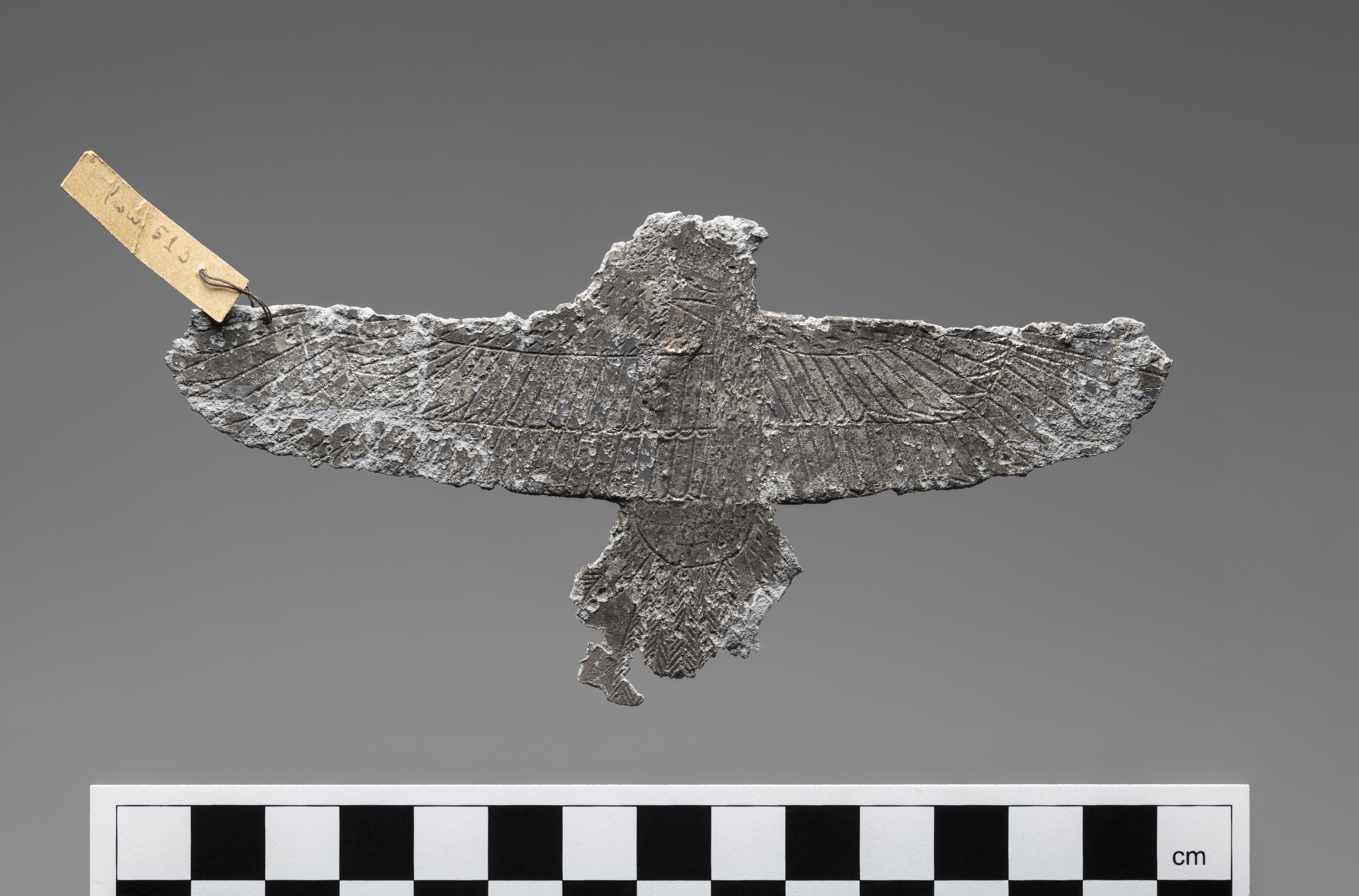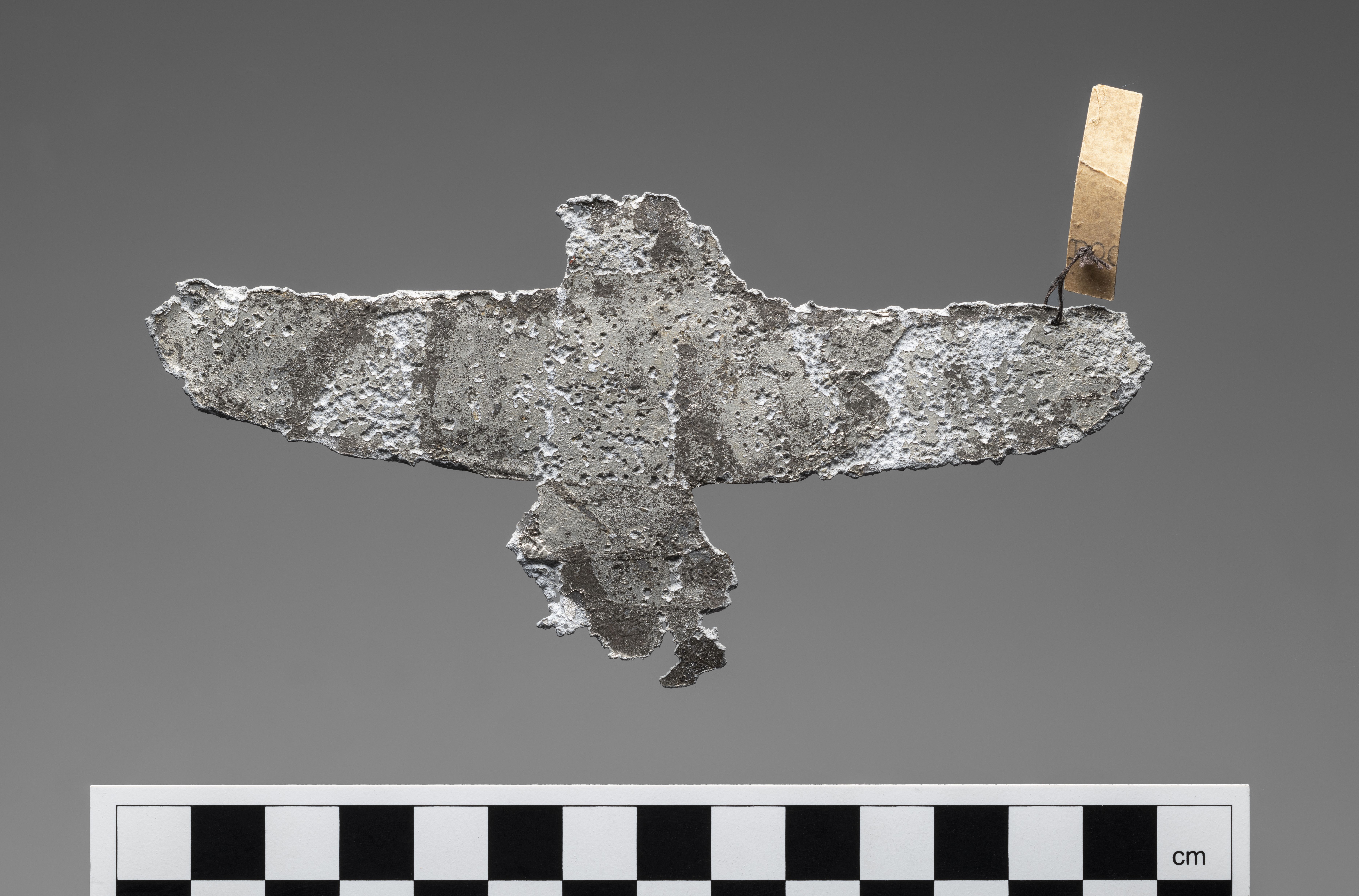 Pectoral in the shape of a falcon with outspread wings. Probably made from a lead sheet. The head is decorated with small notches, while the wings are detailed with two rows of feathers. Feather details on the tail are rendered in a herringbone incised pattern.