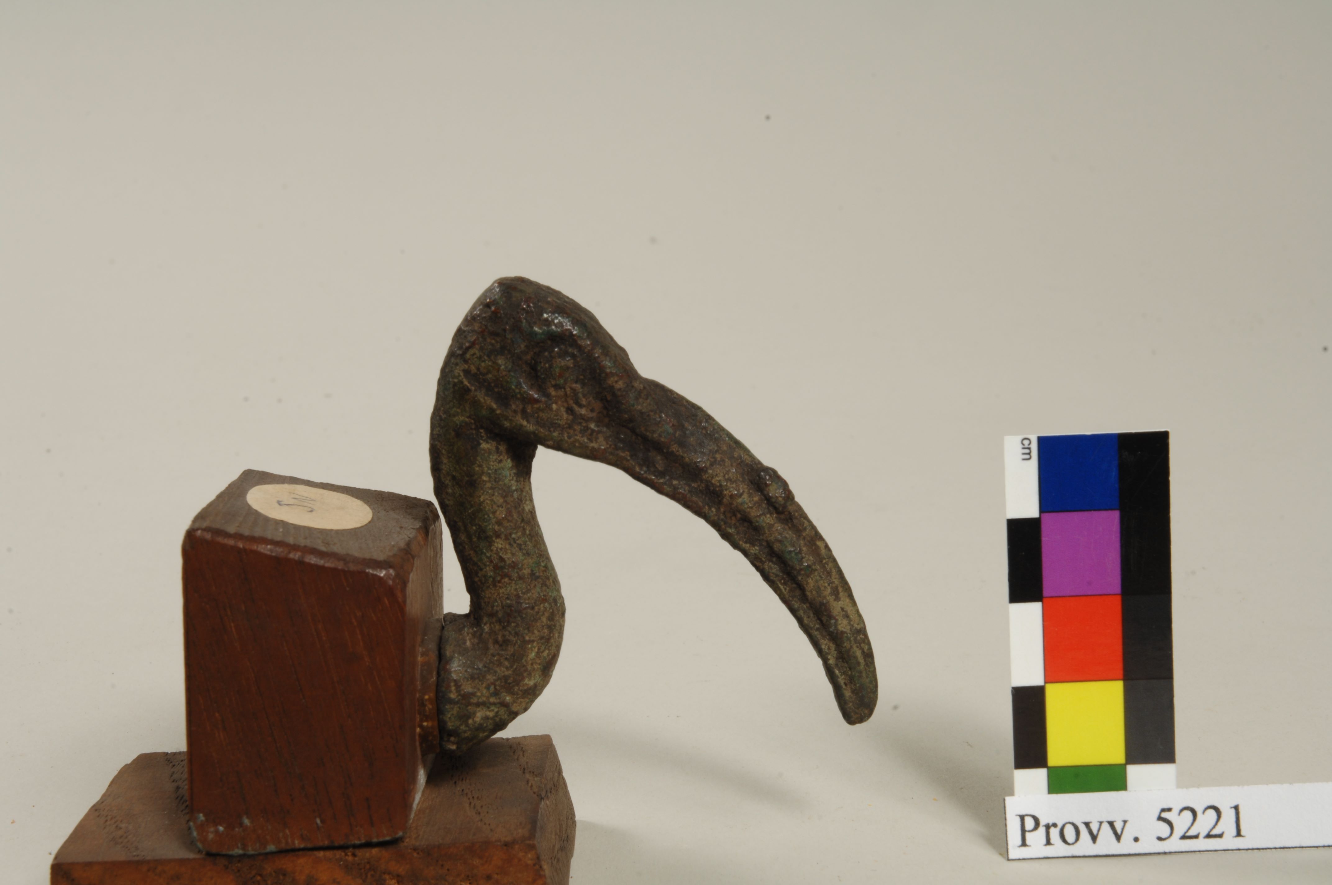 Head of an ibis, probably part of a statuette in bronze or other material. The eyebrow ridges are raised, the eyes are lateral, the beak is curved downwards and with an incised line on each side. The neck is sinuous, and terminates with a square tenon. The object is made in the lost-wax technique for solid casts.